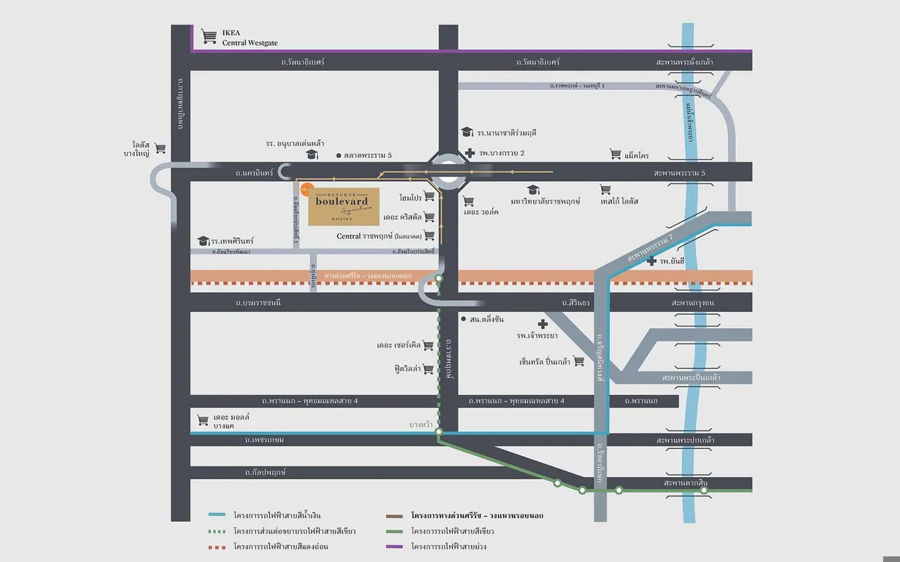 การเดินทาง รถไฟฟ้าสายสีแดงรถไฟฟ้าสายสีชมพูทางด่วนศรีรัช(ด่านศรีสมาน,ด่านบางพูน) ทำเลที่ตั้ง ถ.ติวานนท์ บ้านกลาง เมืองปทุมธานี จ.ปทุมธานี 12000 สิ่งอำนวยความสะดวกรอบโครงการ