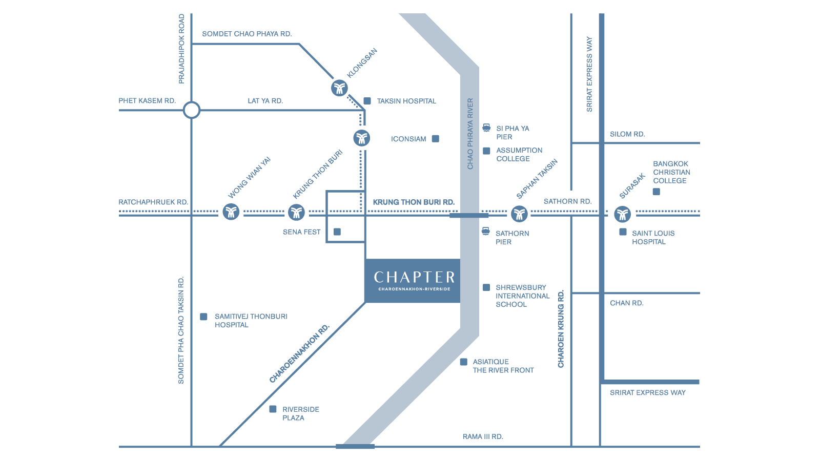 "โครงการ แชปเตอร์ เจริญนคร-ริเวอร์ไซด์ (CHAPTER Charoennakhorn-Riverside) The inseparable connection between river and humans inspires our design. The concept of “Minimal Lux” integrating the Chao Phraya River and the discerning residents is visible in every aspect. Soothing flows of the curvy waterway is reflected in the architectural design, from the façade to the residential buildings and site orientation unveiling the best river panorama."