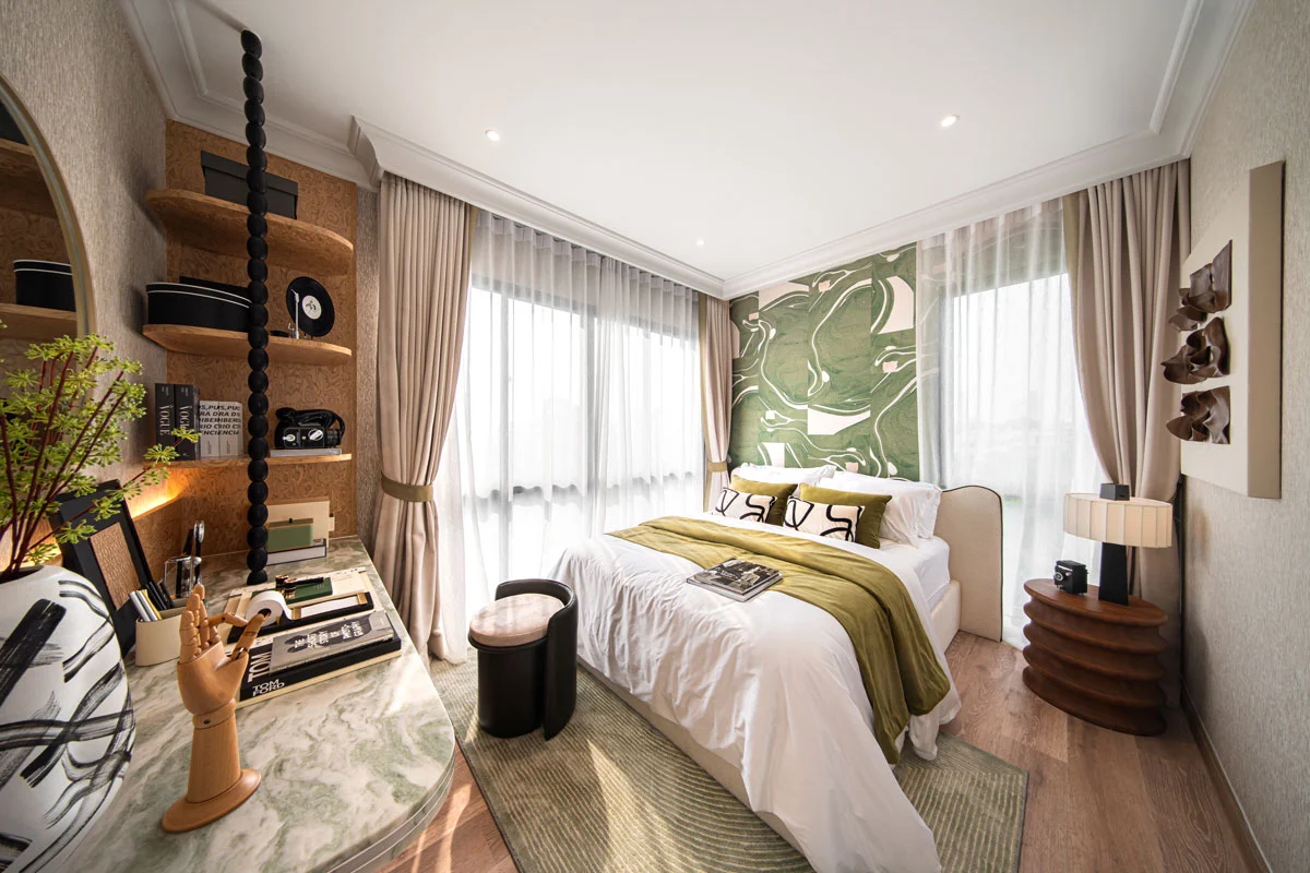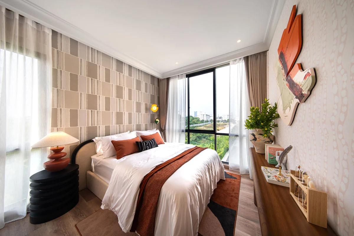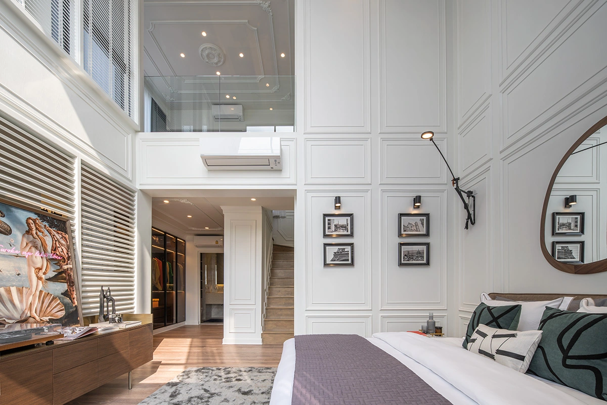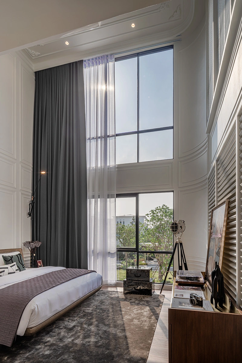 Master Bedroom เมื่อเข้ามาถึง ซ้ายมือจะเป็นพื้นที่หน้าบ้าน ได้บานกระจกขนาดใหญ่มาเต็มที่เลยค่ะ มีระเบียงขนาดใหญ่ให้ได้ออกไปใช้งานด้วย สามารถทำเป็นมุมพั