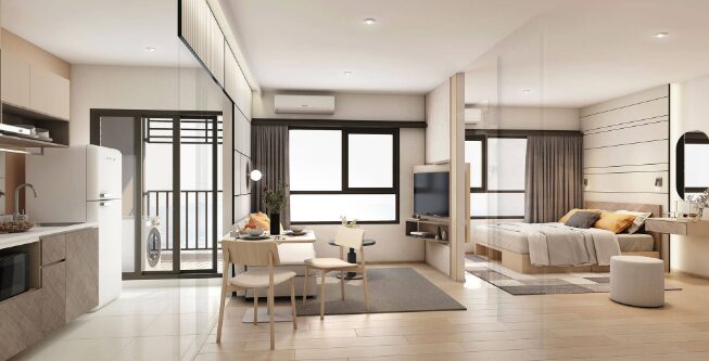 ขนาดพื้นที่ใช้สอย 28 ตร.ม. จำนวนห้องนอน 1 ห้องนอน จำนวนห้องน้ำ 1 ห้องน้ำ