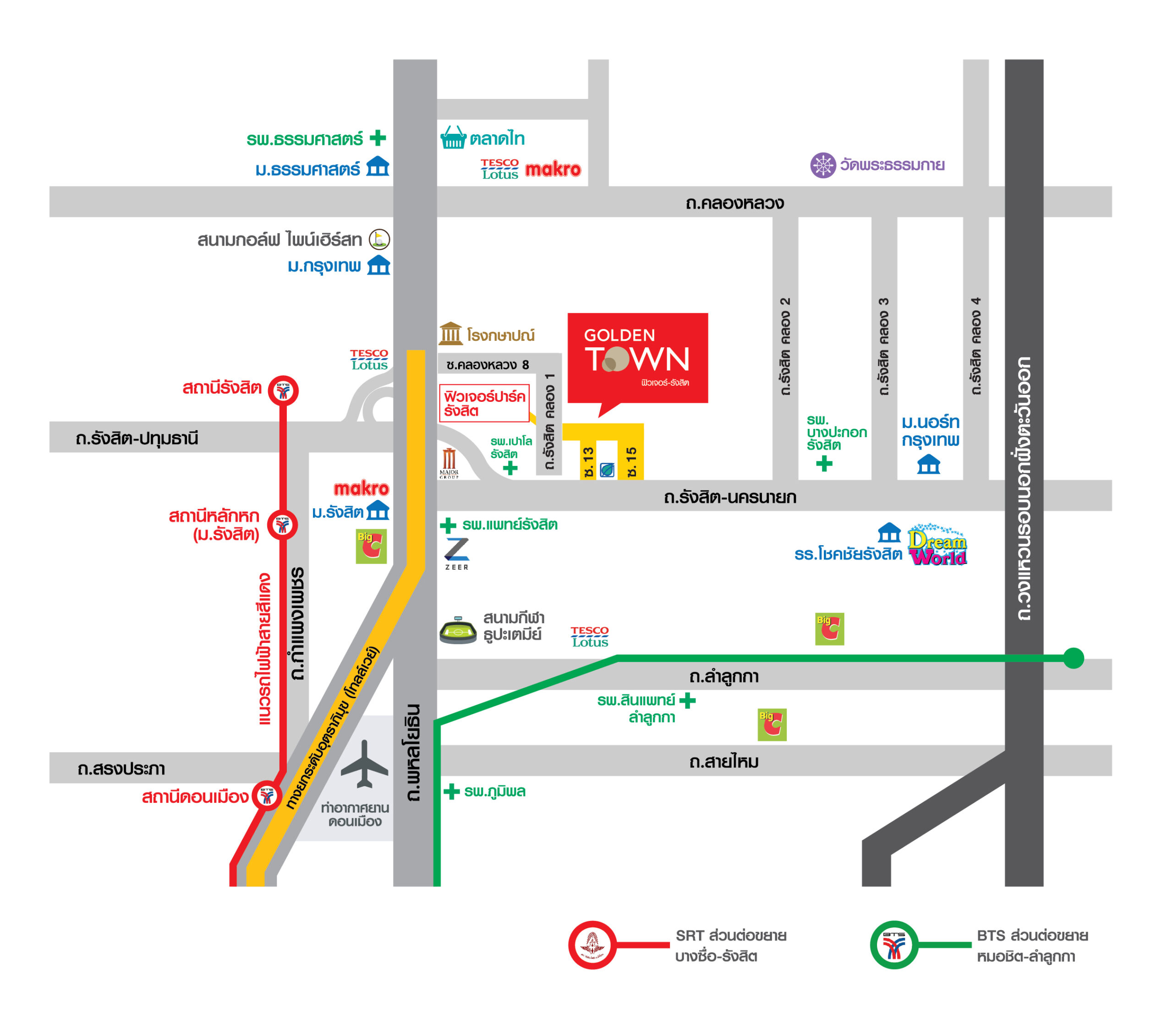 SRT รังสิตBTS แยก คปอ.สนามบินดอนเมืองถนนรังสิต-นครนายกถนนพหลโยธินถนนรังสิต-ปทุมธานีถนนลำลูกกาถนนคลองหลวงทางด่วนโทลล์เวย์ทางด่วนอุดรรัถยาทางด่วนกาญจนาภิเษก
