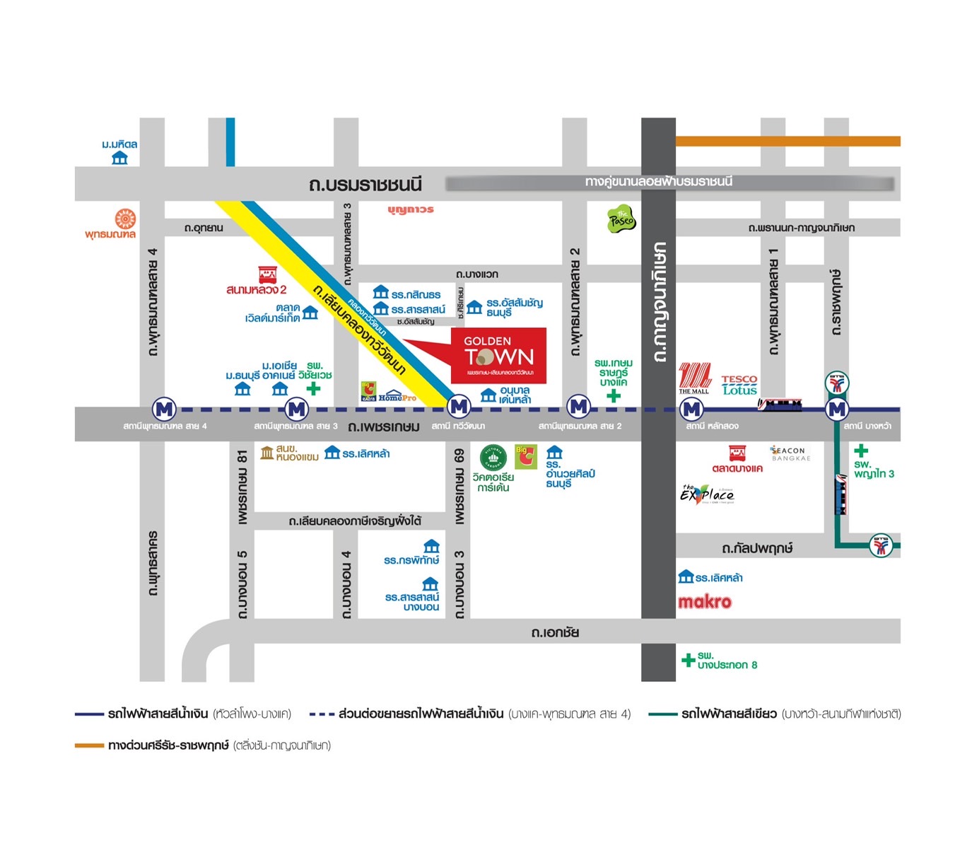 สถานศึกษารร. บดินทรเดชา นนทบุรีรร.อนุบาลเด่นหล้ารร.เตรียมอุดมศึกษา พัฒนาการ นนทบุรี ห้างสรรพสินค้าเดอะวอล์ค ราชพฤกษ์เดอะเซอร์เคิล ราชพฤกษ์โฮมโปร สถานพยาบาลรพ.บางกรวยรพ.ยันฮีรพ.ศิริราชปิยมหาการุณย์รพ. ศูนย์บริการการแพทย์นนทบุรีรพ. ผิวหนัง อโศก สาขาบางพลัด