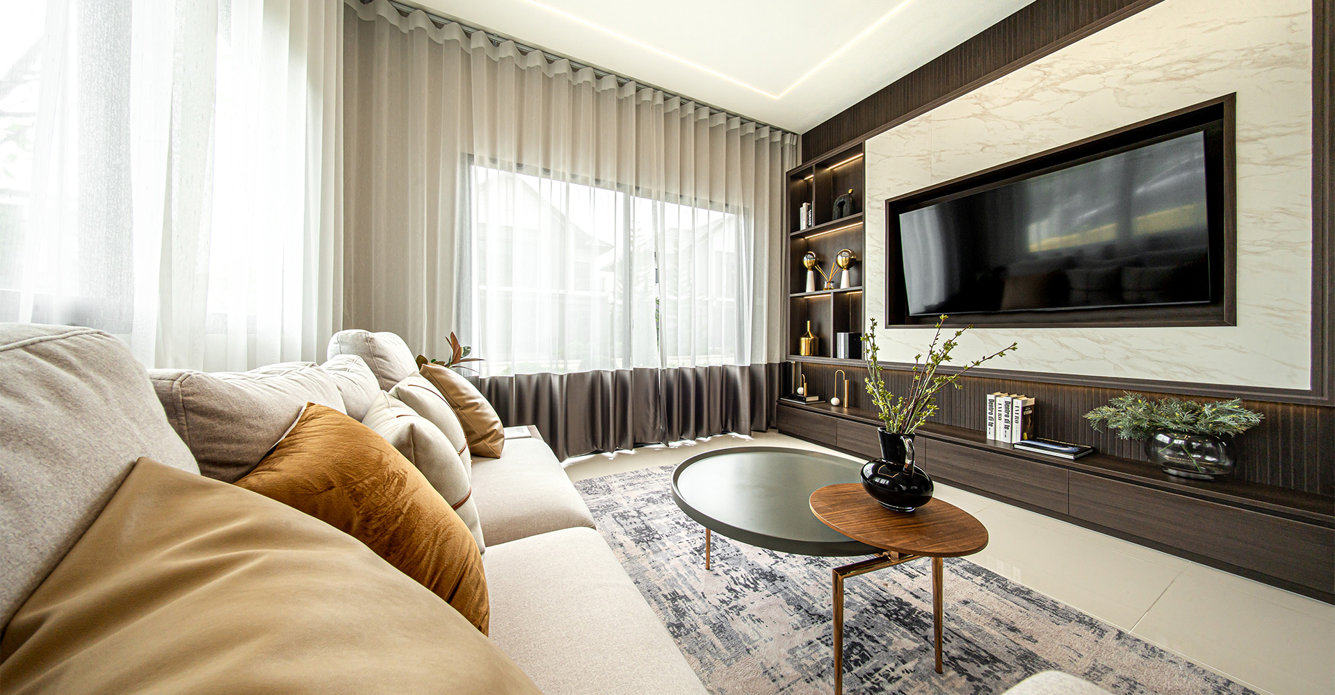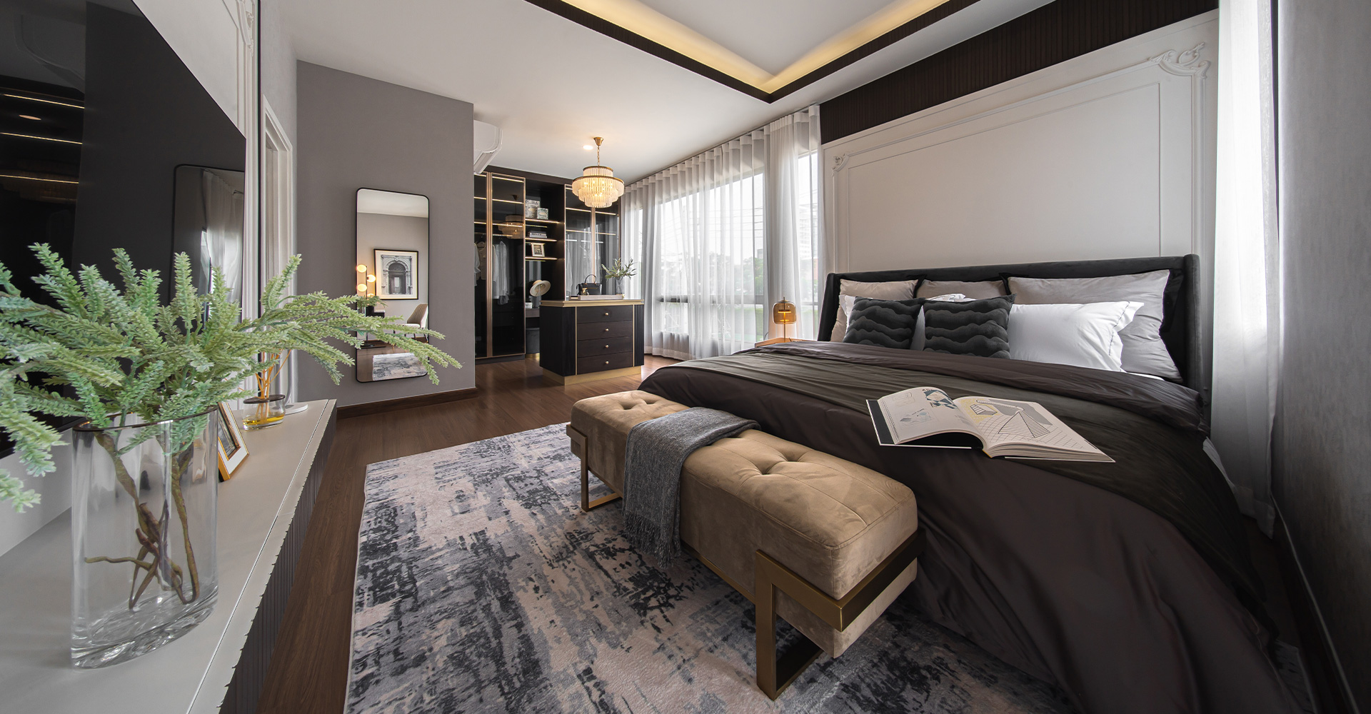 เมื่อเปิดประตูบ้านเข้ามา จะพบ Living Area ที่มีขนาดกว้างพอสมควร สามารถวางชุดโซฟา และชั้นวางทีวีได้ค่ะ ยังมีพื้นที่เหลือสำหรับเดินสวนกันได้สบาย สำหรับห้อง Master Bedroom จะมีห้องน้ำในตัวค่ะ ภายในห้องน้ำออกแบบมาให้ใช้สอยได้อย่างสะดวกเช่นเคยค่ะ แบ่งโซนเปียก-แห้ง ไว้ชัดเจน มีที่กั้น Partition กระ