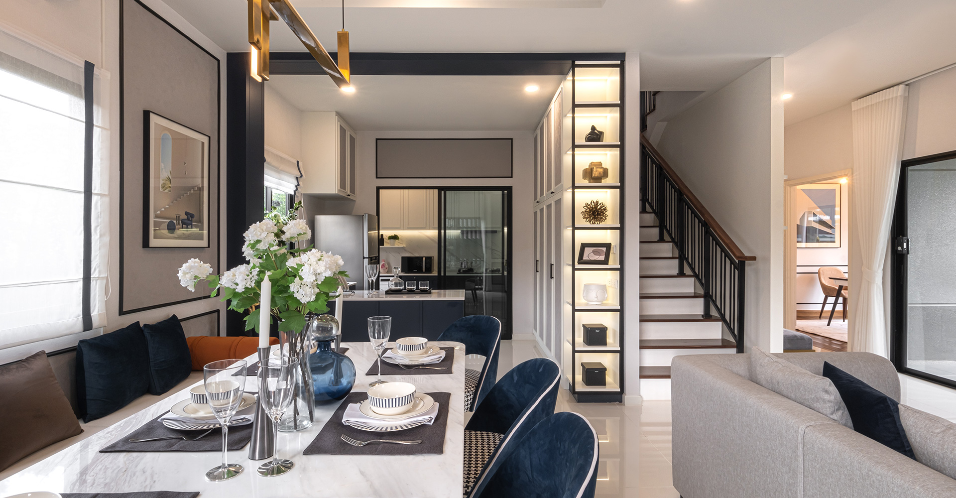 โถงทางเดินเมื่อเดินเข้ามา ซ้ายมือจะเป็นบันไดทางขึ้นชั้น 2 มาพร้อมห้องเก็บของใต้บันไดค่ะ ส่วนตรงข้ามกับบันไดจะเป็นครัวปิดของตัวบ้านนั่นเอง เบอร์โทร 1427