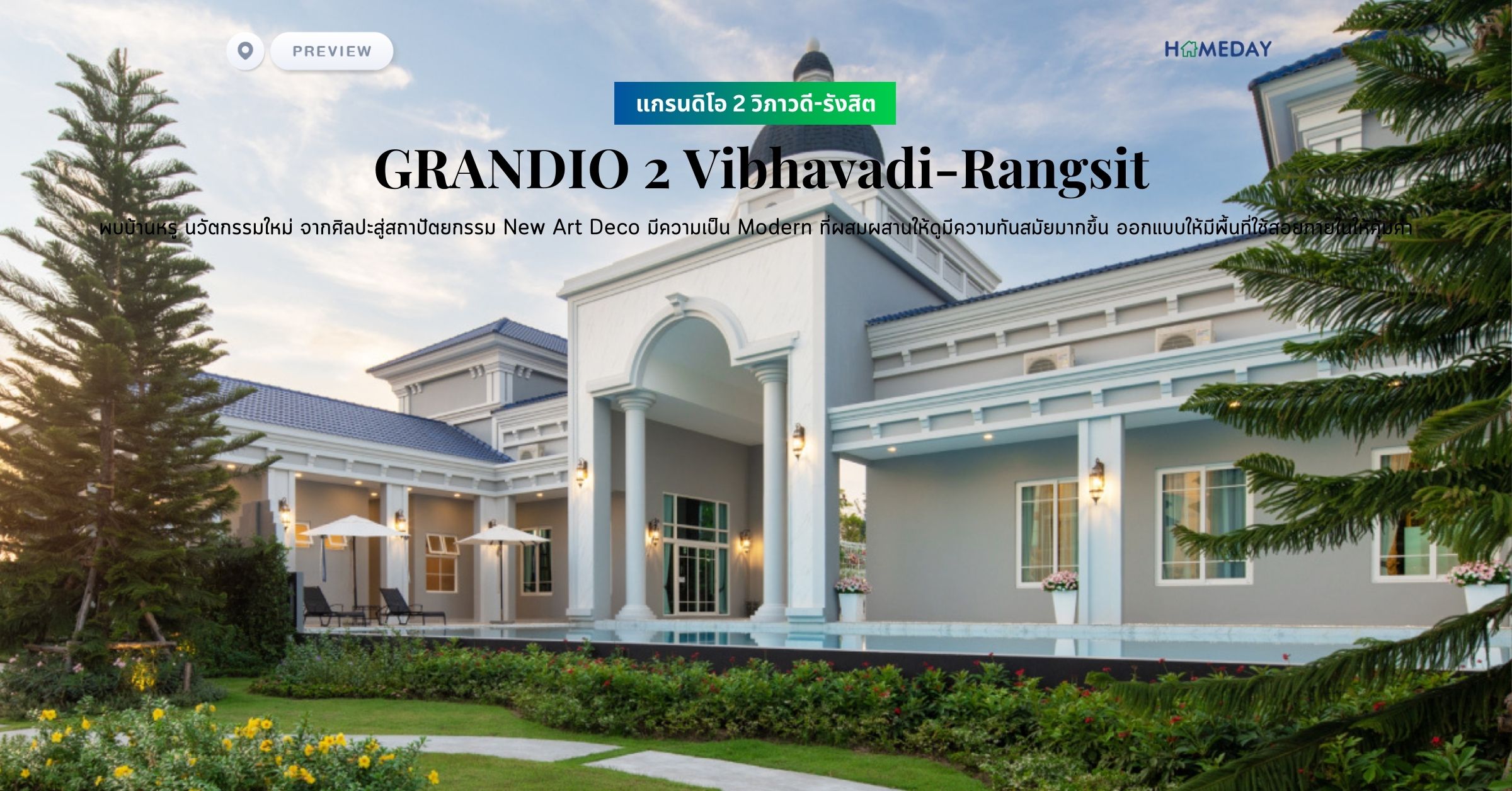 "โครงการ แกรนดิโอ 2 วิภาวดี-รังสิต (GRANDIO 2 Vibhavadi-Rangsit) พบบ้านหรู นวัตกรรมใหม่ จากศิลปะสู่สถาปัตยกรรม New Art Deco ที่มีความแตกต่าง และงดงามในแบบของตนเอง คงความ Classic ที่มีความสวยงามในทุกยุค ทุกสมัย และมีความเป็น Modern ที่ผสมผสานให้ดูมีความทันสมัยมากขึ้น ออกแบบให้มีพื้นที่ใช้สอยภายในให้คุ้มค่า"
