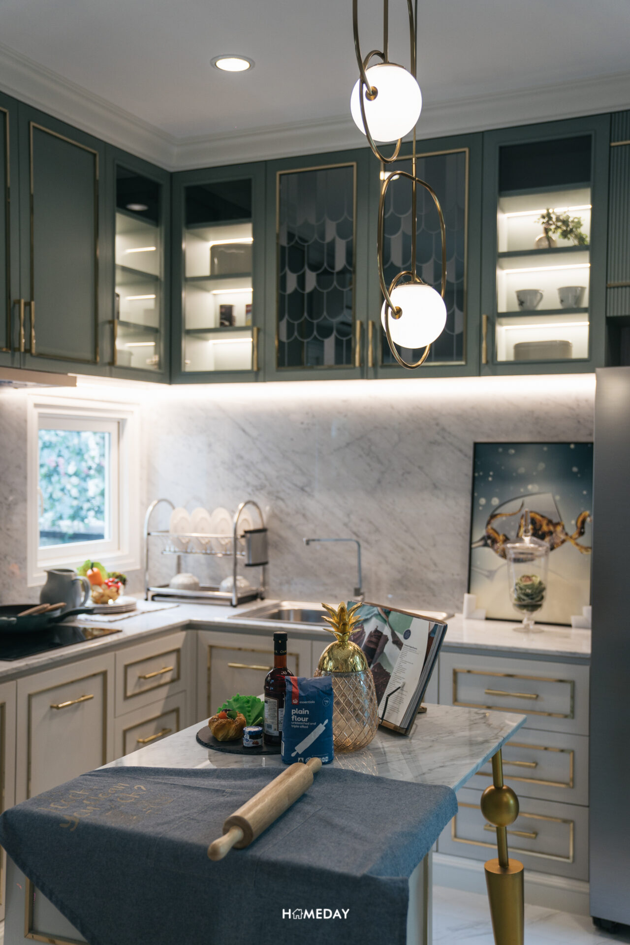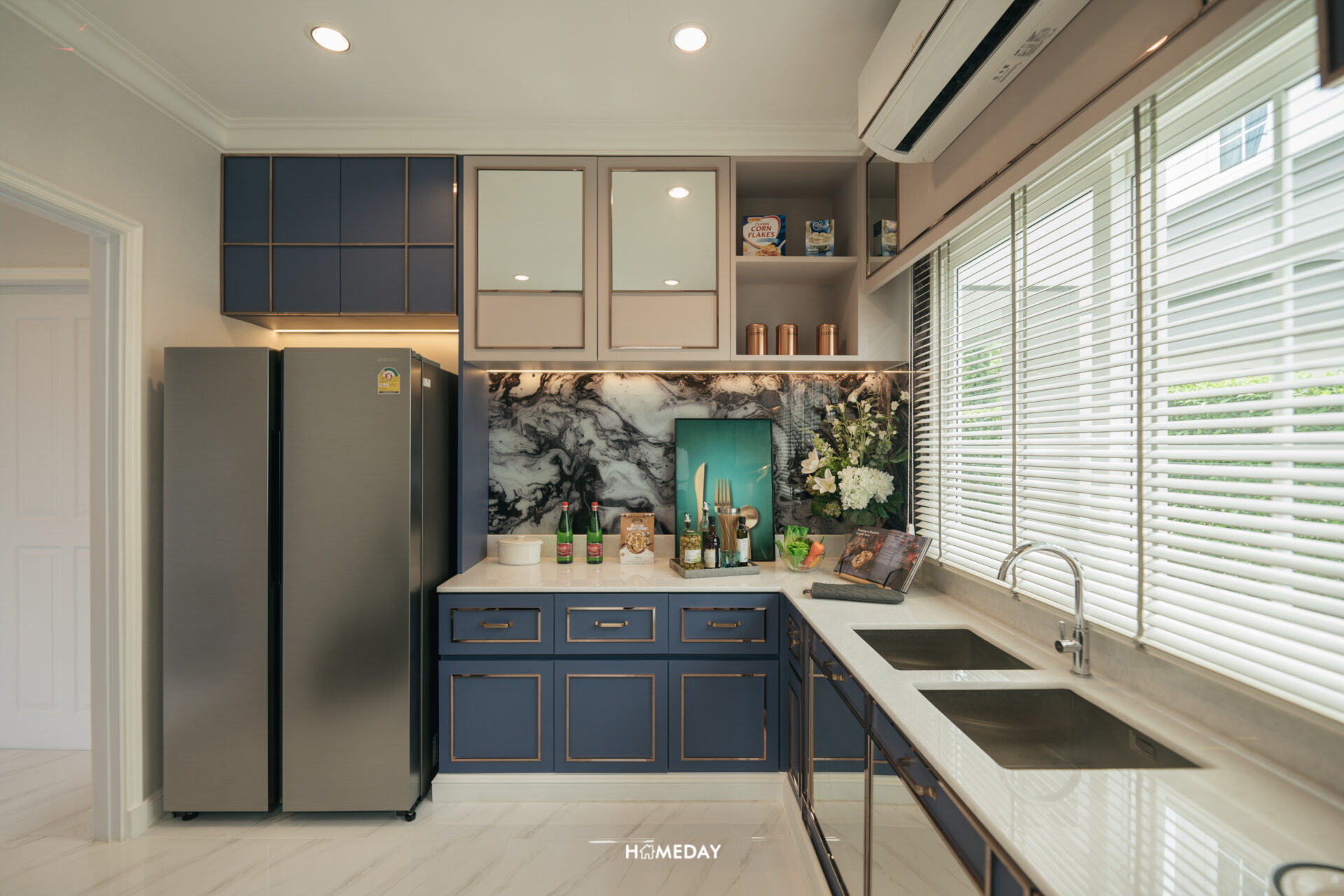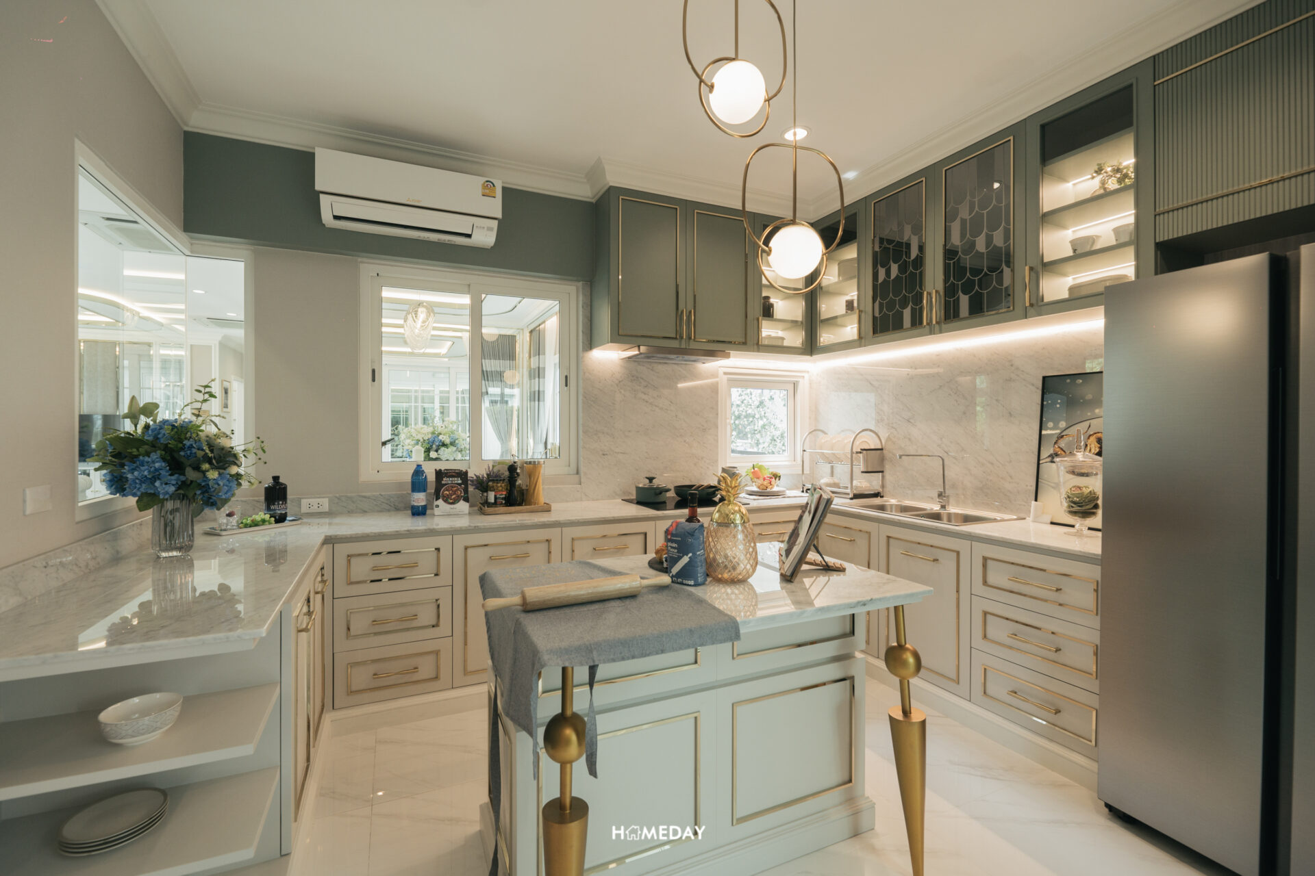 มาที่ Corridor อีกฝั่งกันบ้างครับ ฝั่งนี้ซ้ายมือจะเป็นครัวปิดของตัวบ้านครับ อยู่เชื่อมกันกับพื้นที่วางโต๊ะรับประทานอาหารเลย ตัวห้องได้บานกระจกเข้ามุม รวมไปถึงกระจกบานสไลด์ ที่สามารถเปิดออกเพื่อเสิร์ฟอาหารบริเวณ Pantry ด้านนอกได้เลย ขนาดของครัวสามารถบิลต์อินเคาน์เตอร์รูปทรงตัว U ได้เลยครับ จะใส่ไอส์แลนด์เพิ่มก็ยังได้ เหลือพื้นที่ให้ใช้งานและเดินไปมารอบครัวได้คล่องตัว