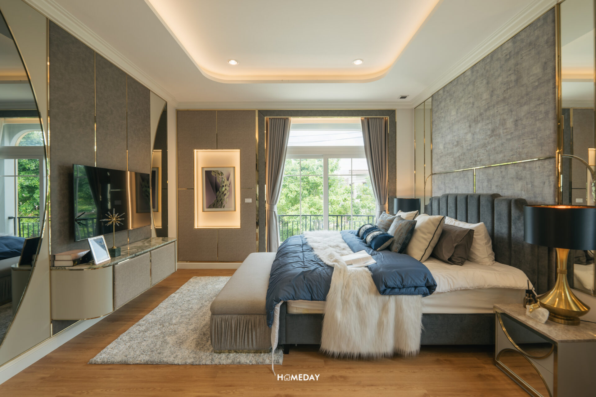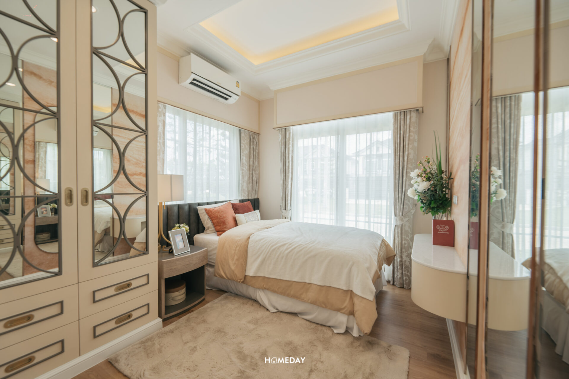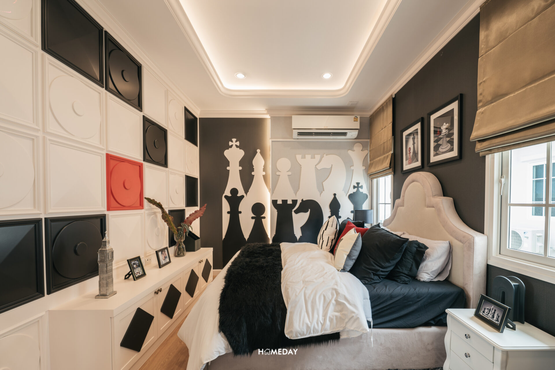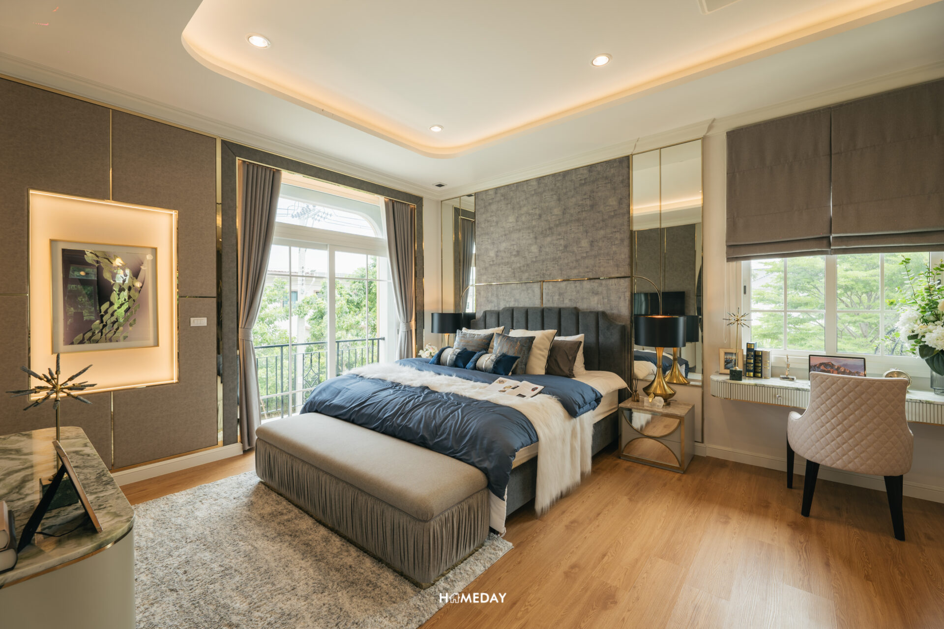 พื้นที่วางเตียง แน่นอนว่ารองรับขนาด 6 ฟุตได้อย่างแน่นอนครับ พื้นที่รอบเตียงเหลือให้ใช้งานสบาย ๆ อีกเช่นกัน โดยบ้านตัวอย่างวางตกแต่งให้เราดูเป็นโต๊ะหัวเตียงสองฝั่งและชั้นวางของขนาดใหญ่ที่ปลายเตียง รองรับการแขวนทีวีได้ครับ เหลือพื้นที่รอบเตียงให้ใช้งานเดินผ่านได้สะดวก พื้นที่ติดกับเตียงเราสามารถบิลต์อินเป็นโต๊ะเครื่องแป้งได้เลยครับ ด้านใต้รองรับปลั๊กไฟมาไว้ให้ สามารถใช้อุปกรณ์ทำผมต่าง ๆ ได้สะดวก