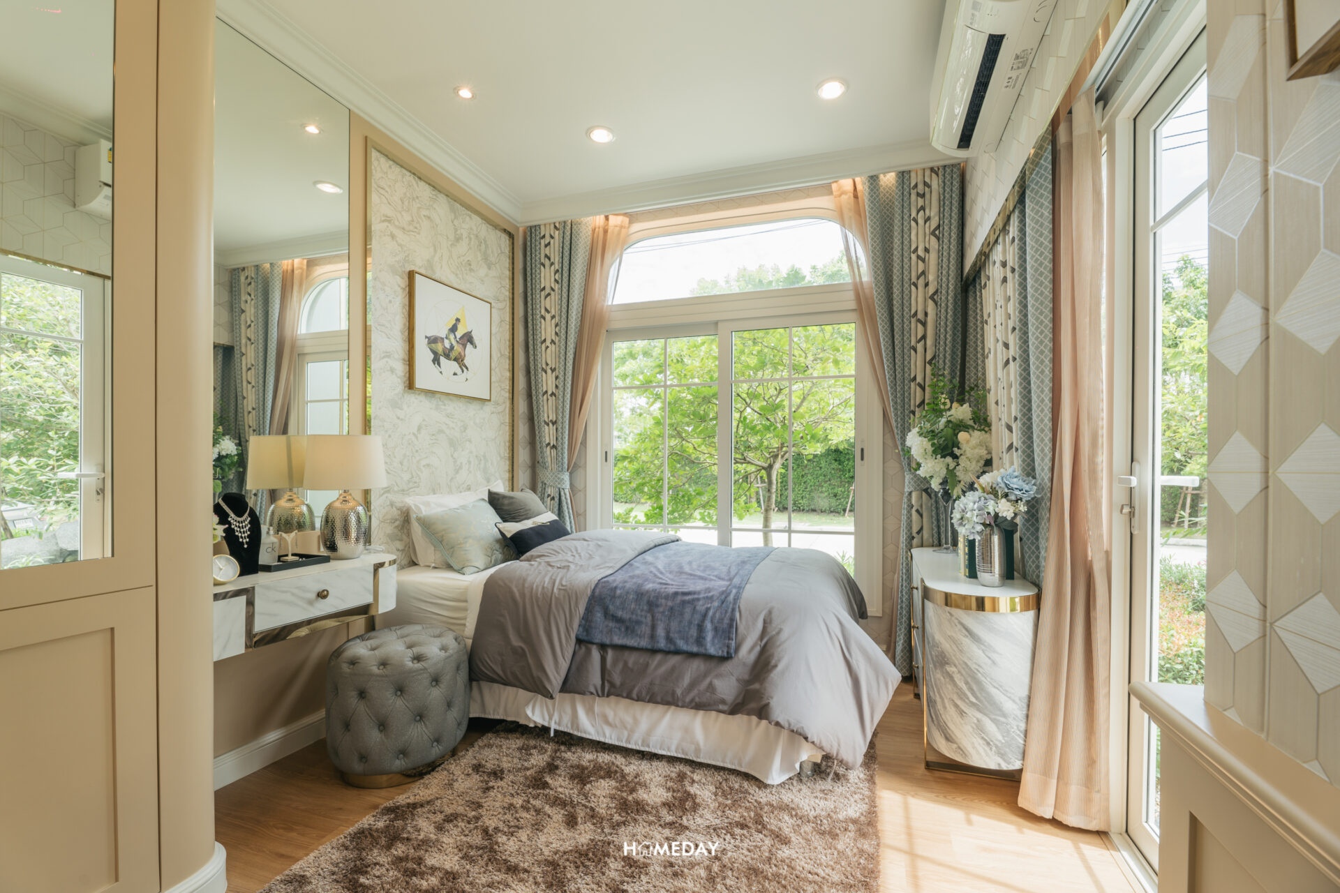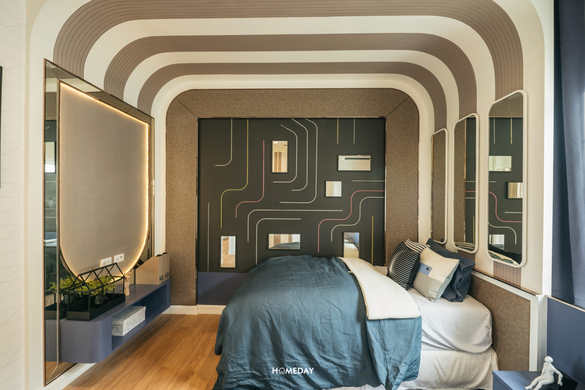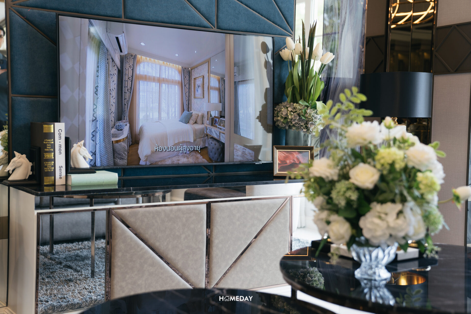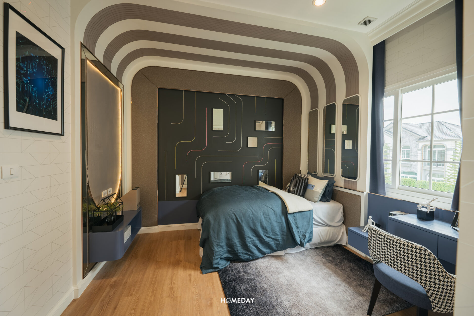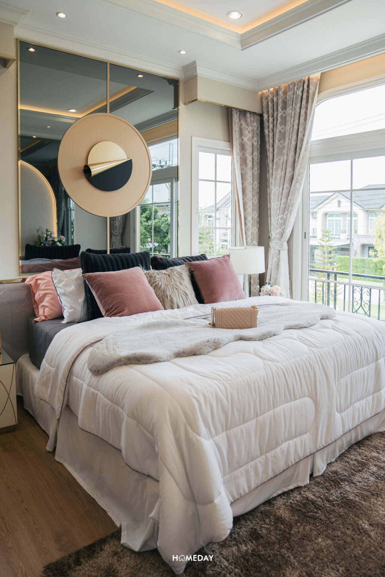 พื้นที่วางเตียง แน่นอนว่ารองรับขนาด 6 ฟุตได้อย่างแน่นอนครับ พื้นที่รอบเตียงเหลือให้ใช้งานสบาย ๆ อีกเช่นกัน โดยบ้านตัวอย่างวางตกแต่งให้เราดูเป็นโต๊ะหัวเตียงสองฝั่งและชั้นวางของขนาดใหญ่ที่ปลายเตียง รองรับการแขวนทีวีได้ครับ เหลือพื้นที่รอบเตียงให้ใช้งานเดินผ่านได้สะดวก พื้นที่ติดกับเตียงเราสามารถบิลต์อินเป็นโต๊ะเครื่องแป้งได้เลยครับ ด้านใต้รองรับปลั๊กไฟมาไว้ให้ สามารถใช้อุปกรณ์ทำผมต่าง ๆ ได้สะดวก