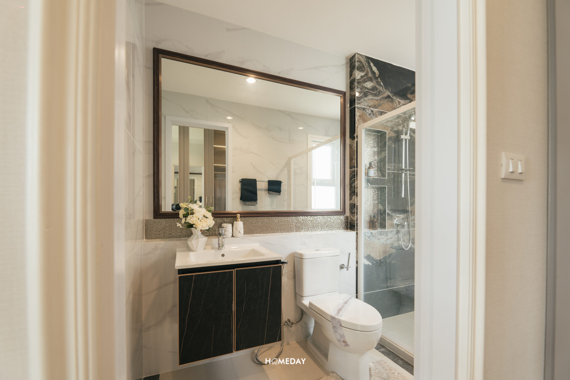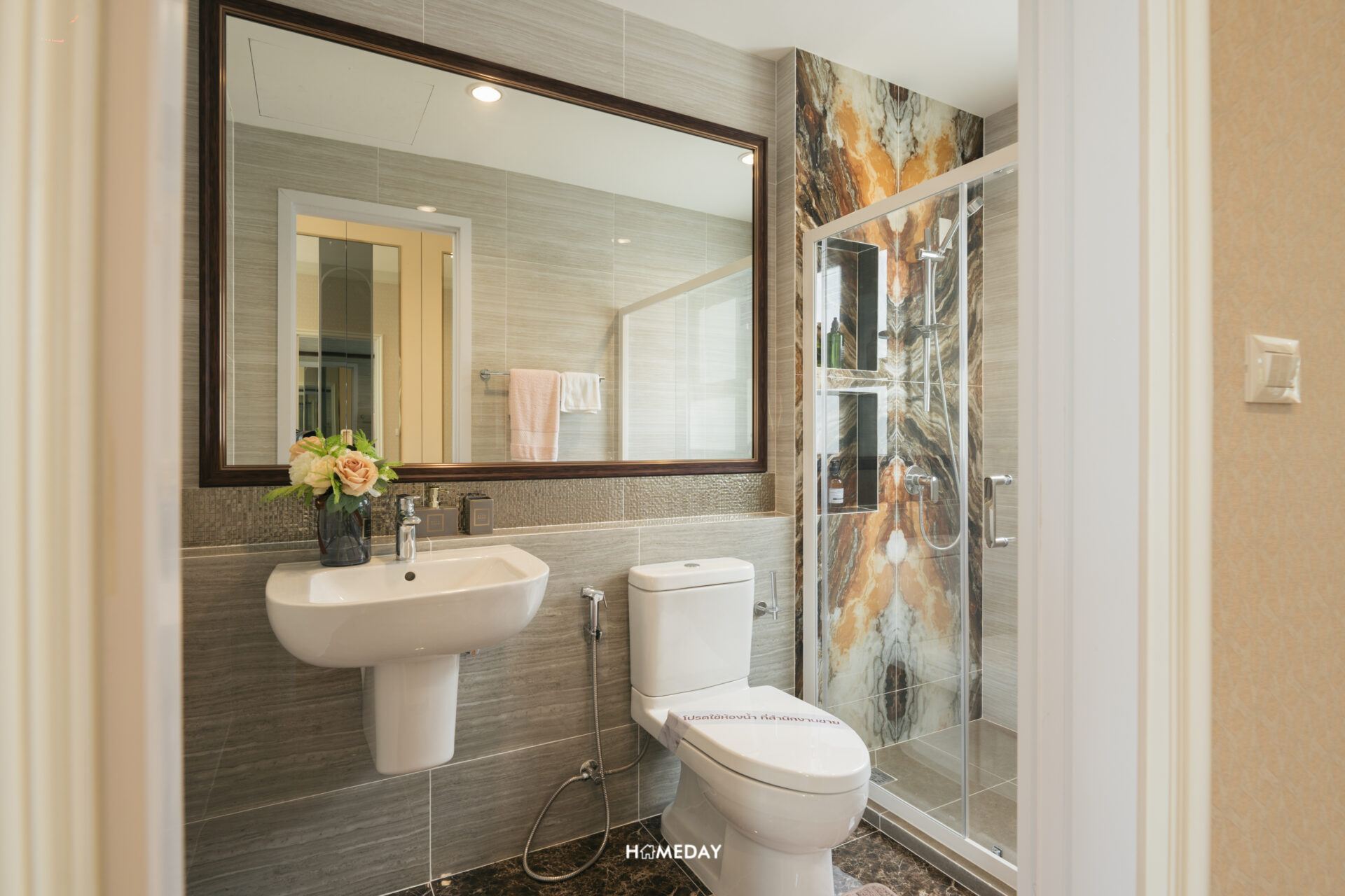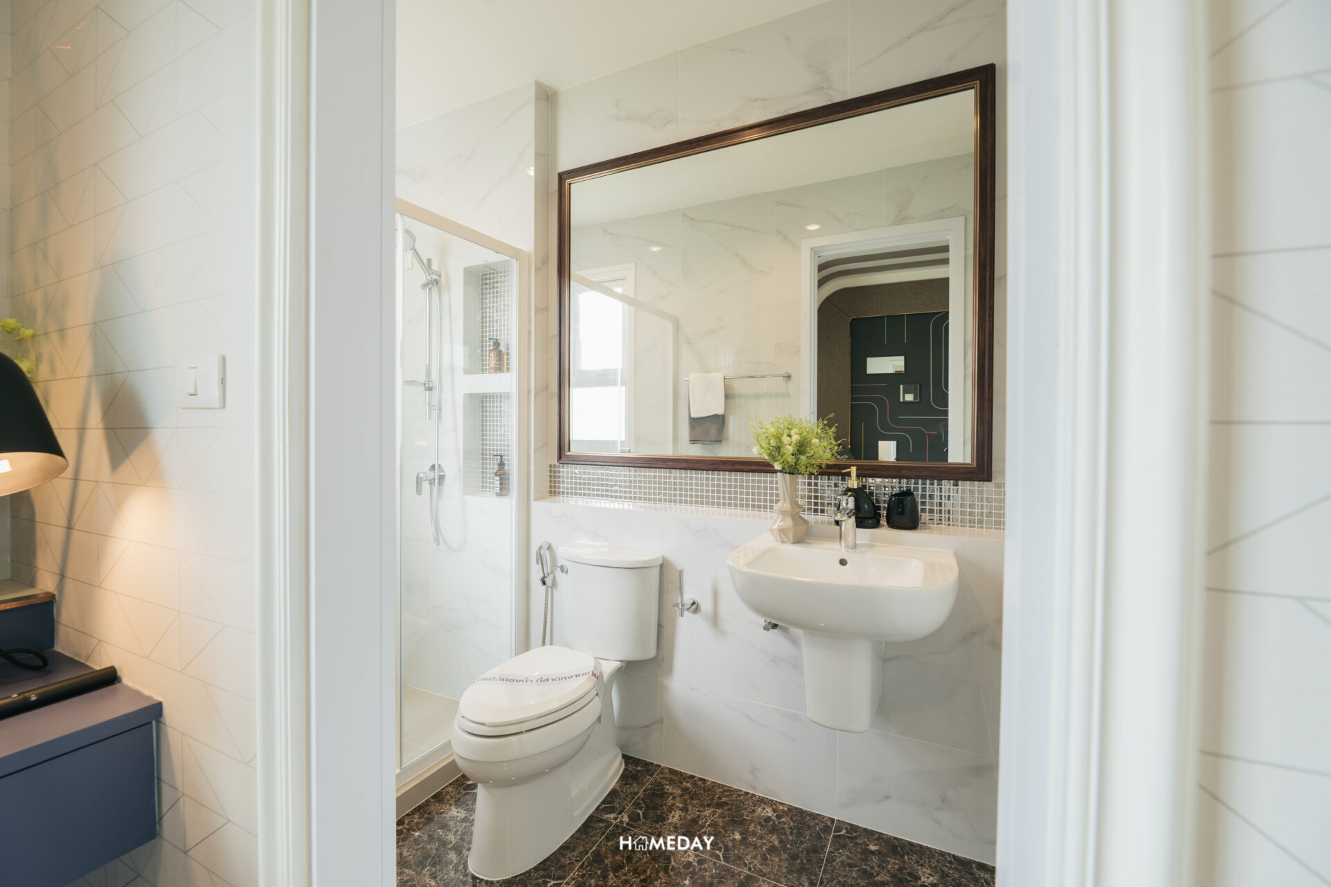ในส่วนของห้องน้ำ ภายในแบ่งโซนการใช้งานมาให้เรียบร้อย แยกโซนเปียกและแห้งออกจากกัน เปิดเข้ามาจะเจอกับอ่างล้างหน้าและโถสุขภัณฑ์ พร้อมบานกระจกขนาดใหญ่เต็มพื้นที่ ด้านหลังออกแบบ Low Wall มาให้สำหรับใช้วางของเพิ่มเติมครับ ส่วนเปียกทำเป็น Shower Box กั้นพื้นที่ด้วย Partition กระจกนิรภัยบานสไลด์ ด้านในได้ Hand Shower พร้อม Drop Wall สำหรับวางขวดสบู่และแชมพูต่าง ๆ มาให้ และได้บานหน้าต่างระบายอากาศมาด้วยครับ