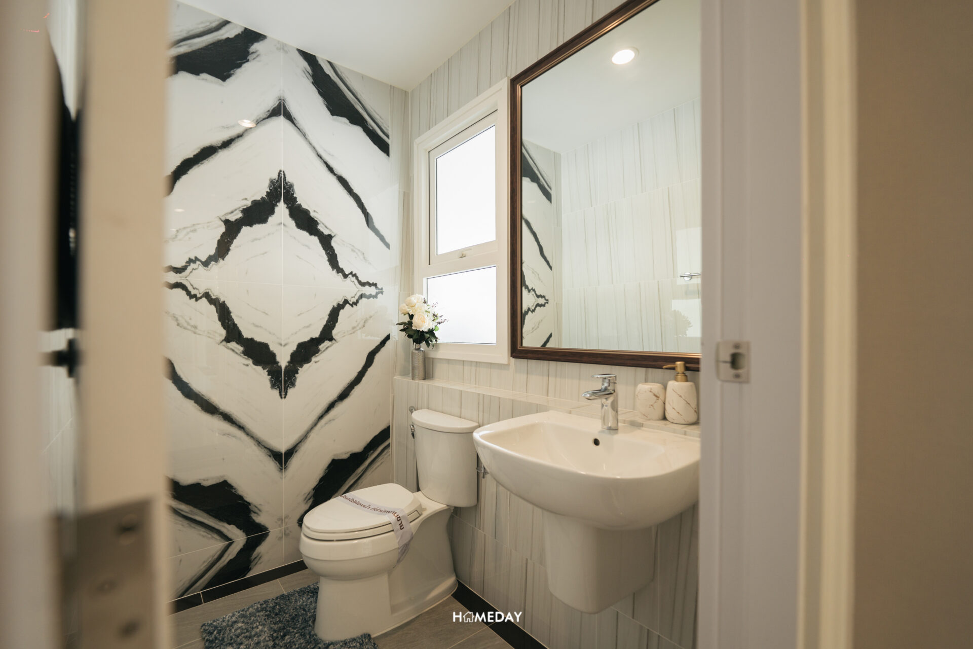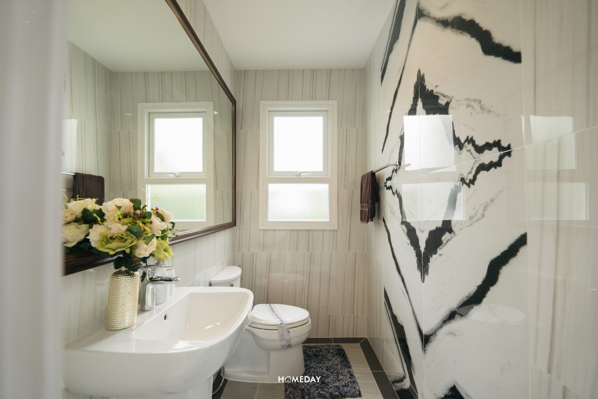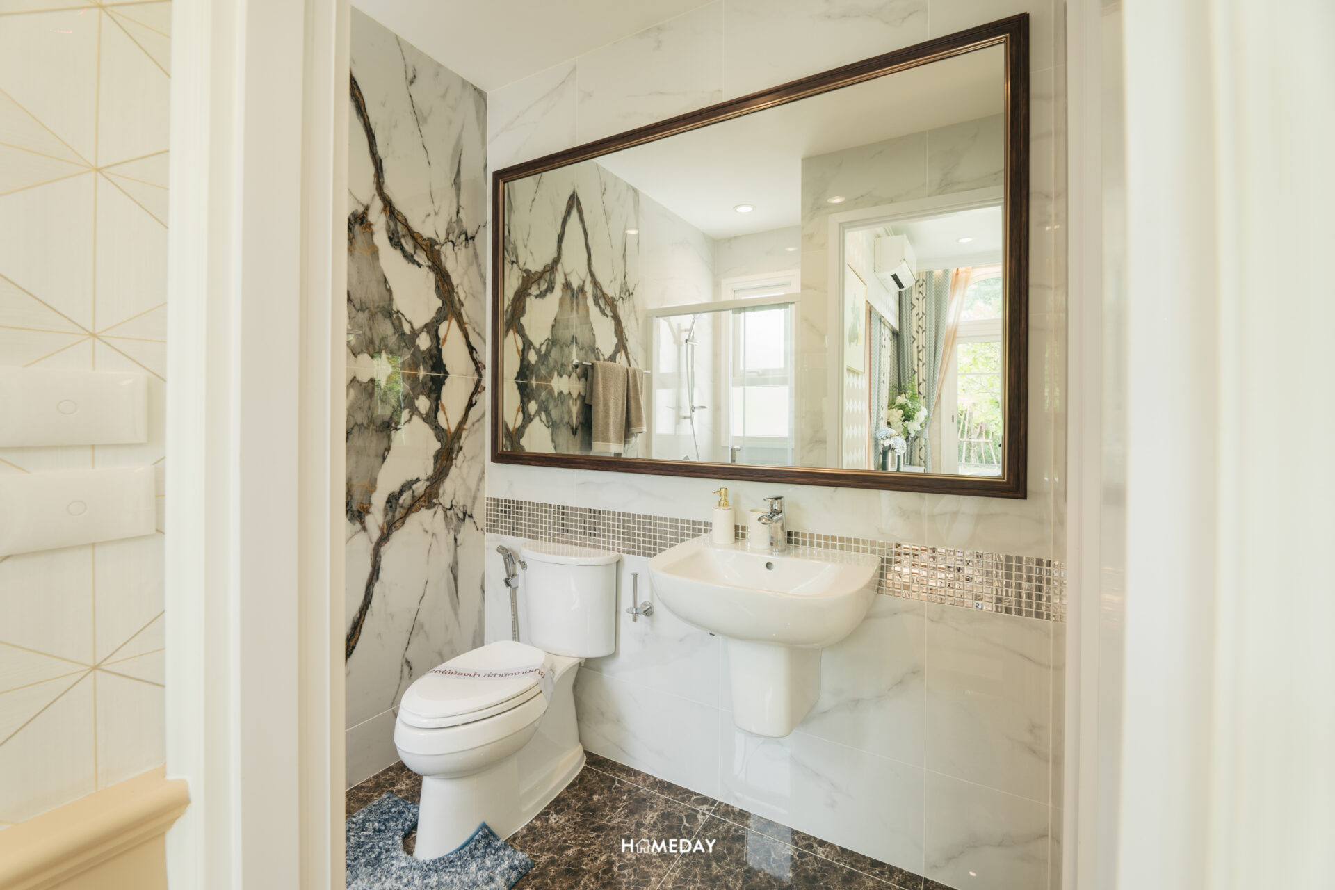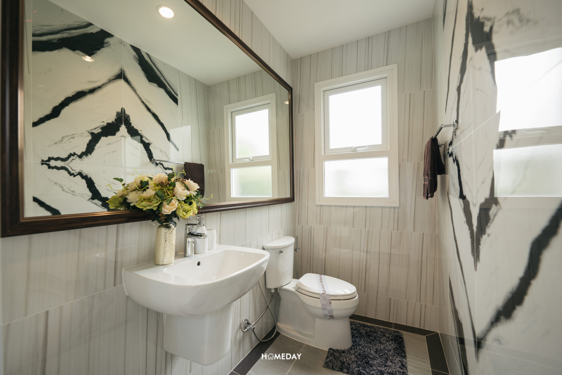 ในส่วนของห้องน้ำ ภายในแบ่งโซนการใช้งานมาให้เรียบร้อย แยกโซนเปียกและแห้งออกจากกัน เปิดเข้ามาจะเจอกับอ่างล้างหน้าและโถสุขภัณฑ์ พร้อมบานกระจกขนาดใหญ่เต็มพื้นที่ ด้านหลังออกแบบ Low Wall มาให้สำหรับใช้วางของเพิ่มเติมครับ ส่วนเปียกทำเป็น Shower Box กั้นพื้นที่ด้วย Partition กระจกนิรภัยบานสไลด์ ด้านในได้ Hand Shower พร้อม Drop Wall สำหรับวางขวดสบู่และแชมพูต่าง ๆ มาให้ และได้บานหน้าต่างระบายอากาศมาด้วยครับ