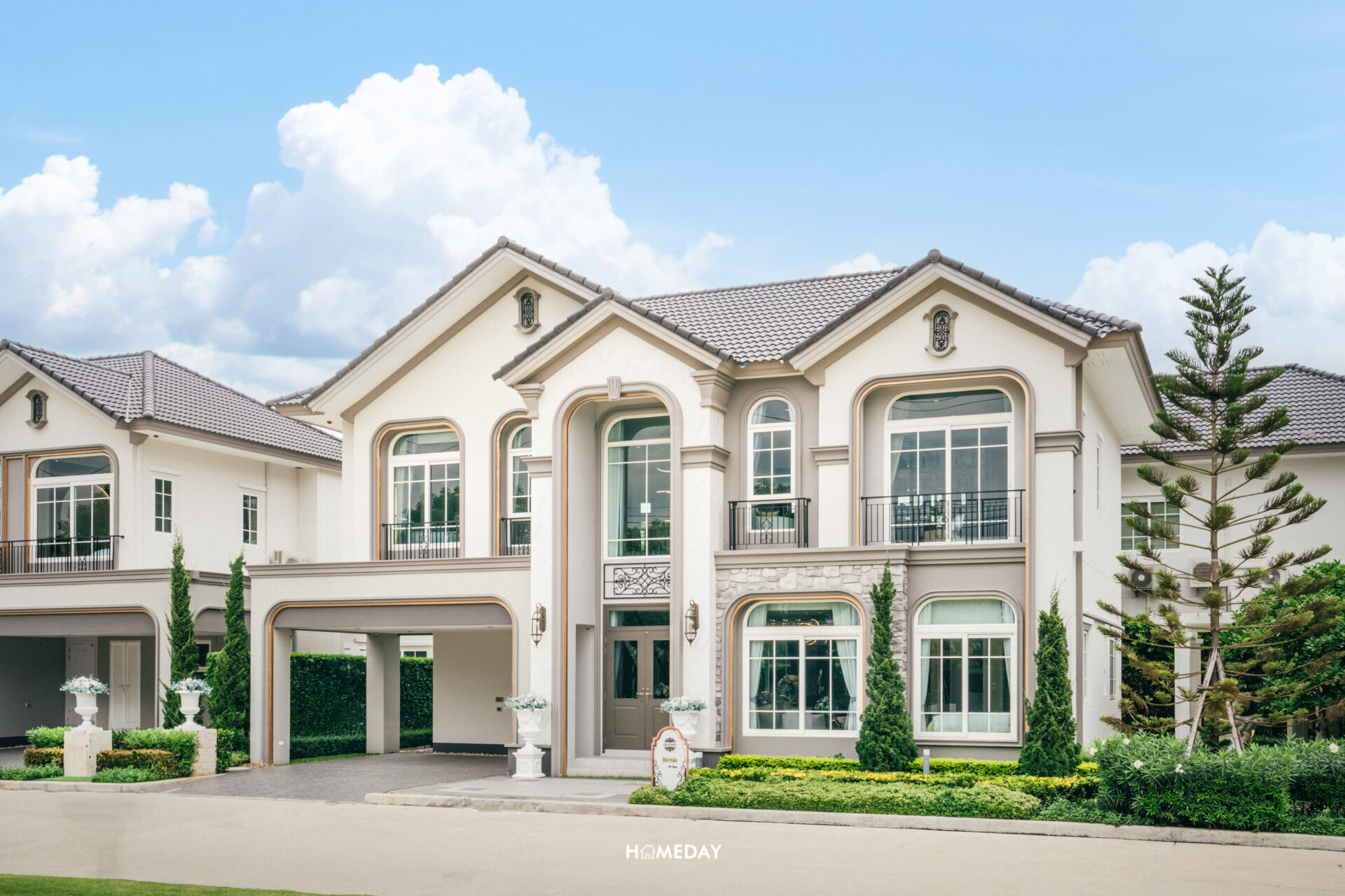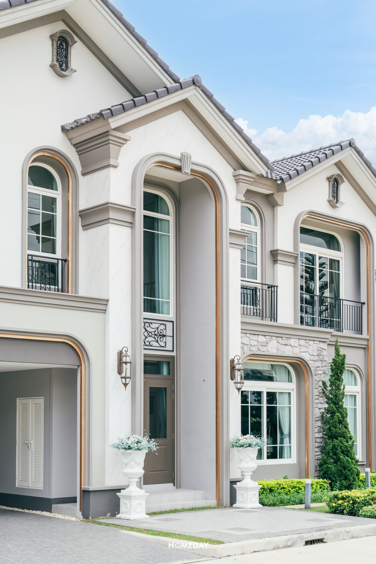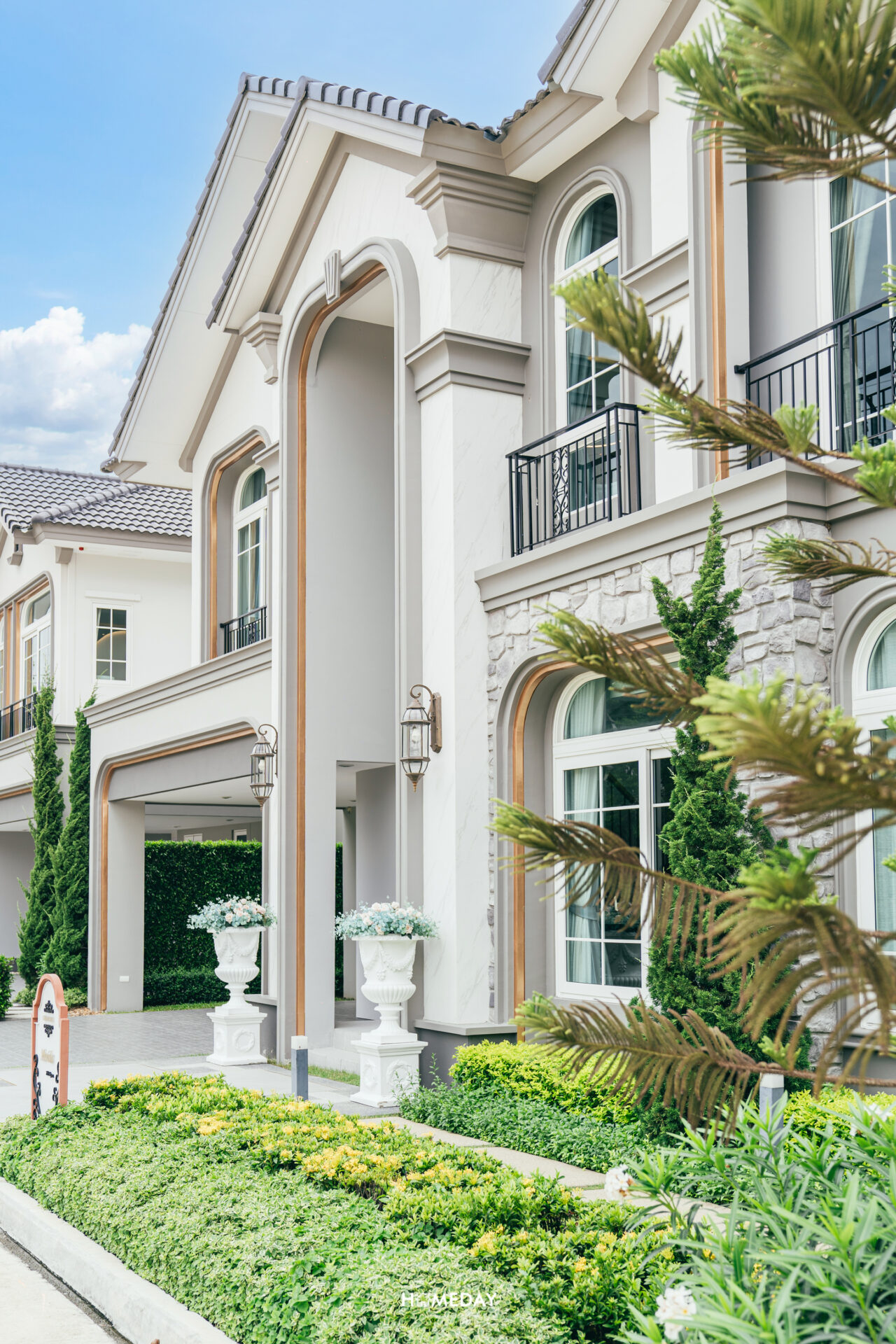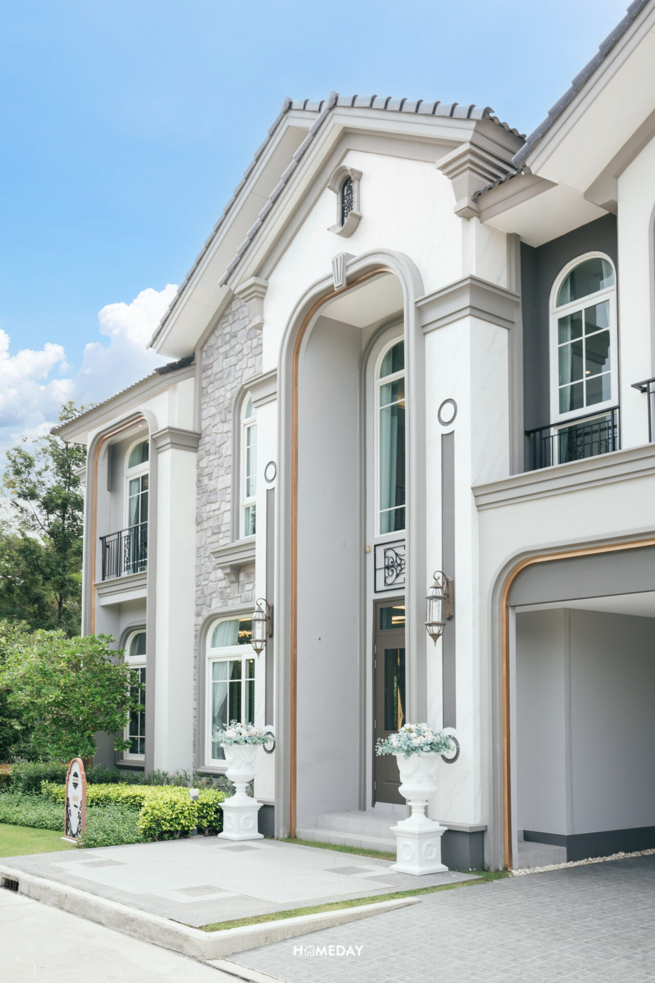 พาชมแบบบ้าน Merida ขนาด 251 ตารางเมตรกันครับ Facade ของตัวบ้าน ออกแบบมาในสถาปัตยกรรมสไตล์ Neo Art Deco ผนังด้านหน้ามีส่วนที่เป็นงานกรุหิน ผสมผสานกับสีขาว สีเทา และสีตัดขอบสีทองได้อย่างลงตัวสวยงามทีเดียว