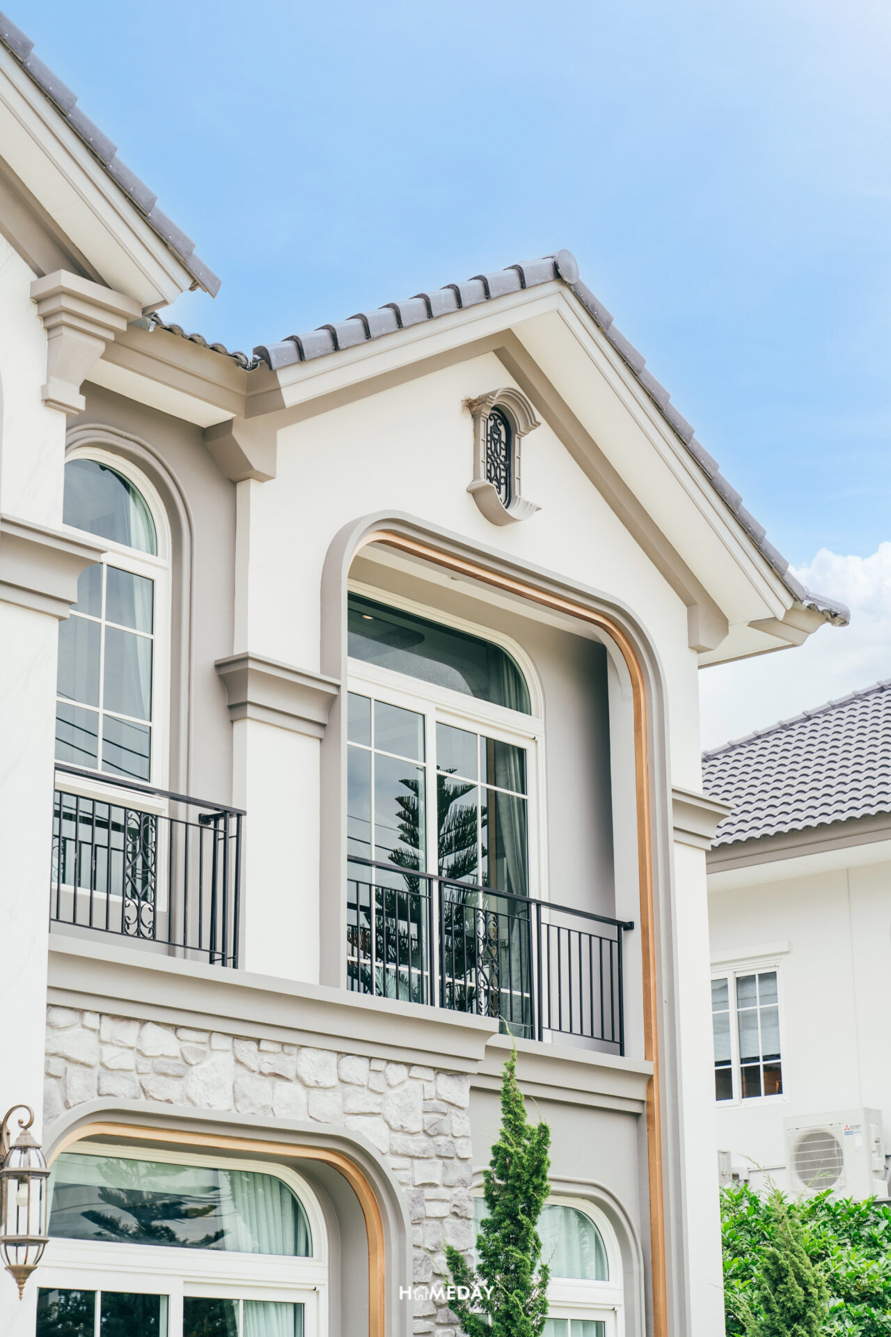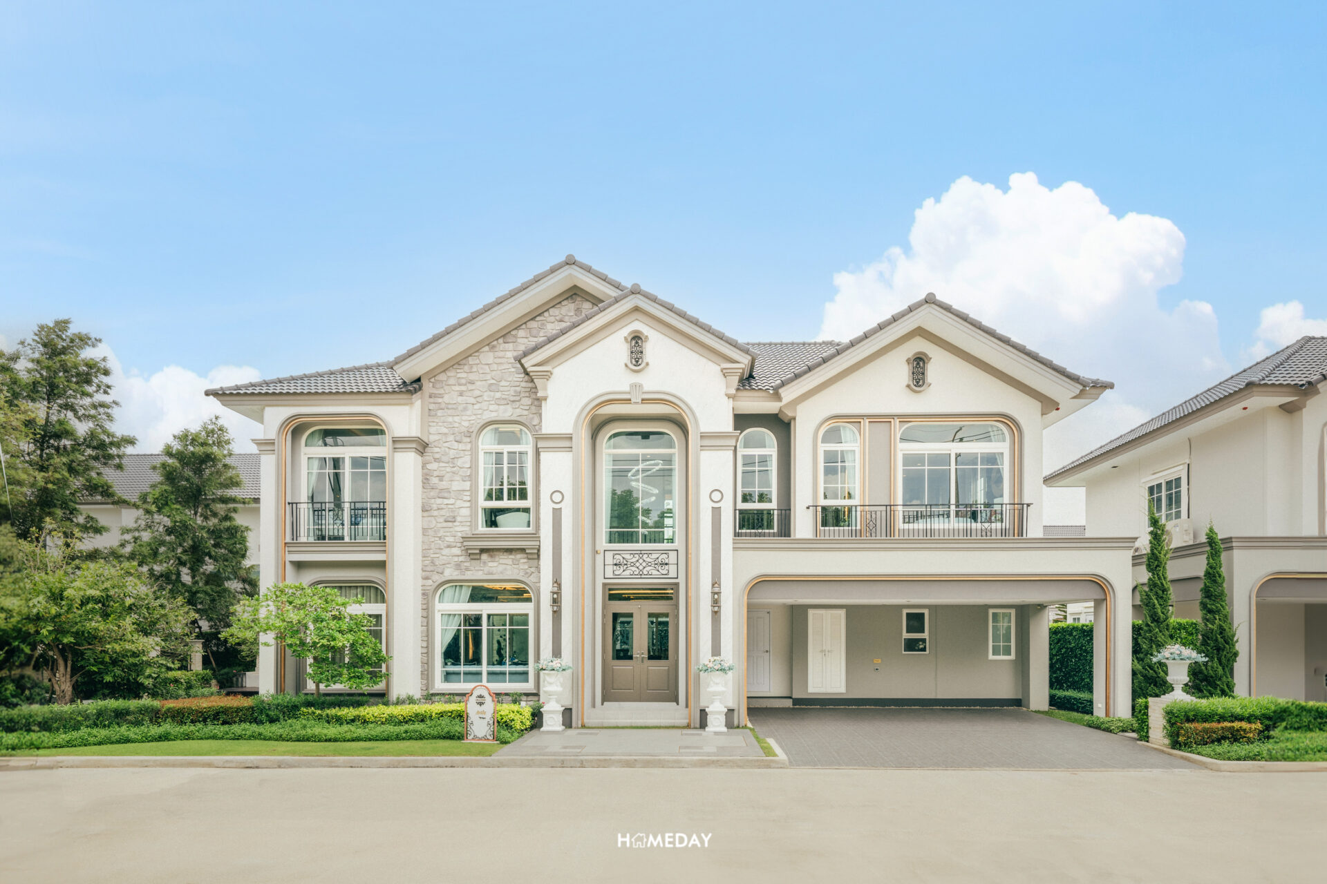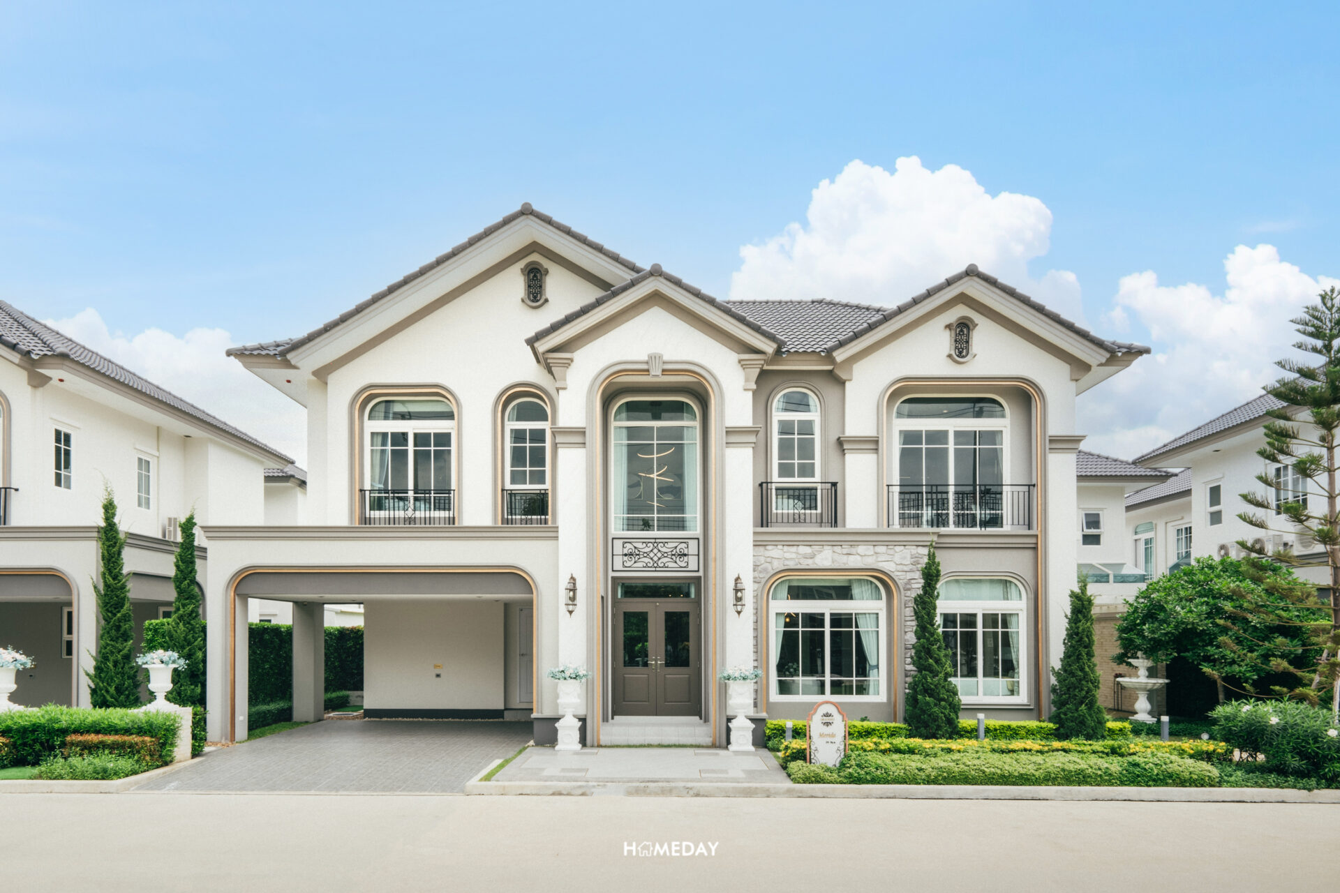 พาชมแบบบ้าน Merida ขนาด 251 ตารางเมตรกันครับ Facade ของตัวบ้าน ออกแบบมาในสถาปัตยกรรมสไตล์ Neo Art Deco ผนังด้านหน้ามีส่วนที่เป็นงานกรุหิน ผสมผสานกับสีขาว สีเทา และสีตัดขอบสีทองได้อย่างลงตัวสวยงามทีเดียว