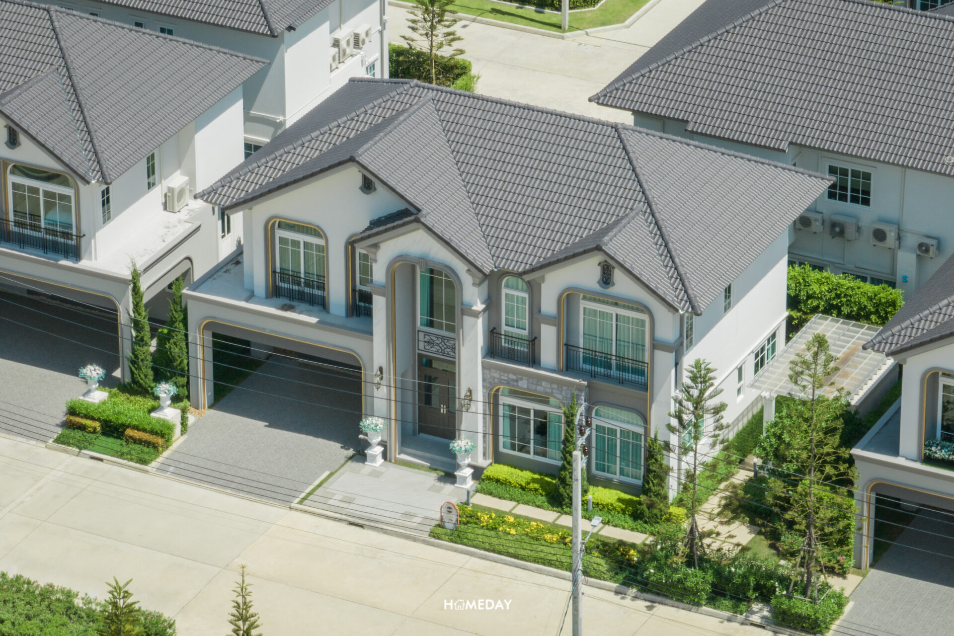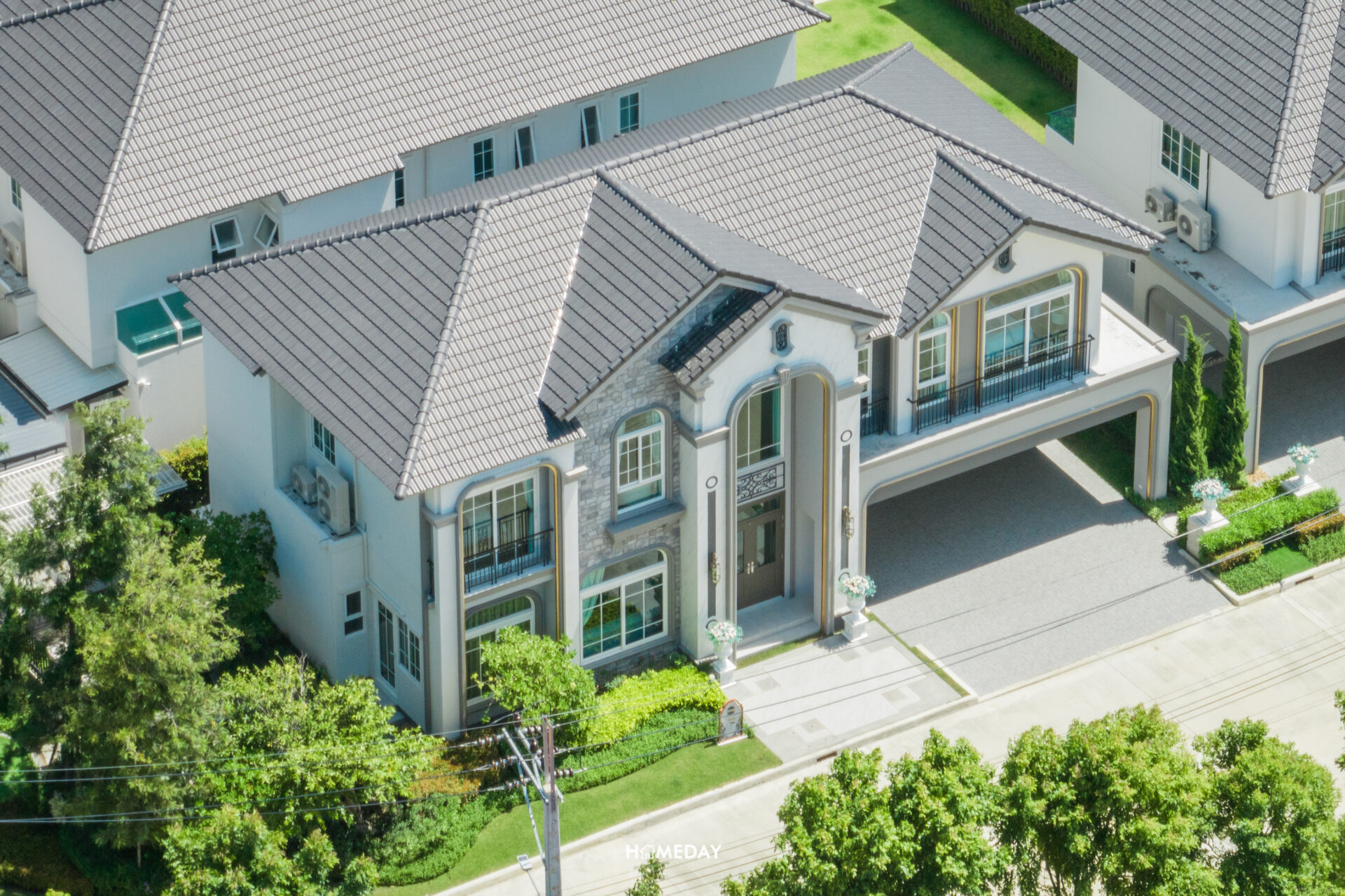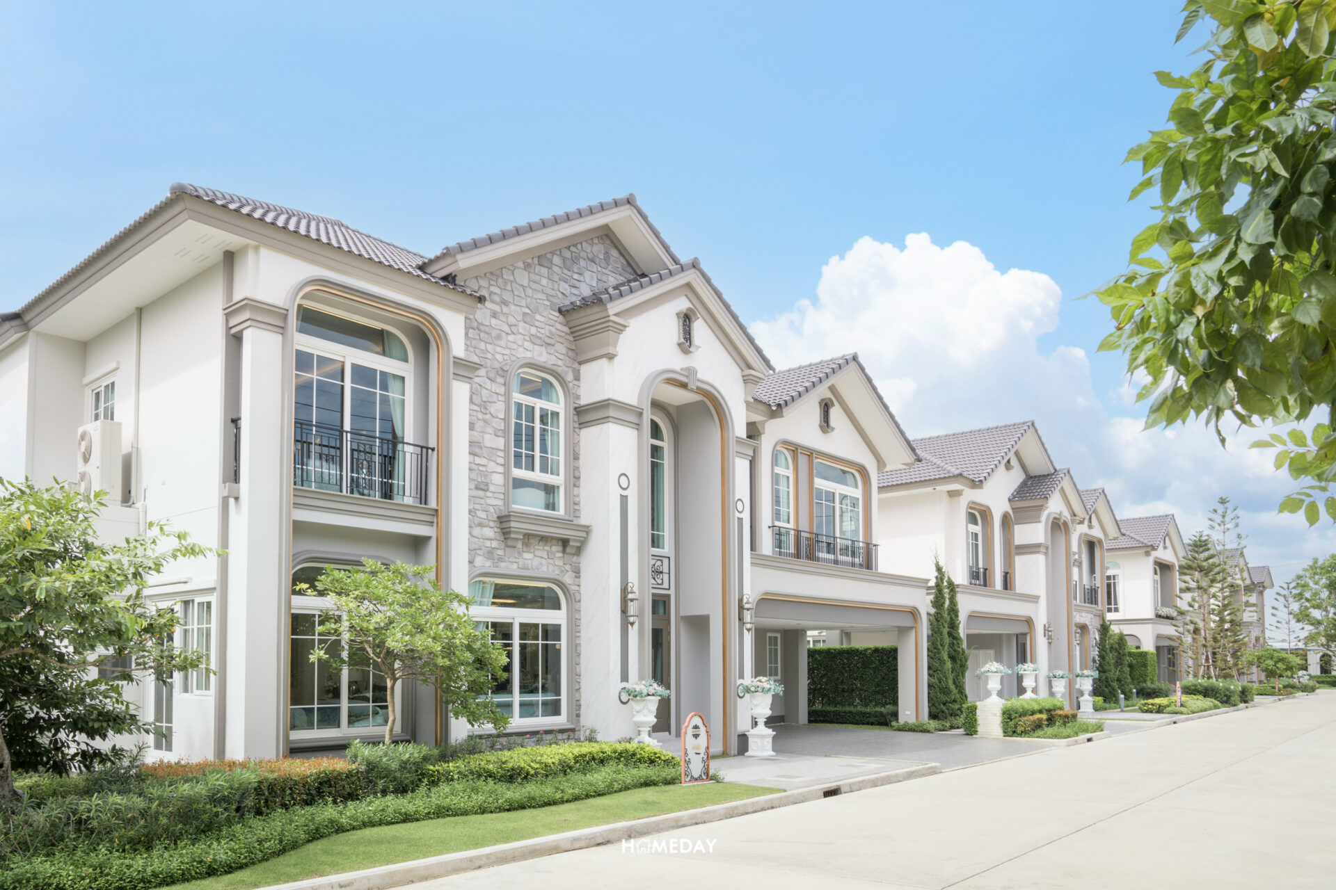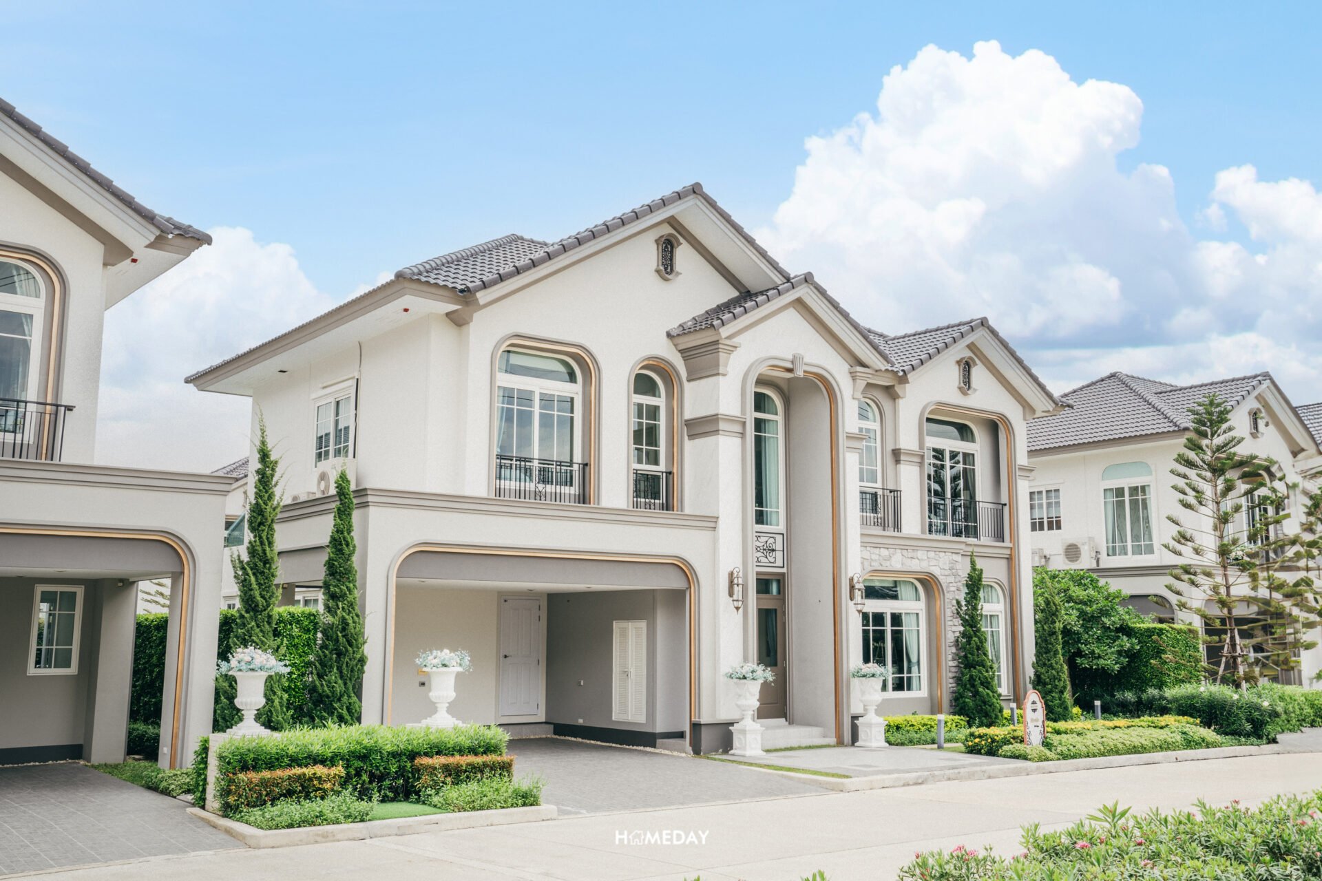 พาชมแบบบ้าน Merida ขนาด 251 ตารางเมตรกันครับ Facade ของตัวบ้าน ออกแบบมาในสถาปัตยกรรมสไตล์ Neo Art Deco ผนังด้านหน้ามีส่วนที่เป็นงานกรุหิน ผสมผสานกับสีขาว สีเทา และสีตัดขอบสีทองได้อย่างลงตัวสวยงามทีเดียว