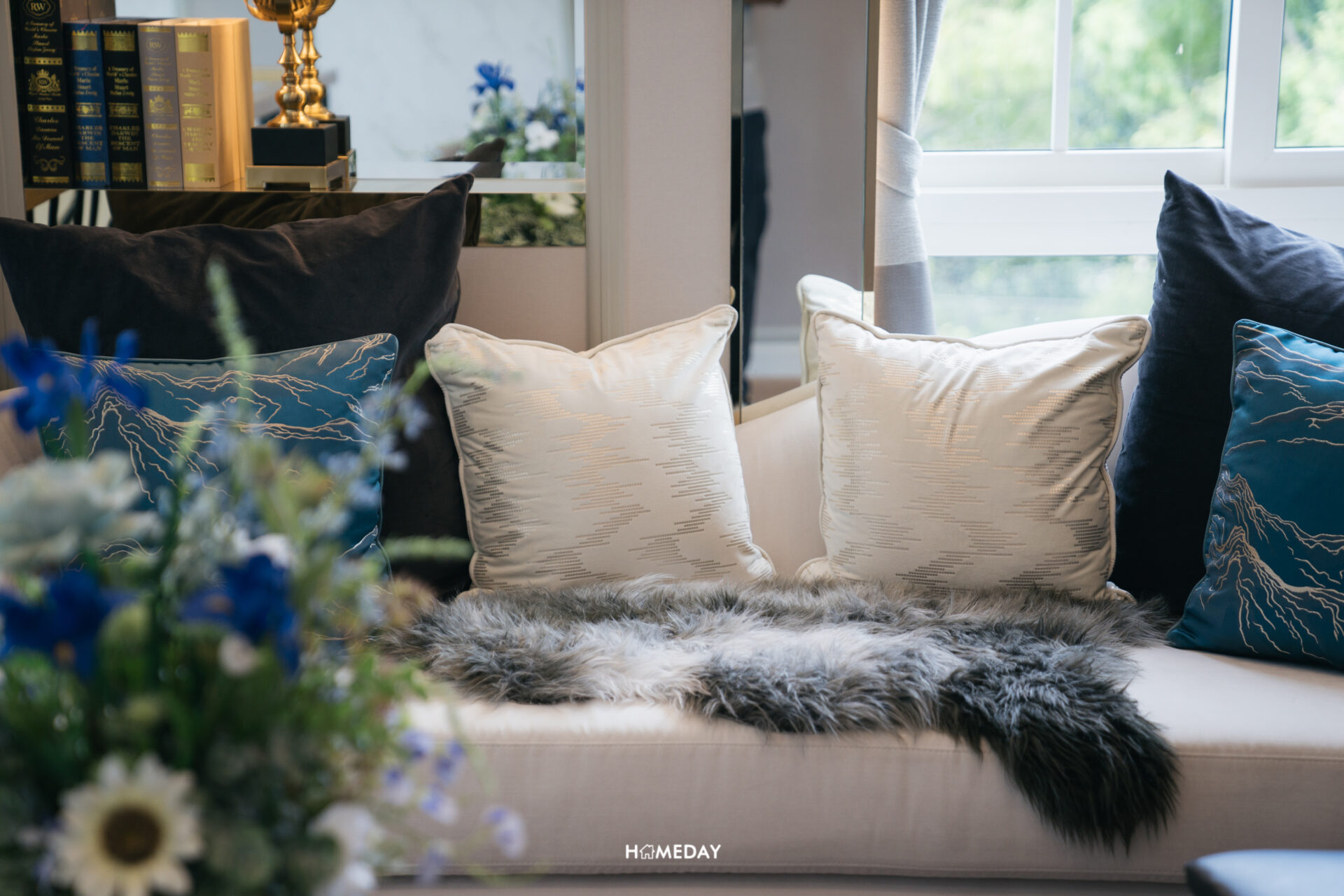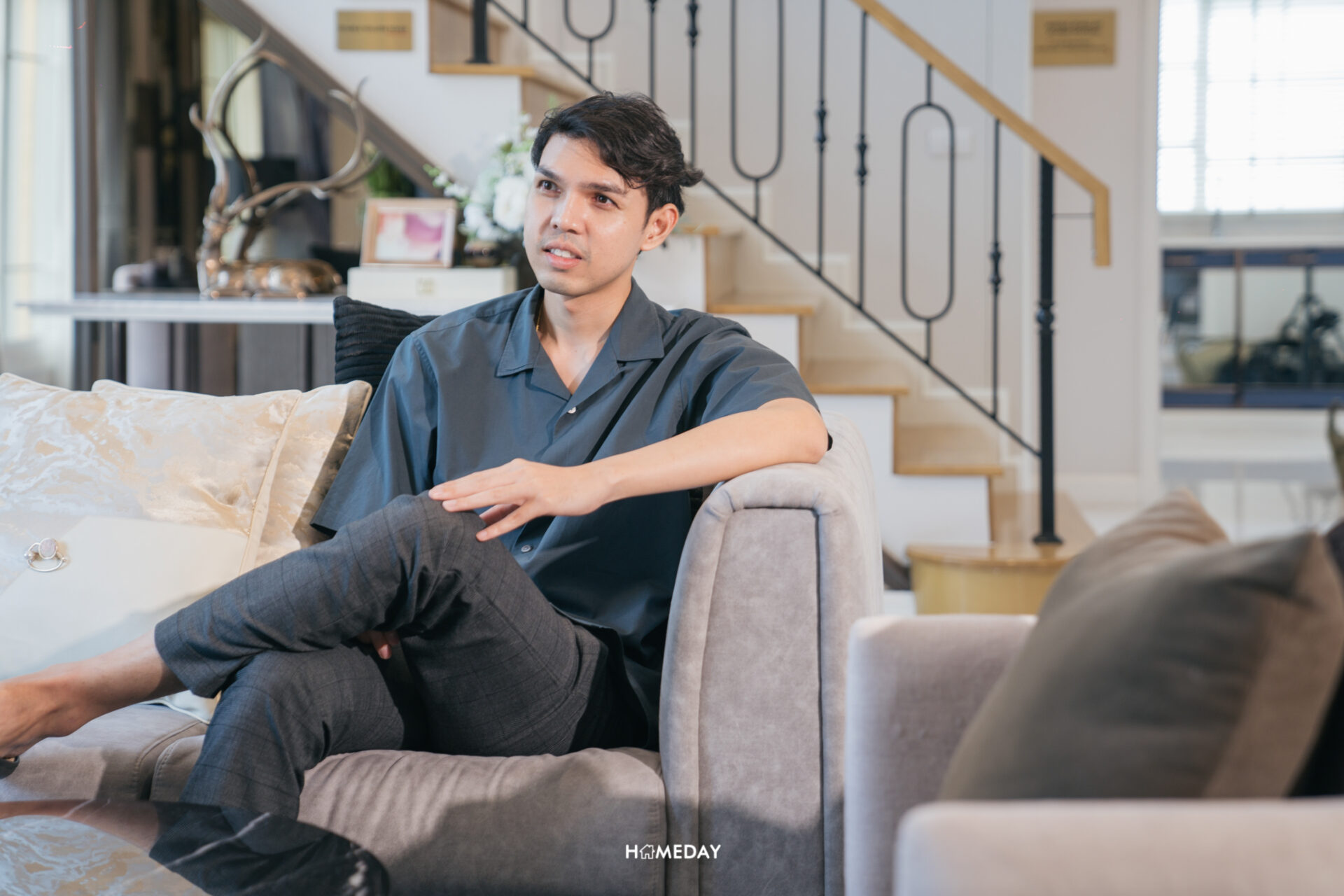 ขวามือส่วนนี้จะเป็นพื้นที่สำหรับนั่งเล่น รับรองแขก สามารถวางชุดโซฟาขนาดใหญ่, อาร์มแชร์, โต๊ะกลาง และชั้นวางทีวีได้ภายในพื้นที่เดียวกันได้อย่างลงตัว โดยบ้านตัวอย่างทางโครงการได้วางโซฟาขนาด 2 ที่นั่งพร้อมด้วยอาร์มแชร์ 2 ตัวและโต๊ะกลางเอาไว้ให้ดูเป็นแนวทางในการตกแต่ง