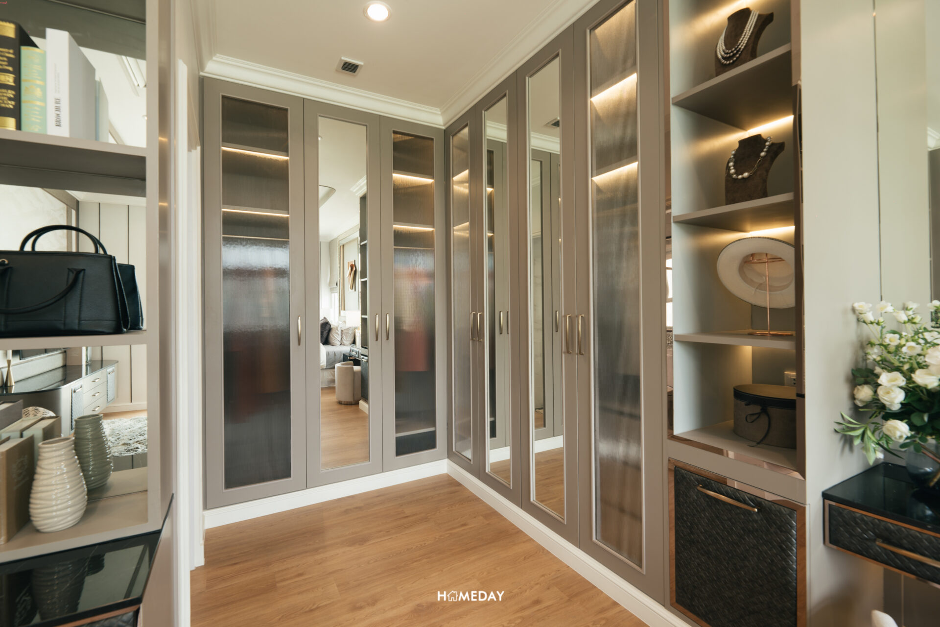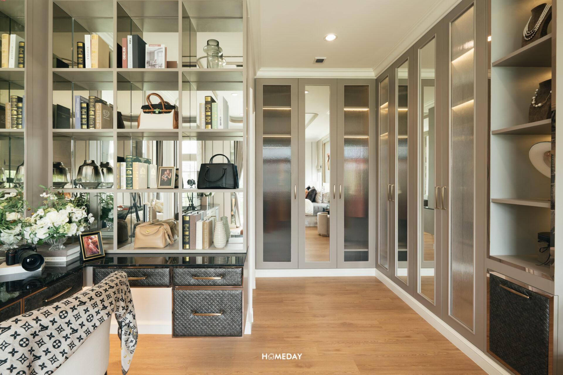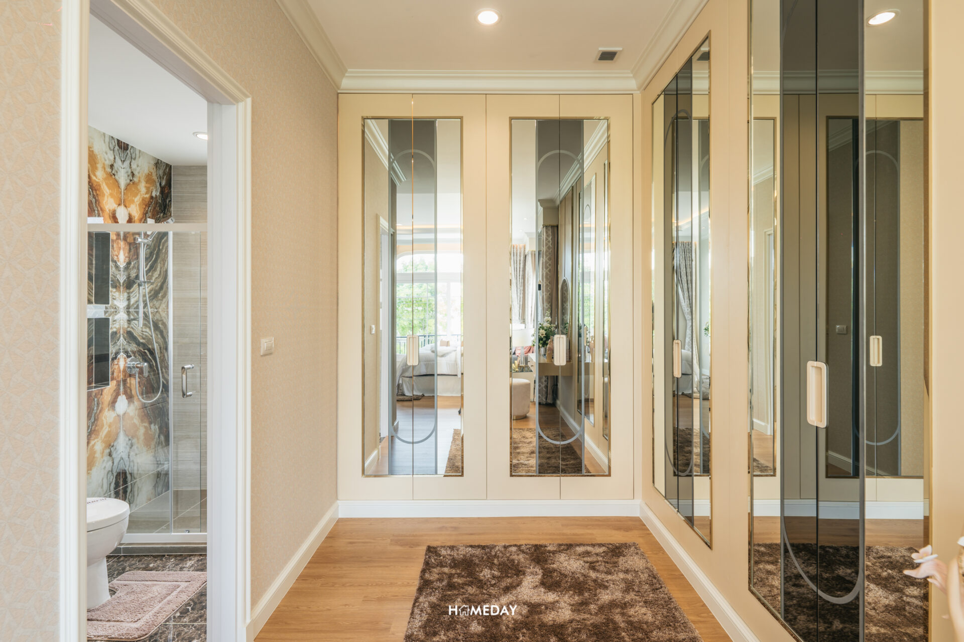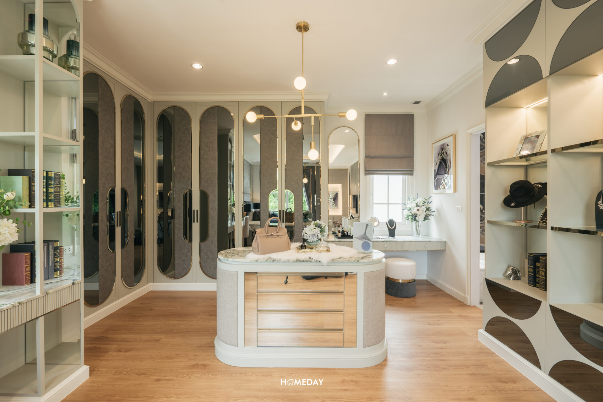 ส่วนโซนทางด้านขวามือจากทางเข้า จะเป็นพื้นที่ที่รองรับไว้สำหรับ Walk-in Closet ขนาดใหญ่ รองรับสำหรับ 2 ท่านได้อย่างเพียงพอ โดยบ้านตัวอย่างก็ได้ออกแบบบิลต์อิน Walk-in Closet เข้ามุมขนาดใหญ่ พร้อมโต๊ะเครื่องแป้ง ตู้ไอซ์แลนด์ และชั้นวางของ พื้นที่นี้ถือเป็นไฮไลท์ของห้องนี้เลยก็ว่าได้ครับ รับรองว่าจัดเก็บเสื้อผ้าและเครื่องประดับต่าง ๆ สำหรับทั้ง 2 ท่านได้อย่างเพียงพอแน่นอน
