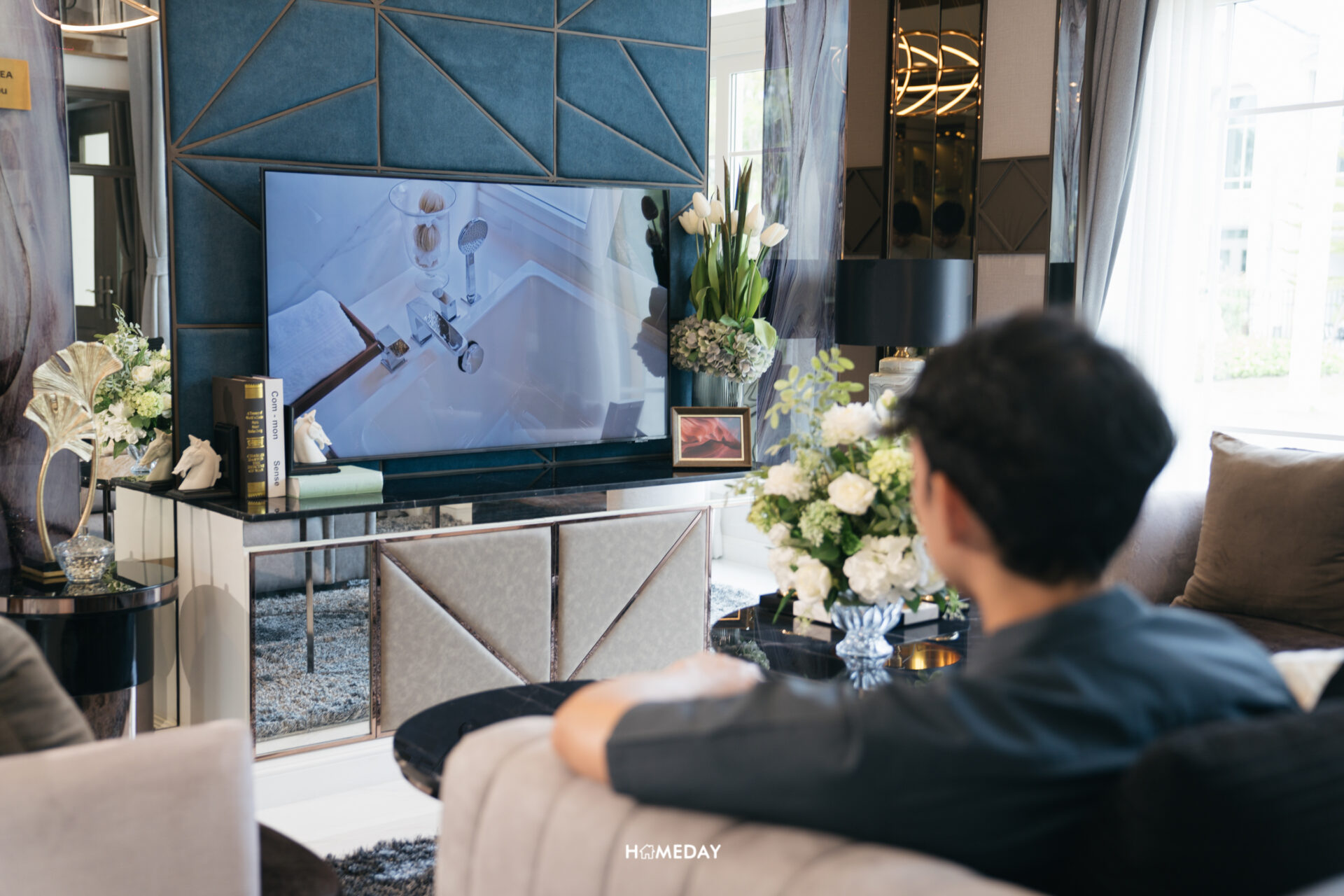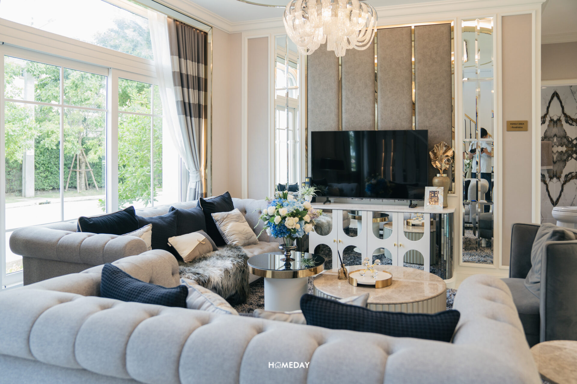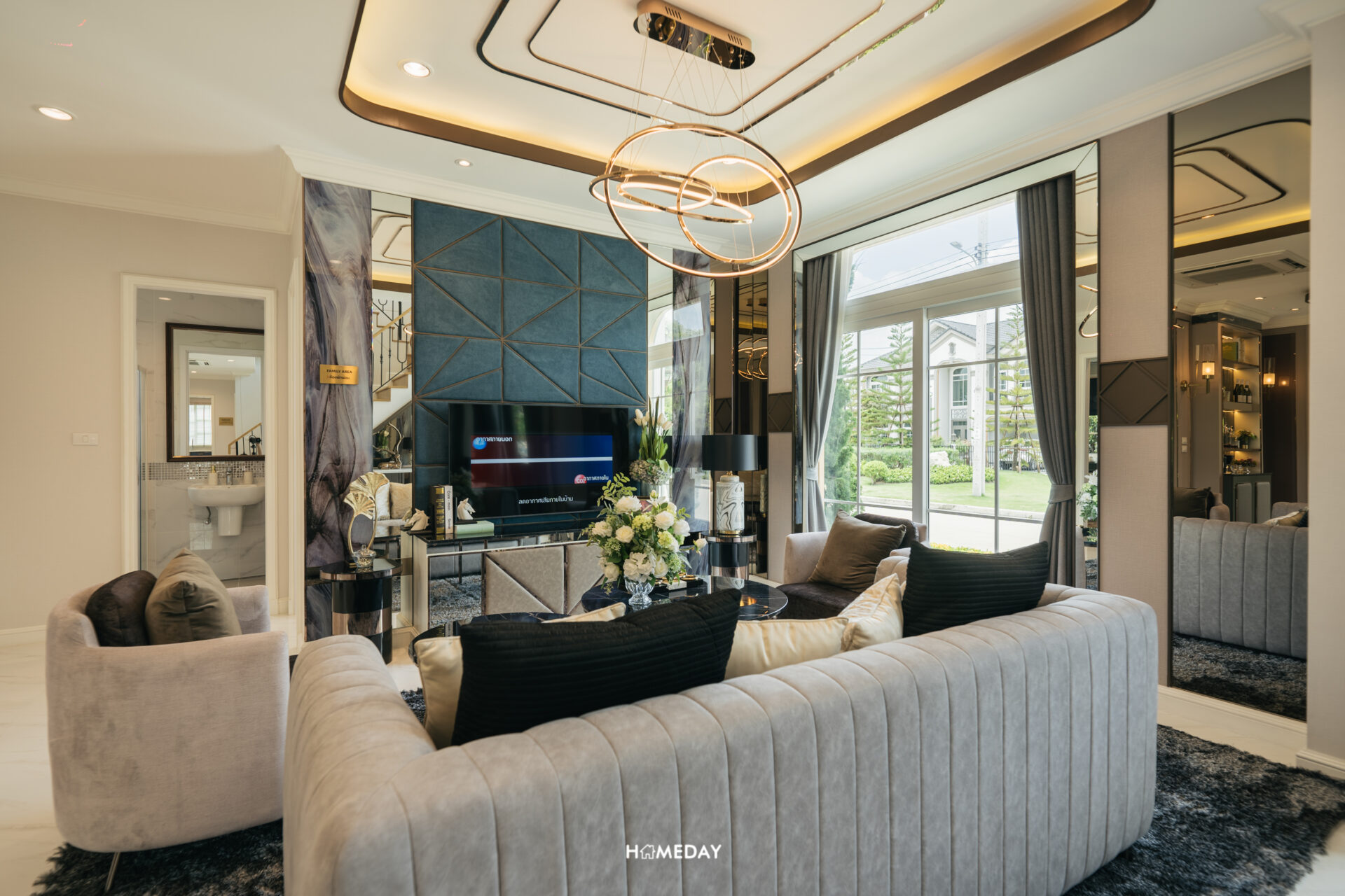 สำหรับ Living Area ทางโครงการออกแบบตกแต่งบ้านตัวอย่างให้ดูเป็นมุมนั่งเล่นขนาดใหญ่ที่สามารถรองรับได้ 5-6 ท่าน ขนาดกำลังลงตัวสำหรับการทำกิจกรรมร่วมกันทั้งครอบครัว หรือจะใช้รองรับแขก นั่งพูดคุยสังสรรค์กันก็เหมาะลงตัวครับ