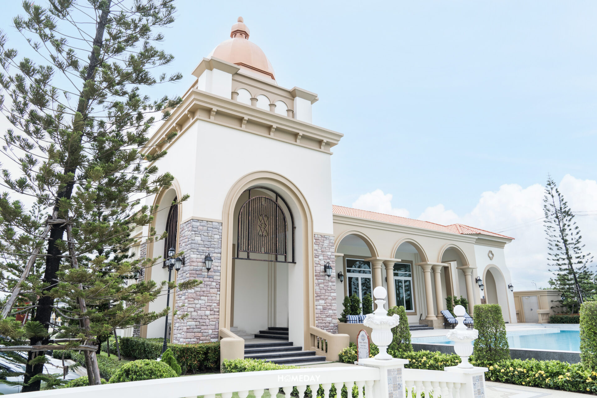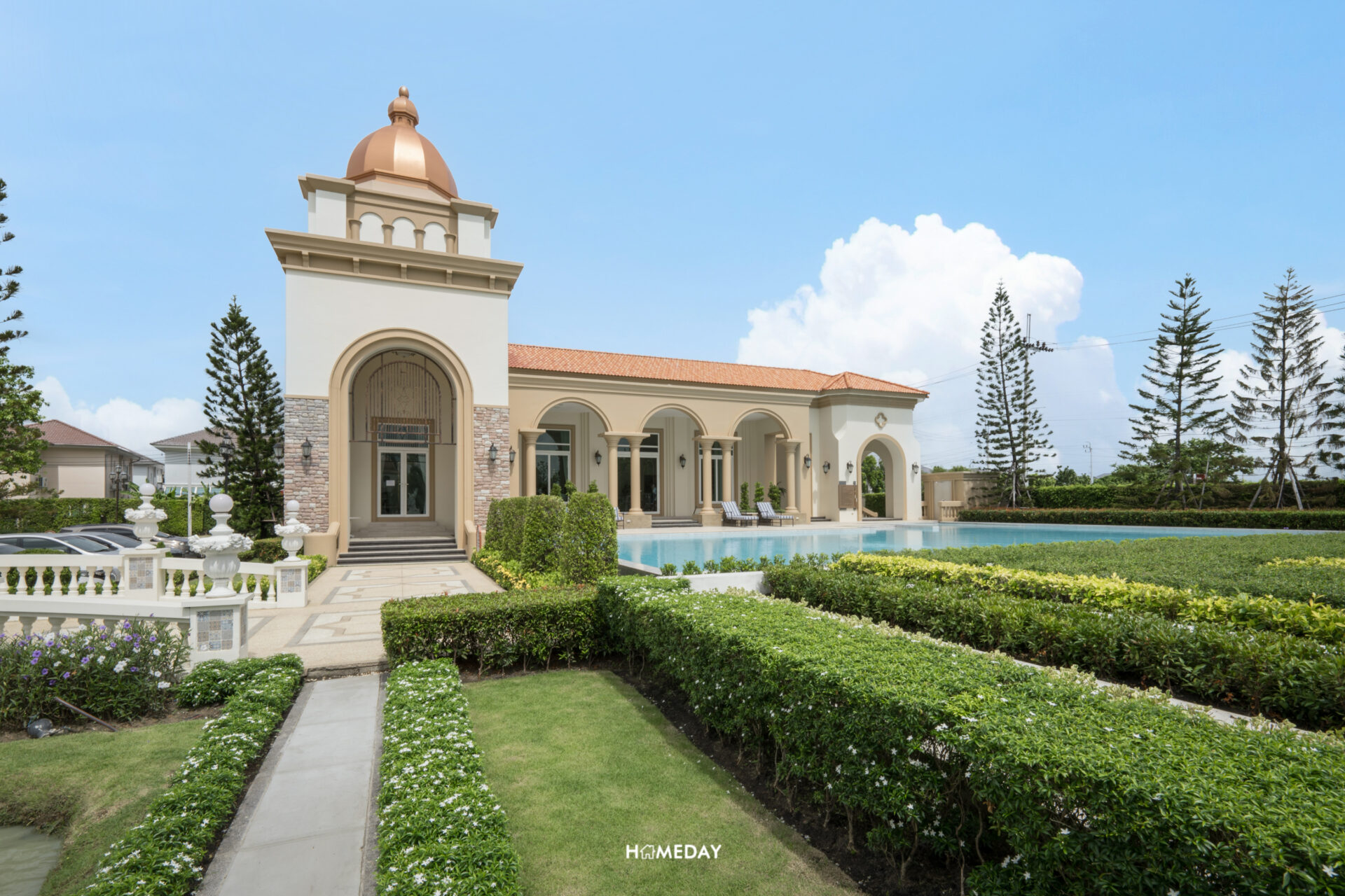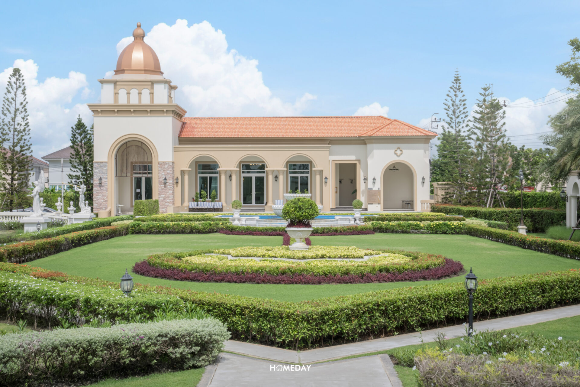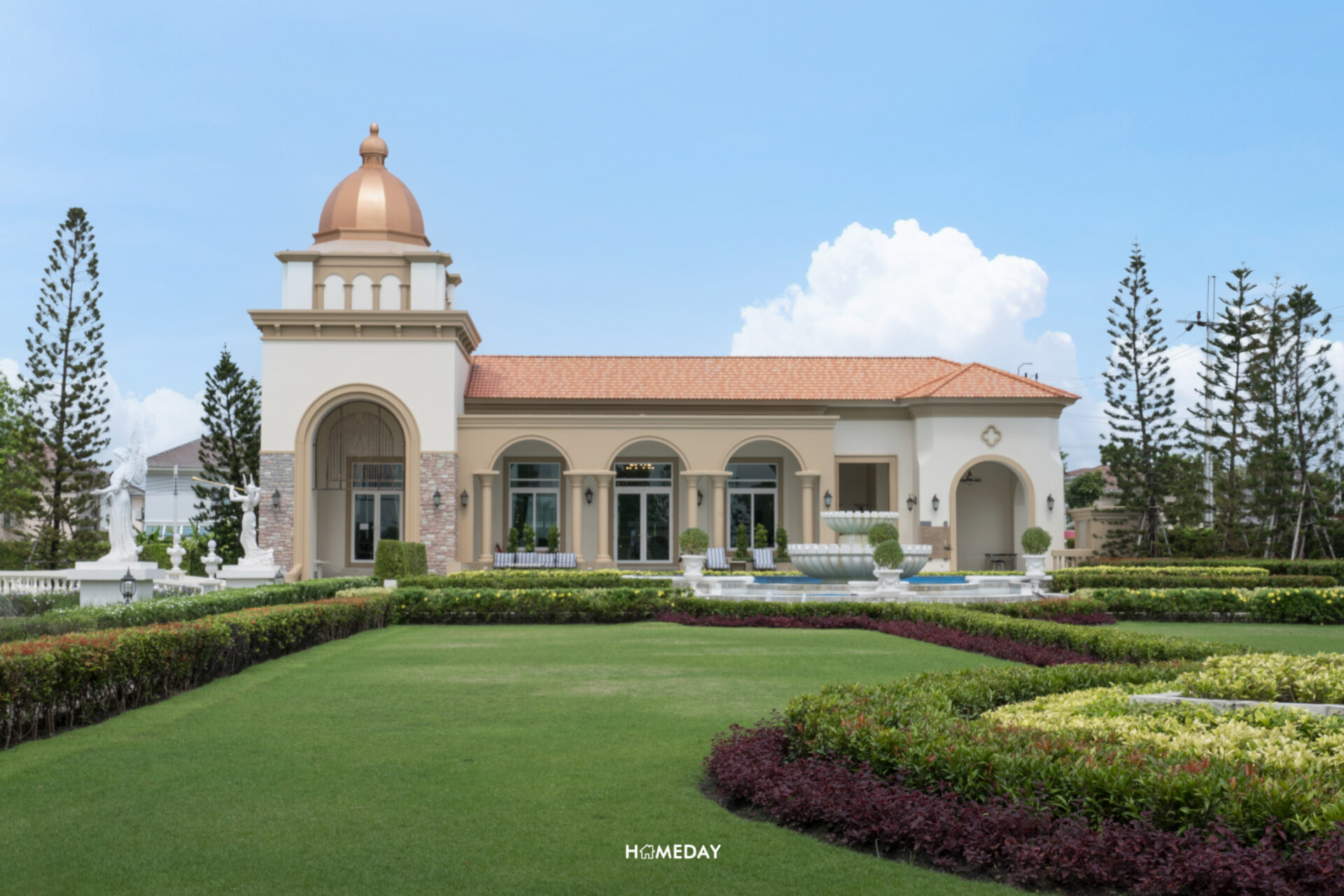 ตัวอาคาร Clubhouse ออกแบบโดยได้รับแรงบันดาลใจมาจากจัตุรัส Plaza De Espana ประเทศสเปน ซึ่งเชื่อมโยงกับงานดีไซน์บริเวณซุ้มทางเข้าได้อย่างลงตัว