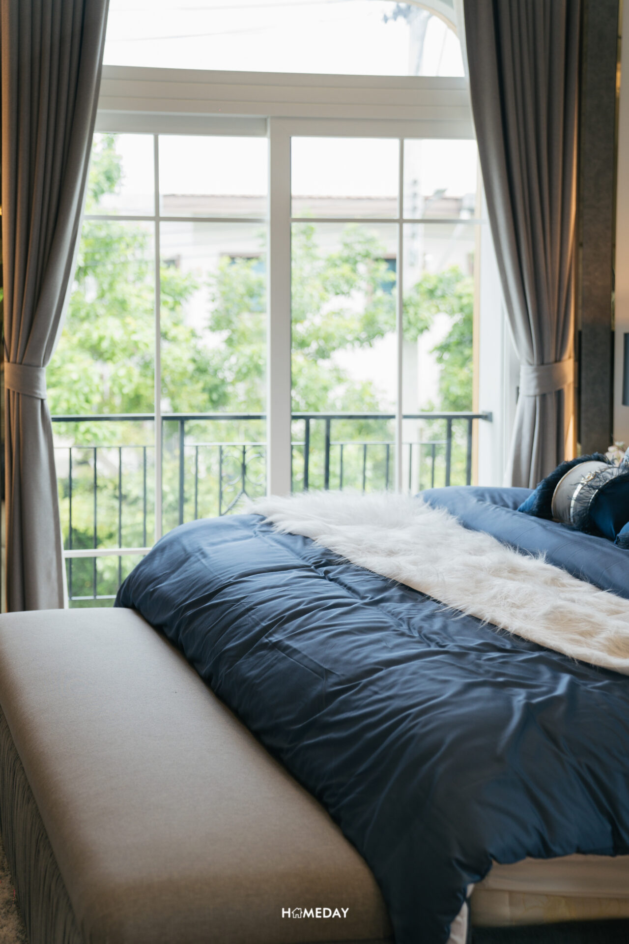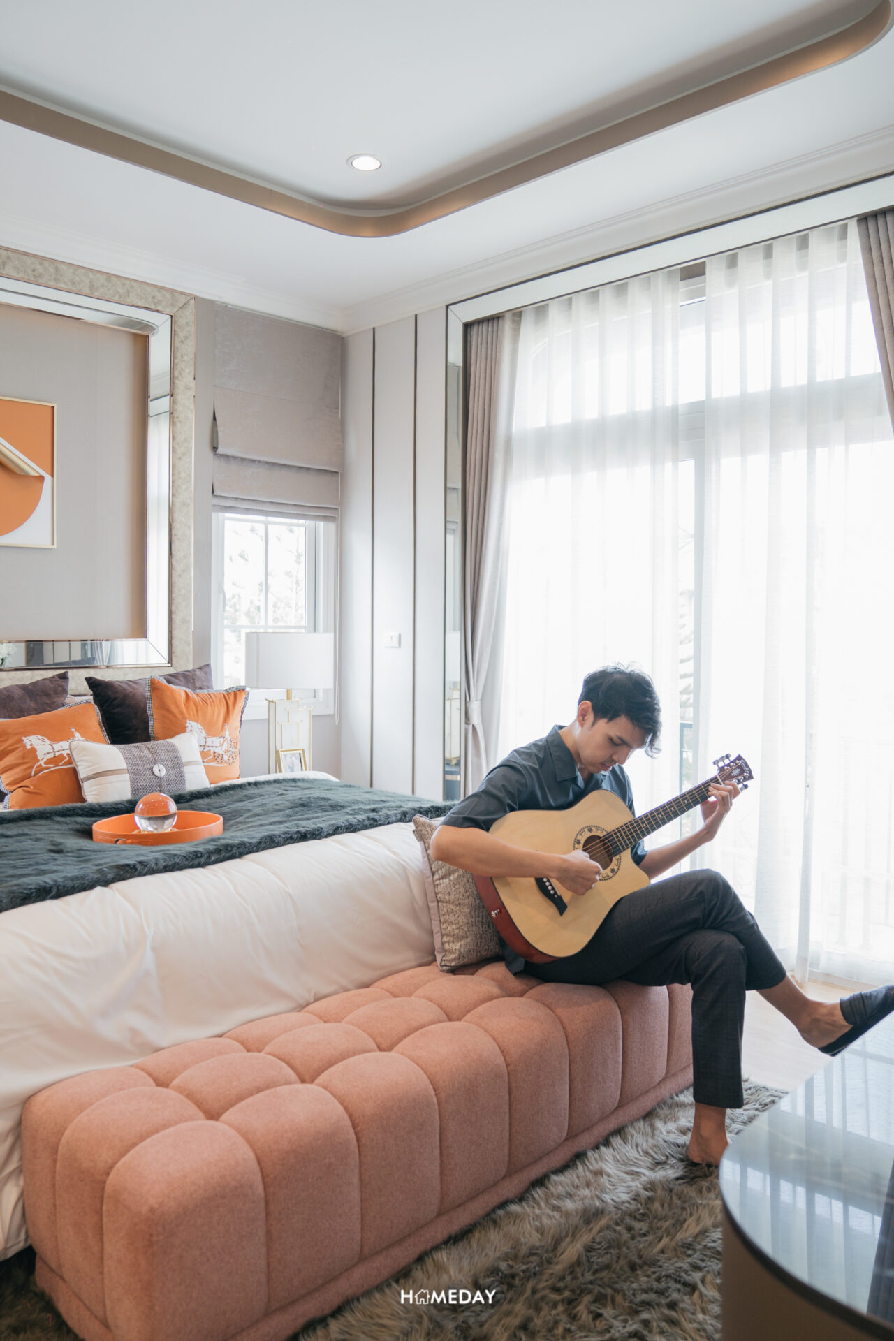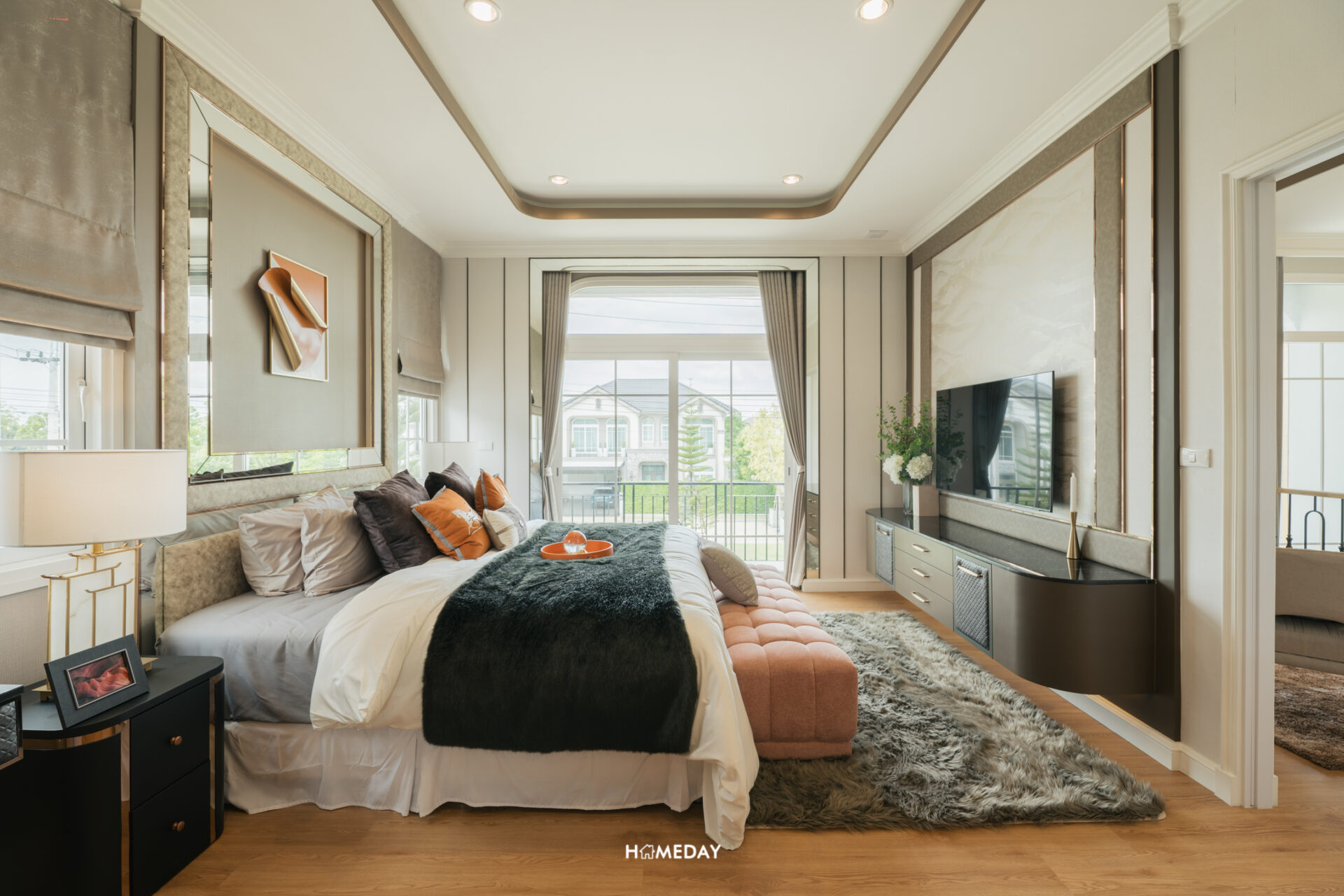 พื้นที่วางเตียงสามารถรองรับขนาด 6 ฟุตได้ครับ รอบเตียงเหลือพื้นที่ให้ใช้งานเยอะ บ้านตัวอย่างใส่ฟังก์ชันให้ดูเป็นโต๊ะหัวเตียงสองฝั่ง, ม้านั่งปลายเตียง และชั้นวางทีวีปลายเตียง ยังเหลือพื้นที่สำหรับเดินผ่านได้อย่างสบาย ๆ