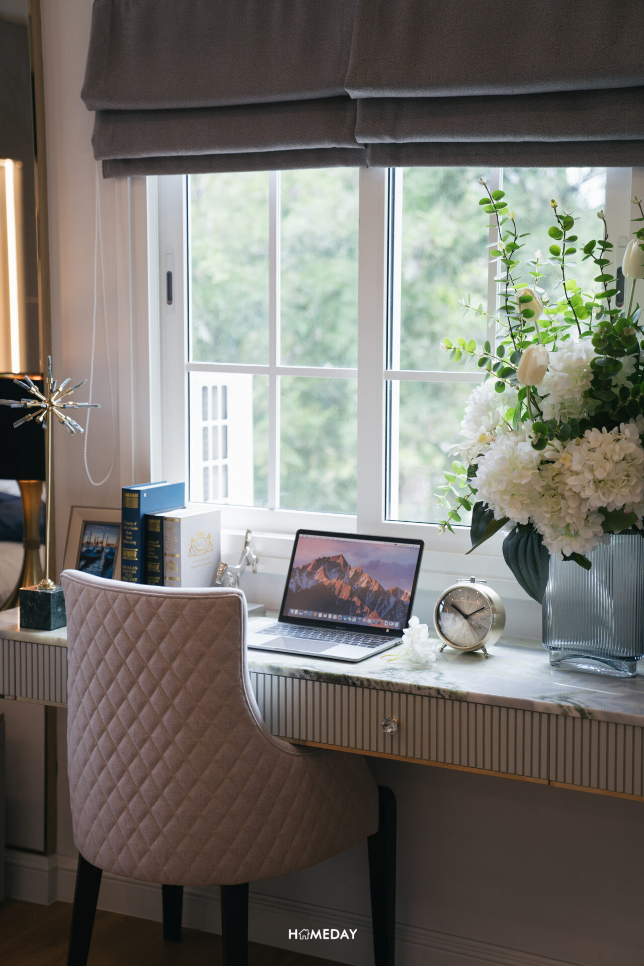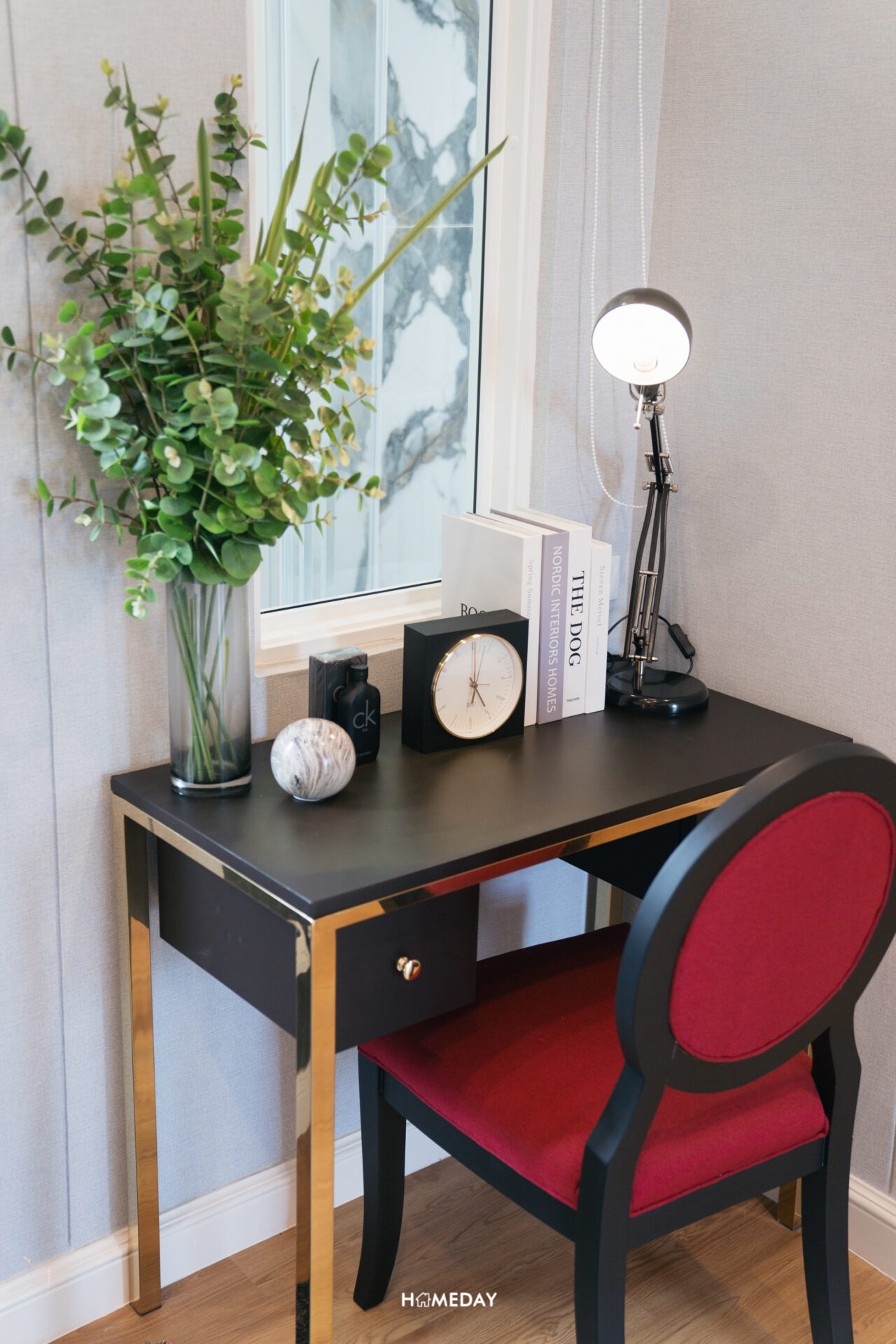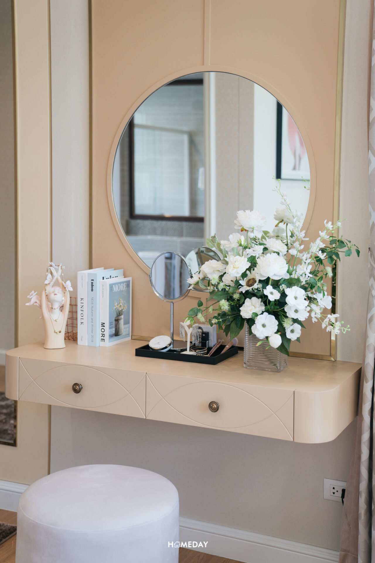 บริเวณกลางห้อง ติดกับเตียง ทางโครงการบิลต์อินเป็นโต๊ะเข้ามุมพร้อมชั้นวางของเข้าชุด ใช้งานแบบอเนกประสงค์ สามารถนั่งทำงานหรือปรับเป็นโต๊ะเครื่องแป้งด้วยก็ได้เช่นกัน