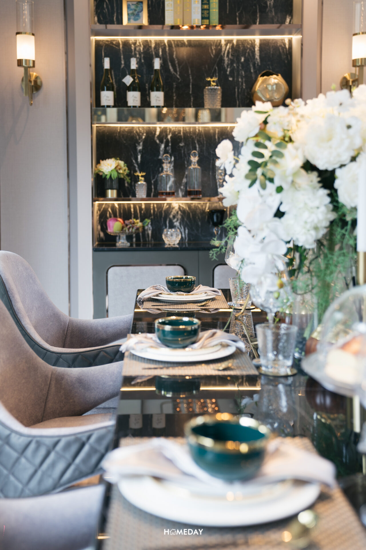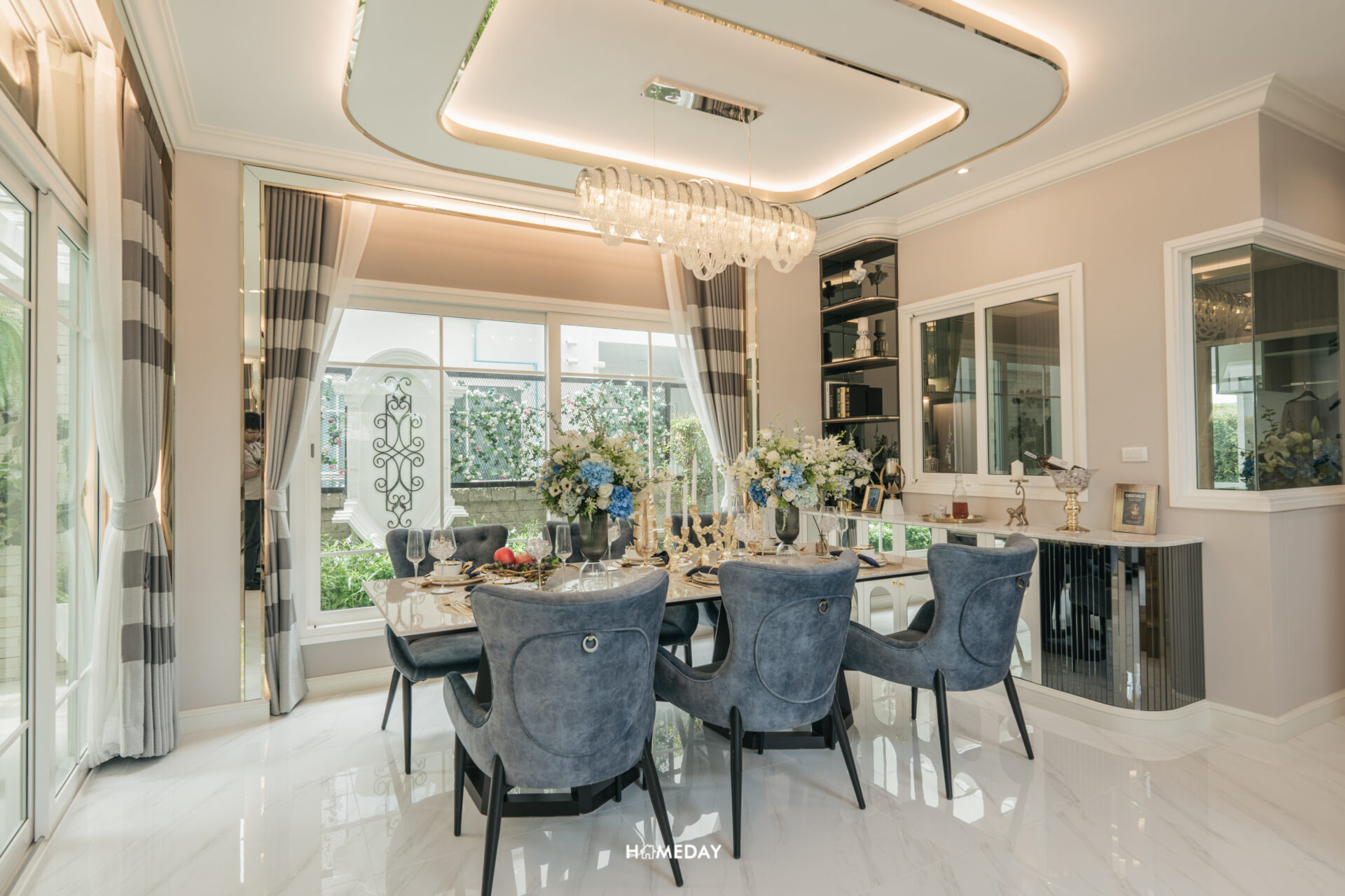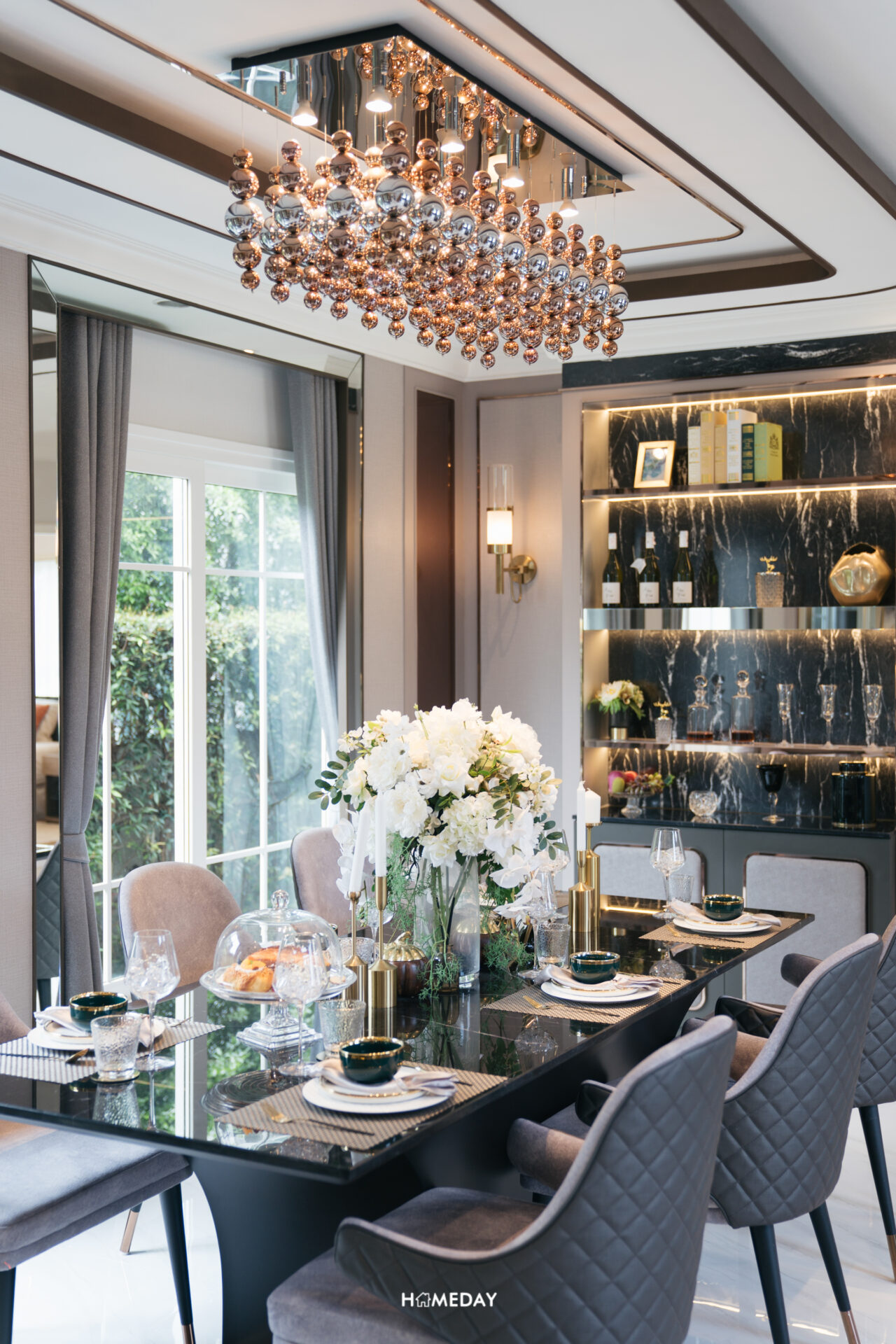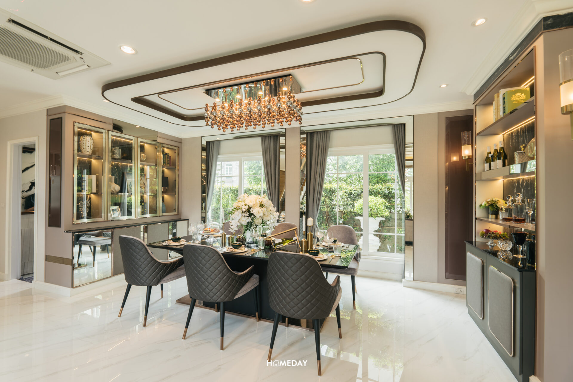 โดยมีการบิลต์อินในส่วนของตู้โชว์เอาไว้ฝั่งหนึ่ง และชั้นบาร์วางเครื่องดื่มอีกฝั่งหนึ่ง จะเห็นได้ว่ายังเหลือพื้นที่รอบบริเวณโต๊ะค่อนข้างเยอะครับ สามารถเดินเข้า-ออกได้สะดวกสบายคล่องตัว แถมมุมนี้ยังได้รับวิวสวนผ่านกระจกบานใหญ่อีกด้วย