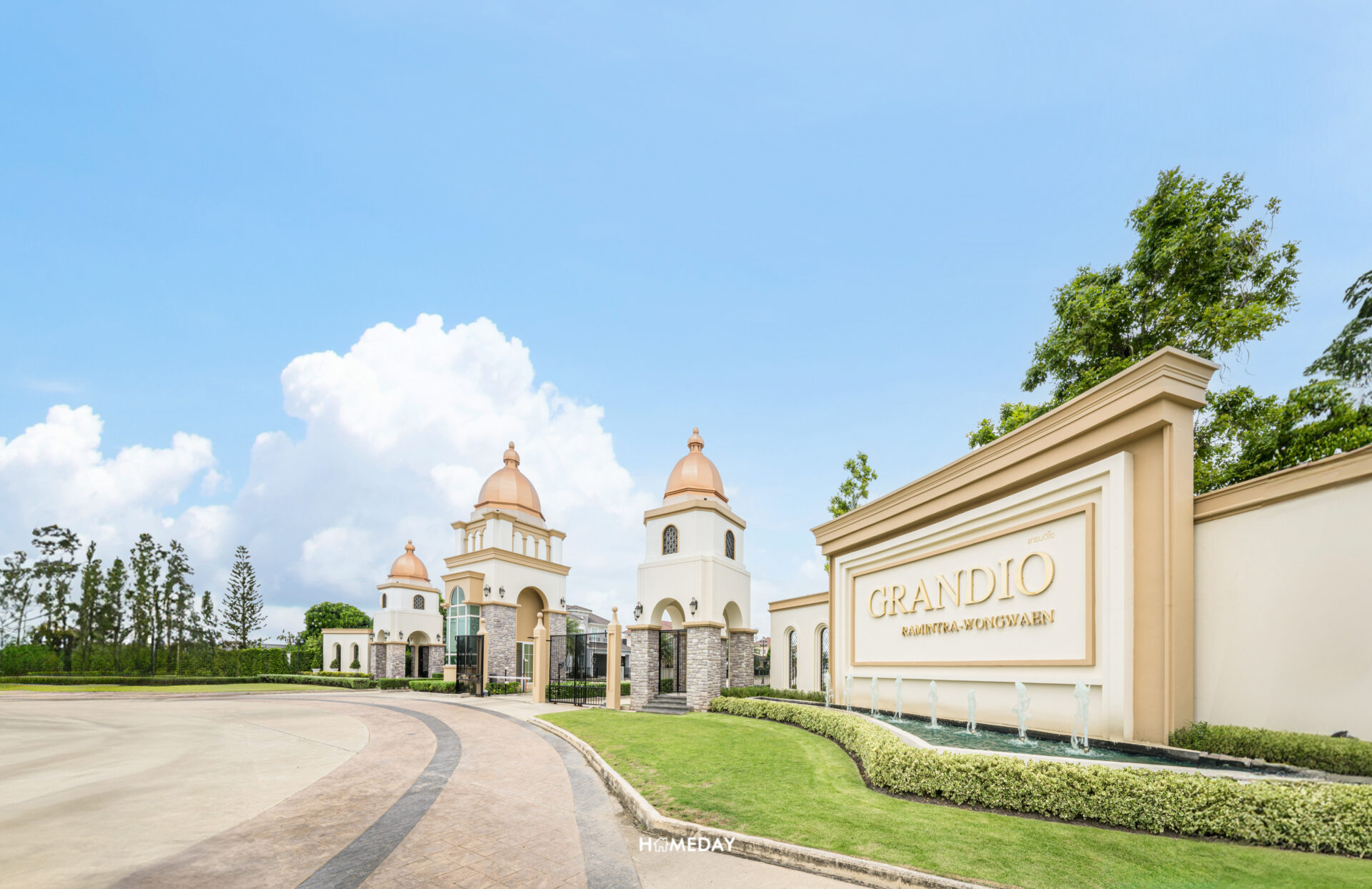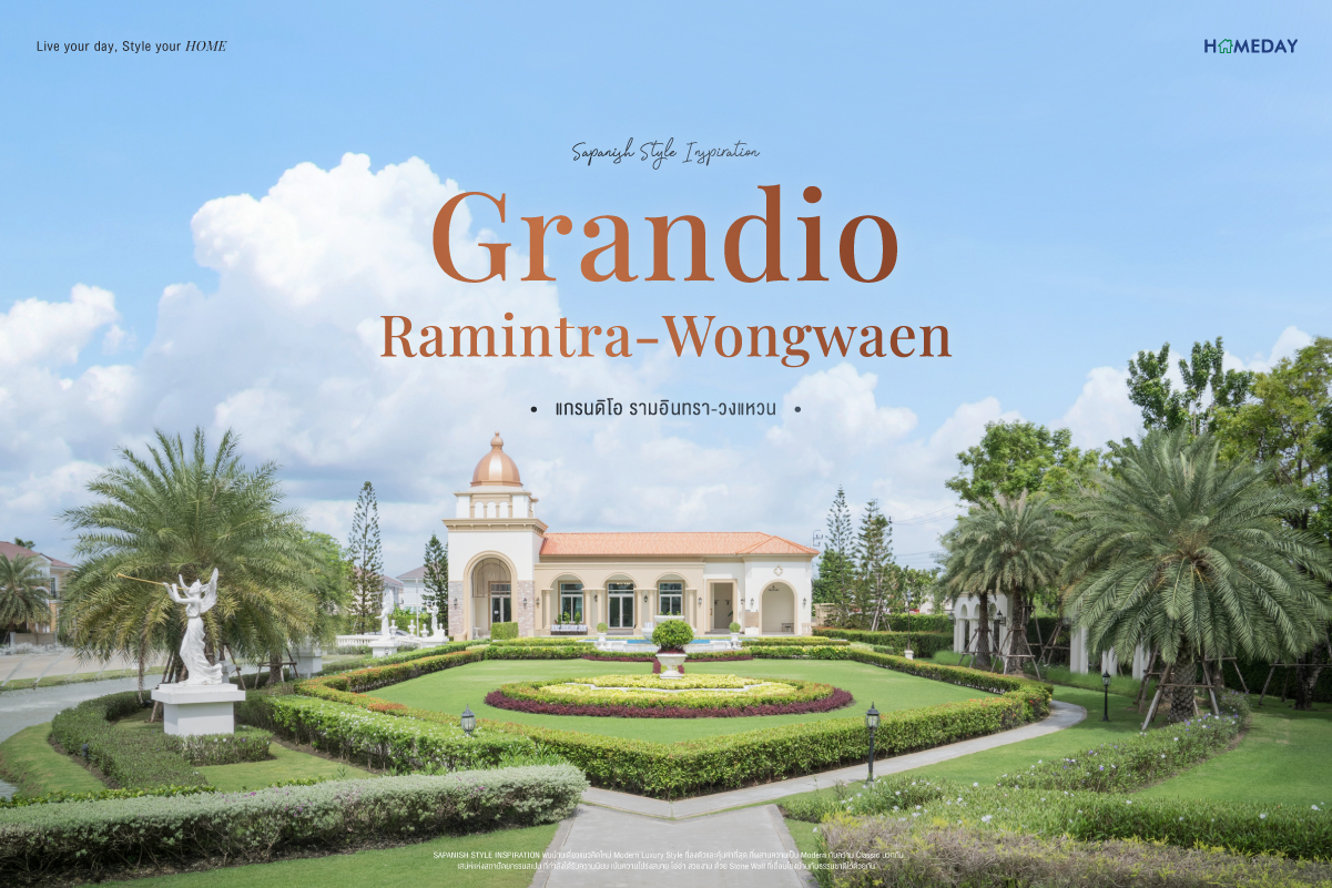 "โครงการ แกรนดิโอ รามอินทรา-วงแหวน (Grandio Ramintra-Wongwaen) SAPANISH STYLE INSPIRATION พบบ้านเดี่ยวแนวคิดใหม่ Modern Luxury Style ที่ลงตัวและคุ้มค่าที่สุด ที่ผสานความเป็น Modern กับความ Classic บวกกับเสน่ห์แห่งสถาปัตยกรรมสเปน ที่กำลังได้รับความนิยม เน้นความโปร่งสบาย โอ่อ่า สวยงาม ด้วย Stone Wall ที่เชื่อมโยงบ้านกับธรรมชาติไว้ด้วยกัน"