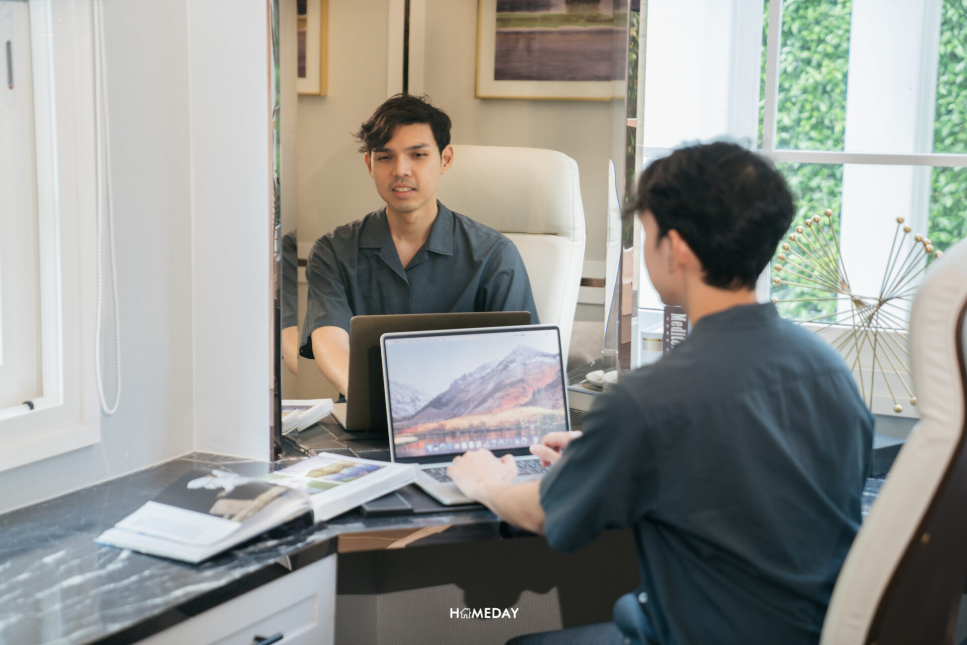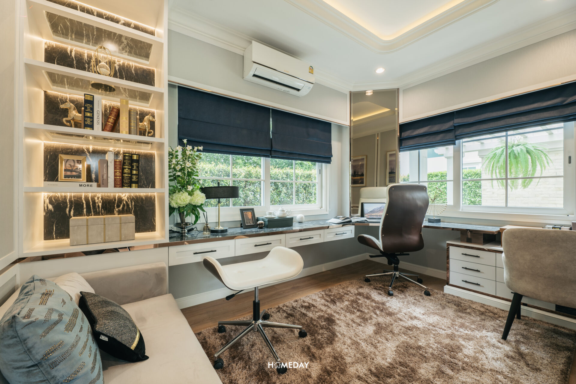 ตรงเข้าไปด้านหลังพื้นที่นั่งเล่น จะเจอกับห้องนอนชั้นล่าง 2 ห้อง ที่คั่นกลางด้วยห้องน้ำครับ โดยห้องแรกทางด้านซ้ายมือ เป็นห้องที่มีลักษณะหน้ากว้าง ทางโครงการออกแบบตกแต่งห้องนี้ให้ดูเป็นห้องทำงานส่วนตัว ภายในออกแบบบิลต์อินโต๊ะทำงานตัวยาวทรง L พร้อมมุมพักผ่อนและตู้หนังสือ ตัวห้องได้ช่องแสงเป็นบานหน้าต่างขนาดใหญ่สองฝั่งเพิ่มความโปร่งให้กับห้อง ซึ่งบ้านจริงเราสามารถปรับฟังก์ชันการใช้งานไปตามความต้องการของเราได้เลยครับ