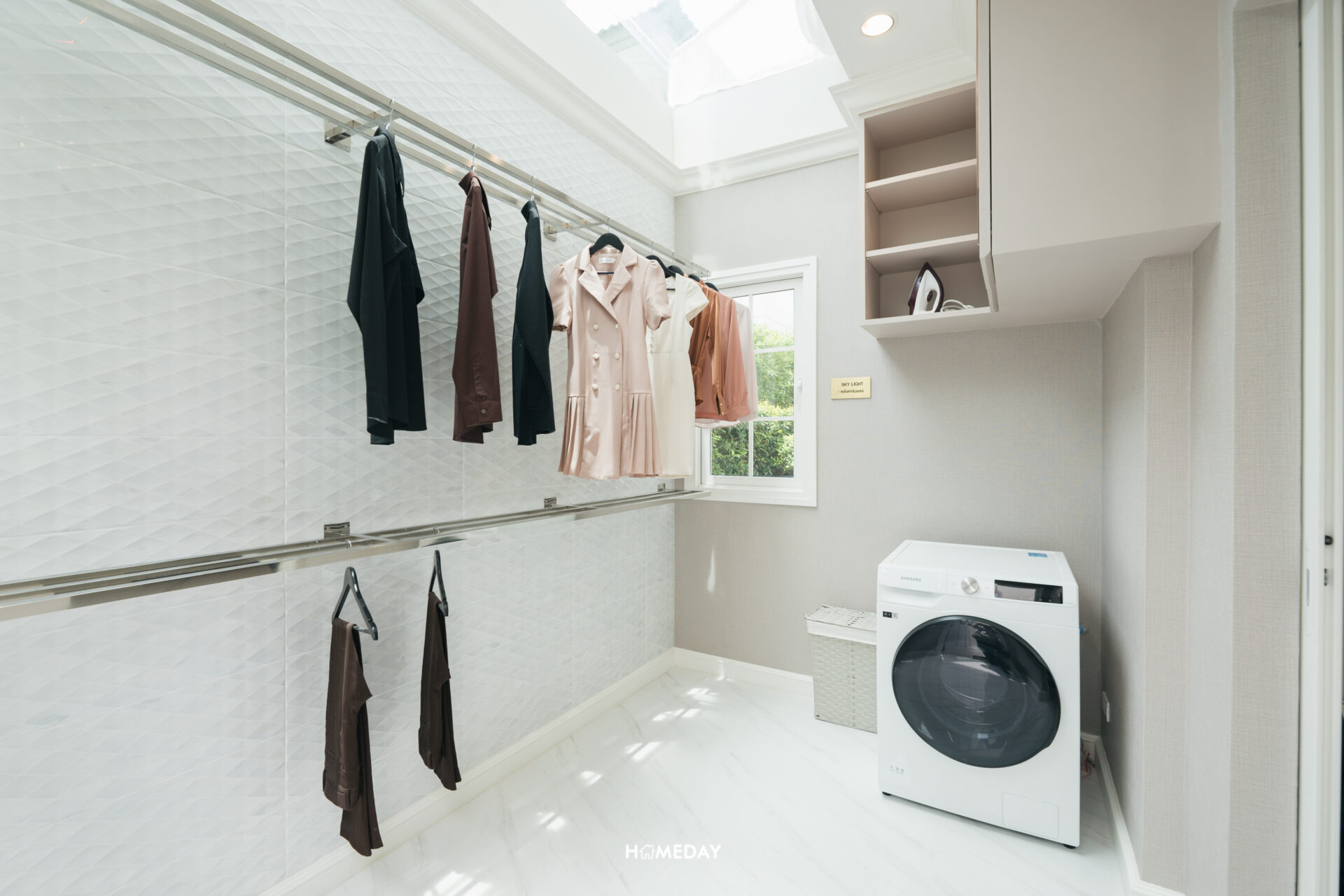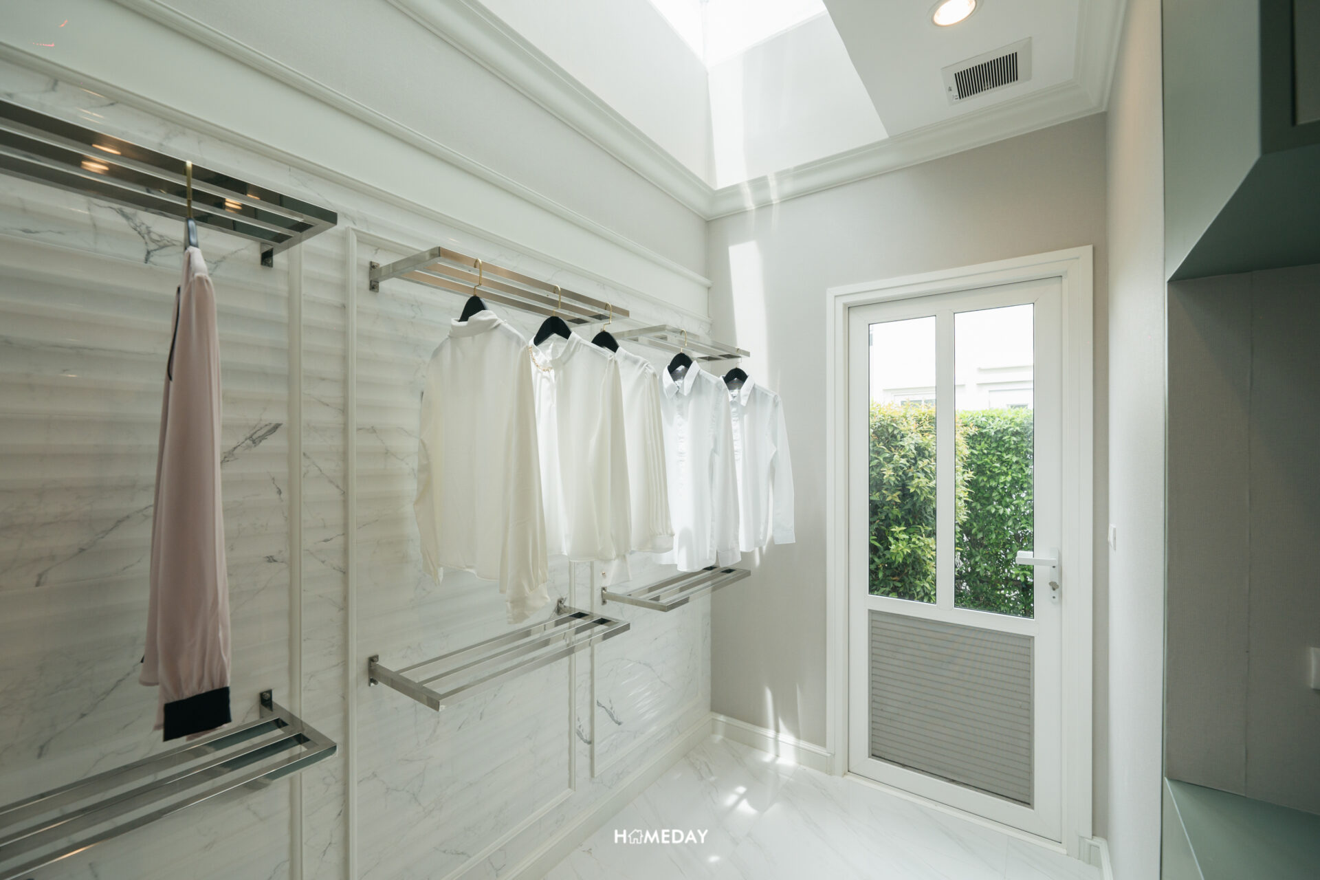 ส่วนทางด้านซ้าย จะเป็นบริเวณ Glass House บนฝ้าเป็นกระจก รับแสงธรรมชาติ ซึ่งเราสามารถบิลต์อินราวแขวนเพื่อตากผ้าที่บริเวณนี้ได้เลยครับ ตากผ้าได้เยอะจุใจ ผ้าแห้ง ไม่ต้องกลัวโดนฝน ไม่ต้องกลัวเปื้อนฝุ่นหรือมลภาวะนอกบ้าน
