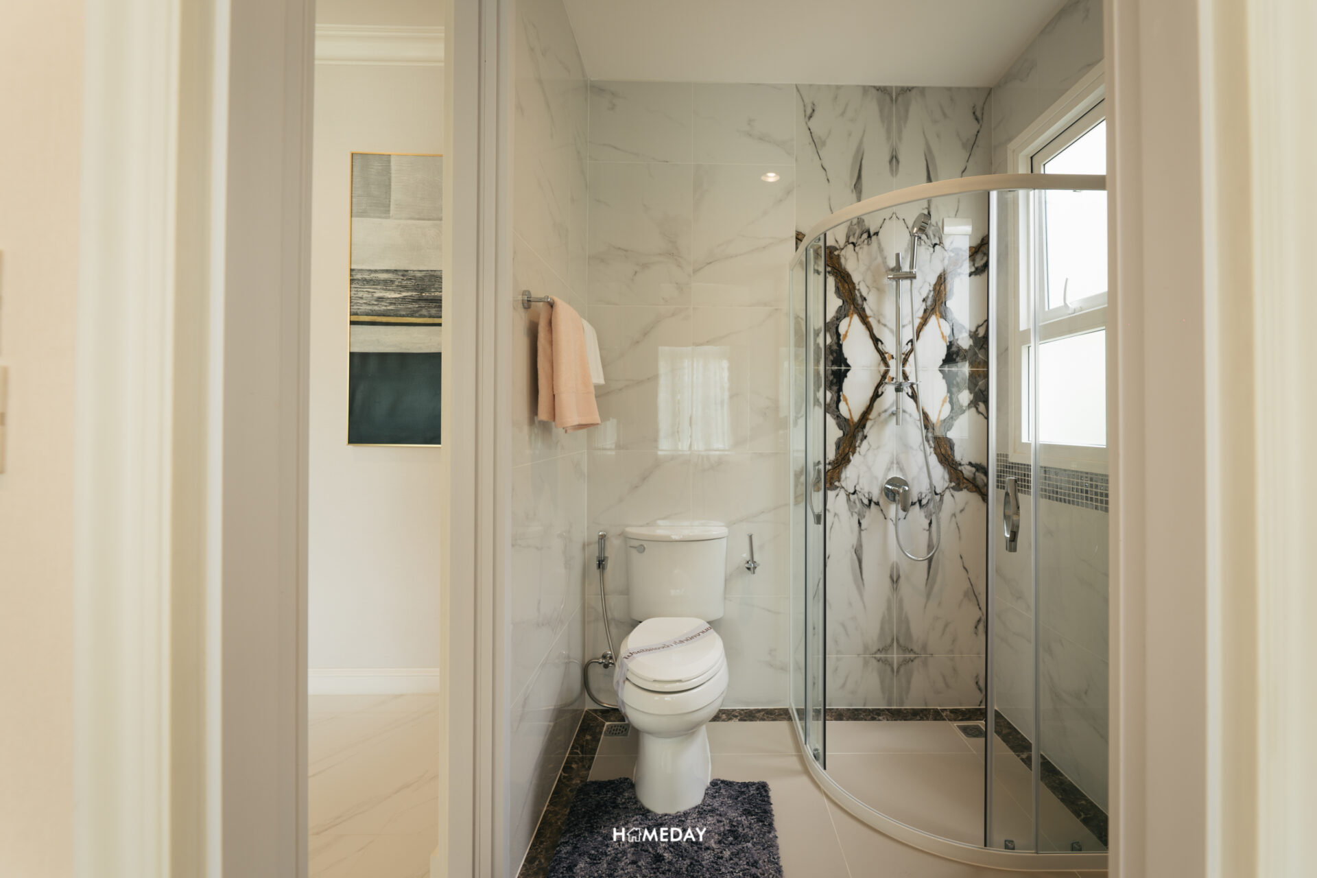 ตัวห้องมาพร้อมห้องน้ำในตัวครับ เปิดเข้ามาจะเจอกับโถสุขภัณฑ์และอ่างล้างหน้าก่อน บานกระจกได้บานกว้างขนาดใหญ่เพิ่มความโปร่งให้กับห้องน้ำได้เพิ่มขึ้น ตรงข้ามกับโถสุขภัณฑ์จะเป็น Shower Box กั้นด้วยกระจกนิรภัยบานเลื่อน ด้านในได้ Hand Shower และบานหน้าต่างระบายอากาศมาให้