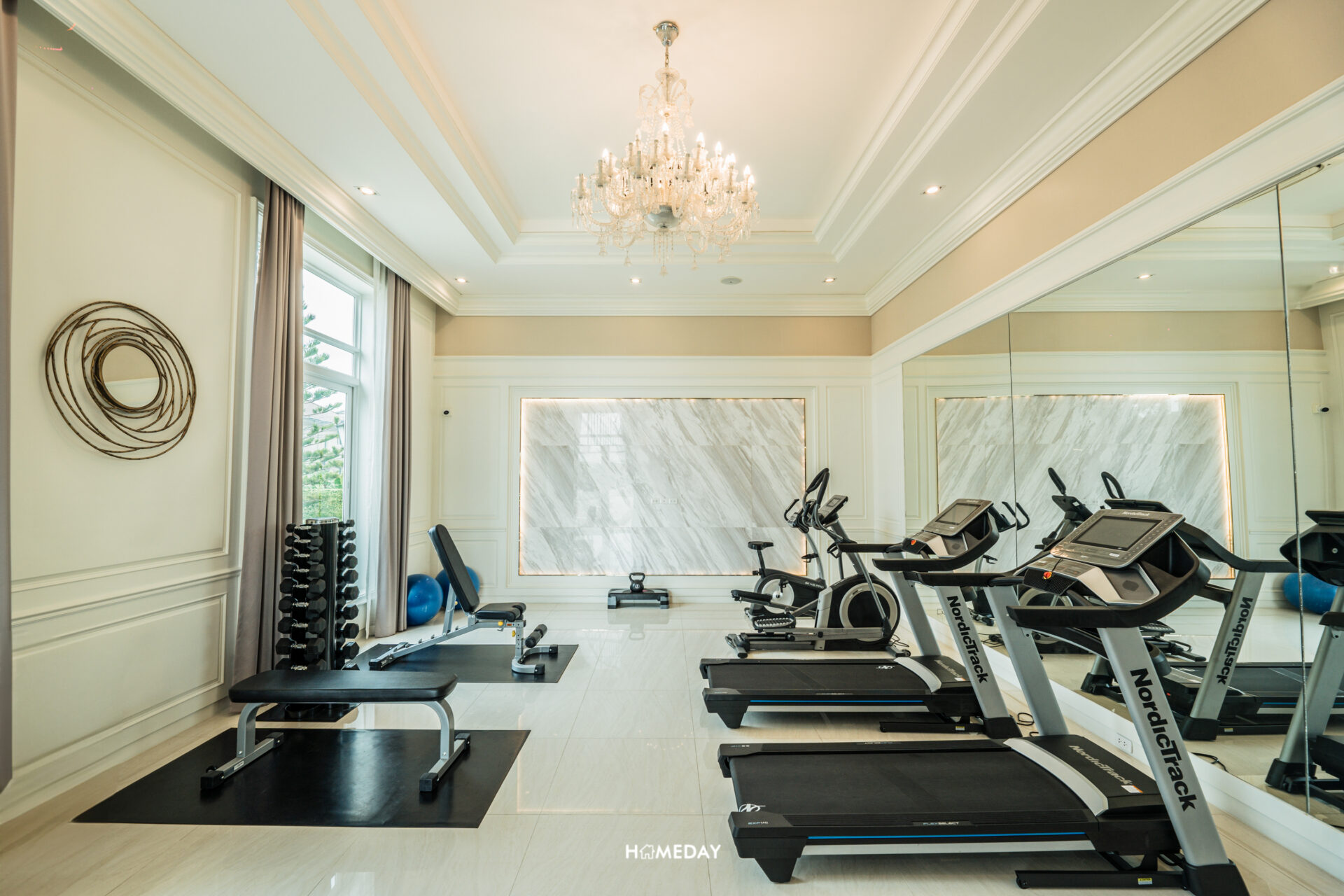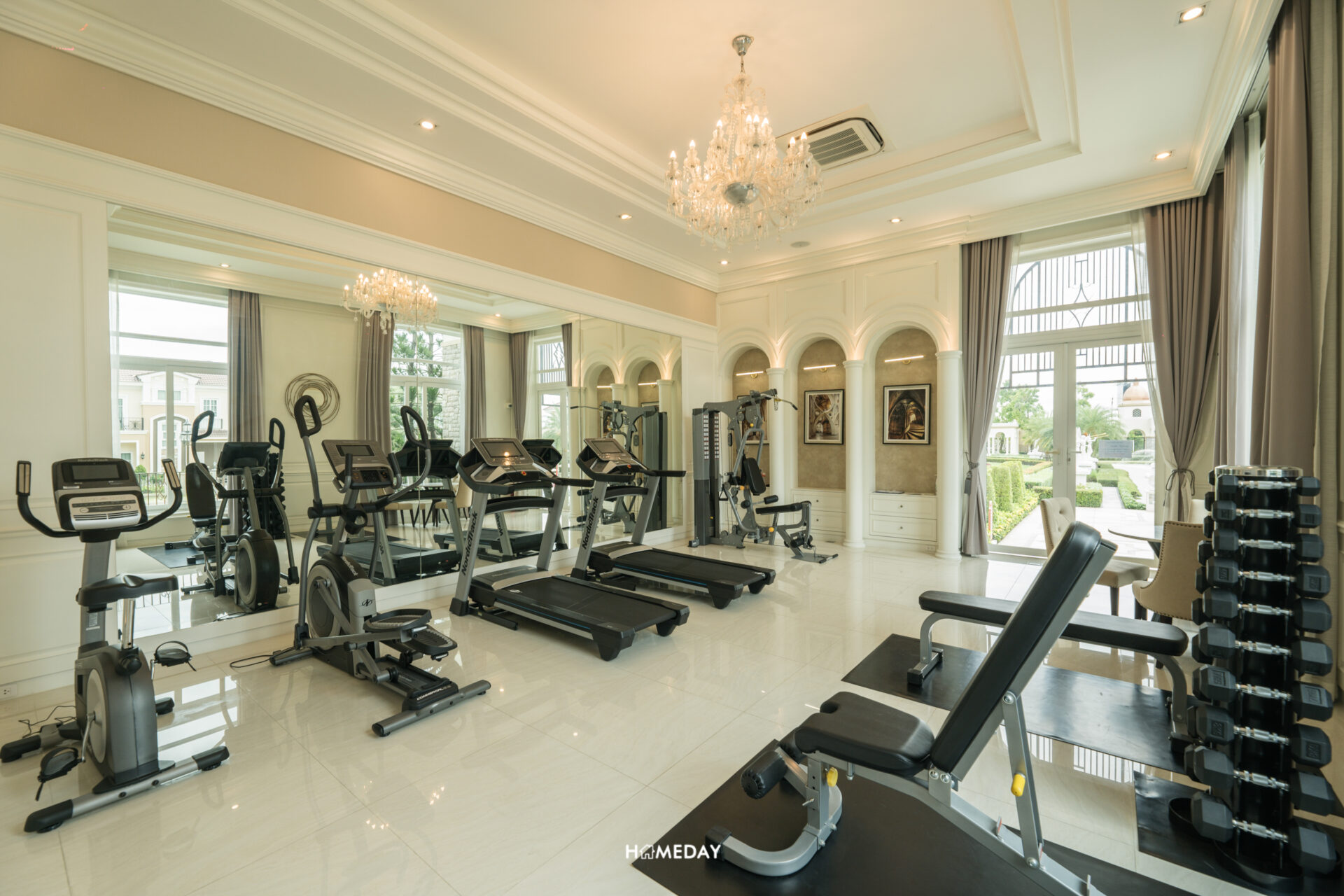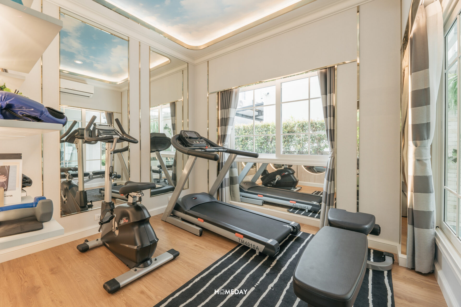 ตรงข้ามกับห้องนอนชั้นล่างจะเป็นห้องอเนกประสงค์ครับ ตัวห้องนี้ก็เป็นอีกห้องที่ได้วิวของสระว่ายน้ำ บ้านตัวอย่างออกแบบเอาไว้เป็นห้องฟิตเนสส่วนตัวในบ้าน ขนาดพื้นที่สามารถวางเครื่องเล่นได้หลากหลายทีเดียวครับ บ้านจริงห้องนี้เราก็สามารถออกแบบเป็นห้องอื่น ๆ ตามไลฟ์สไตล์ได้เช่นกัน