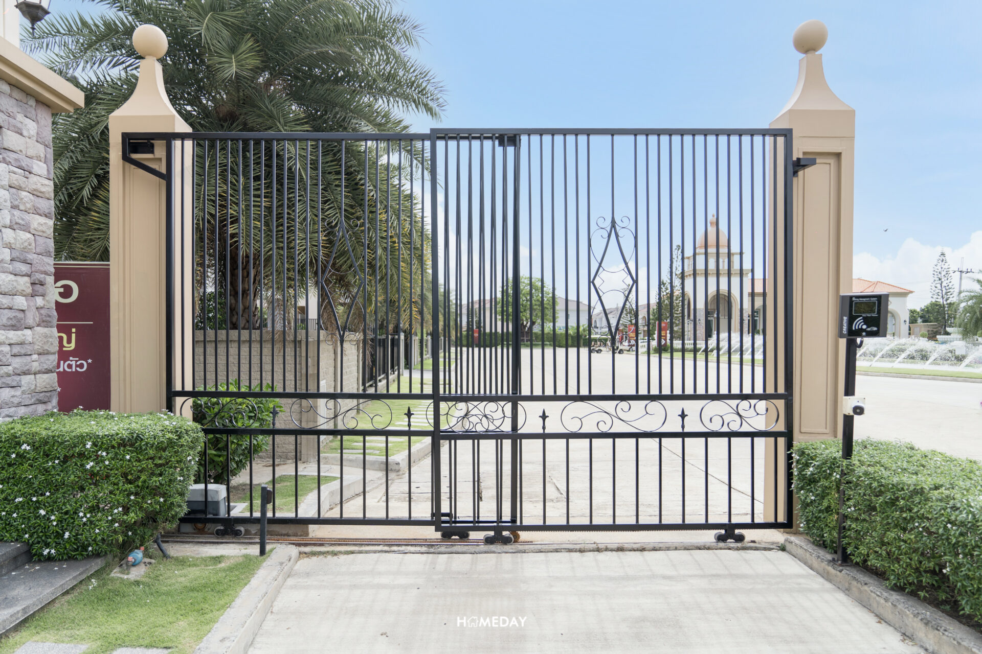 ซุ้มทางเข้าโครงการอลังการ โอ่อ่า สมฐานะ สถาปัตยกรรม Spanish Style ด้วยองค์ประกอบ Stone Wall และ Arch ผสานความเป็น Modern กับความ Classic ได้อย่างลงตัว