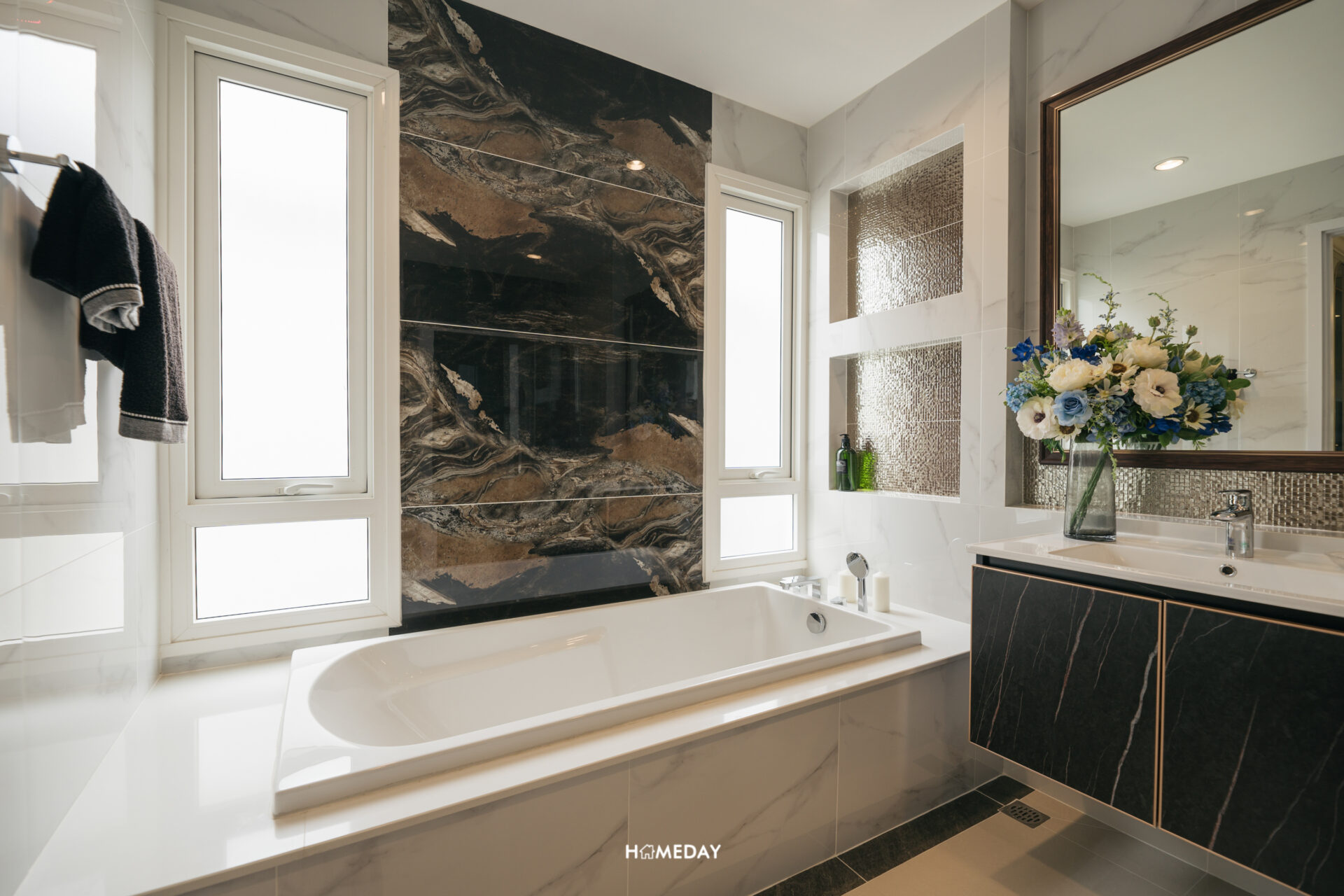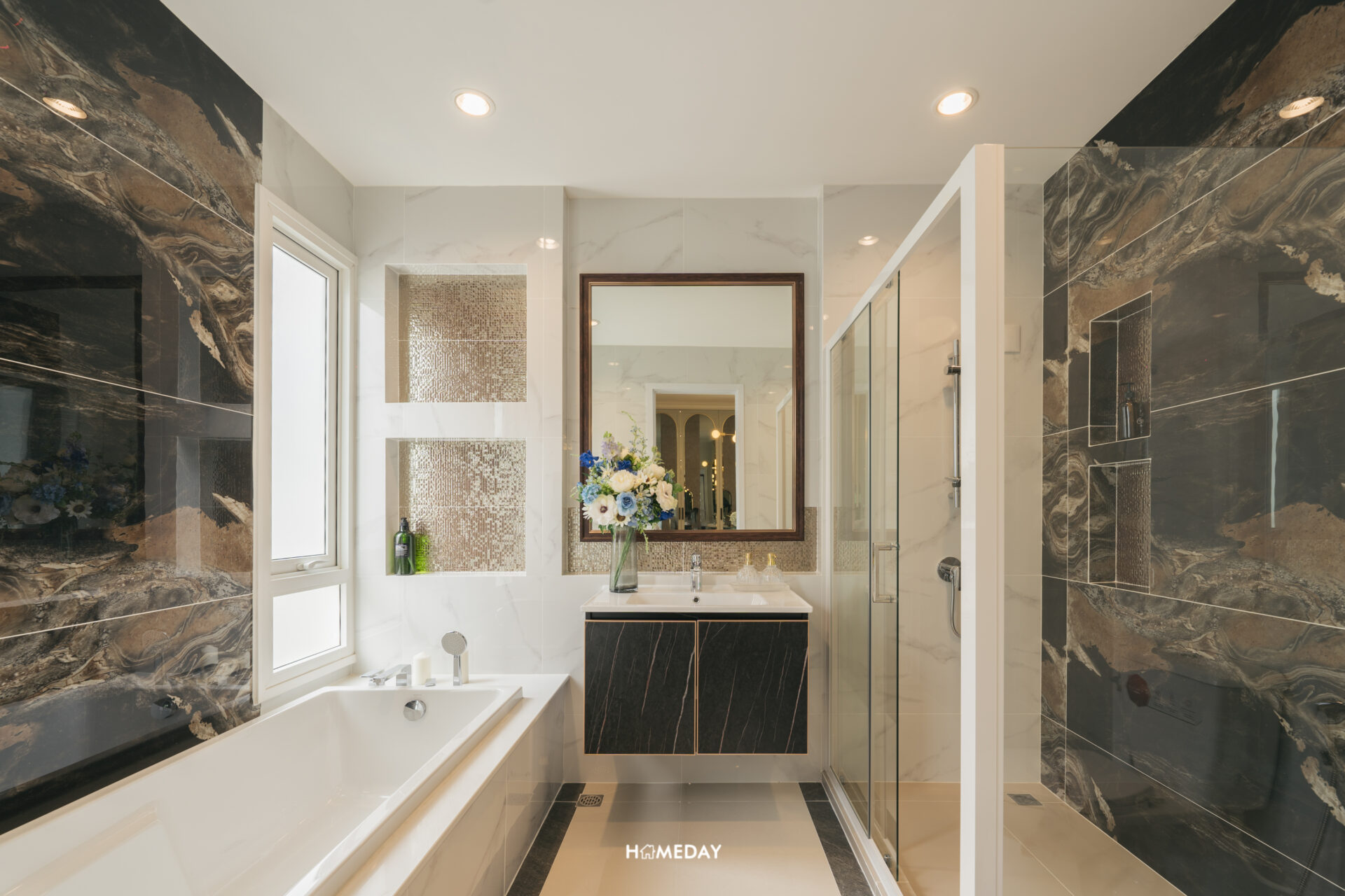 Walk-in Closet ได้พื้นที่อลังการไปแล้ว ห้องน้ำเองก็ไม่แพ้กันครับ เข้ามาถึงซ้ายมือจะเจอกับอ่างอาบน้ำก่อนเลย บริเวณผนังได้ Drop Wall สำหรับวางขวดผลิตภัณฑ์ต่าง ๆ รวมไปถึงได้ราวแขวนผ้าขนหนูมาด้วยครับ ติดกันจะเป็นอ่างล้างหน้า มาพร้อมตู้บิลต์อินด้านใต้สำหรับใช้จัดเก็บของ ขวามือจะเป็น Shower Box กระจกนิรภัยบานเลื่อน ด้านในได้ Hand Shower และ Drop Wall สำหรับวางขวดสบู่แชมพูต่าง ๆ ปิดท้ายด้วยโถสุขภัณฑ์ ซึ่งจะอยู่ทางด้านขวามือติดกับประตูทางเข้าเลยครับ ด้านหลังได้เป็น Low Wall ใช้วางของได้อีกหนึ่งจุด