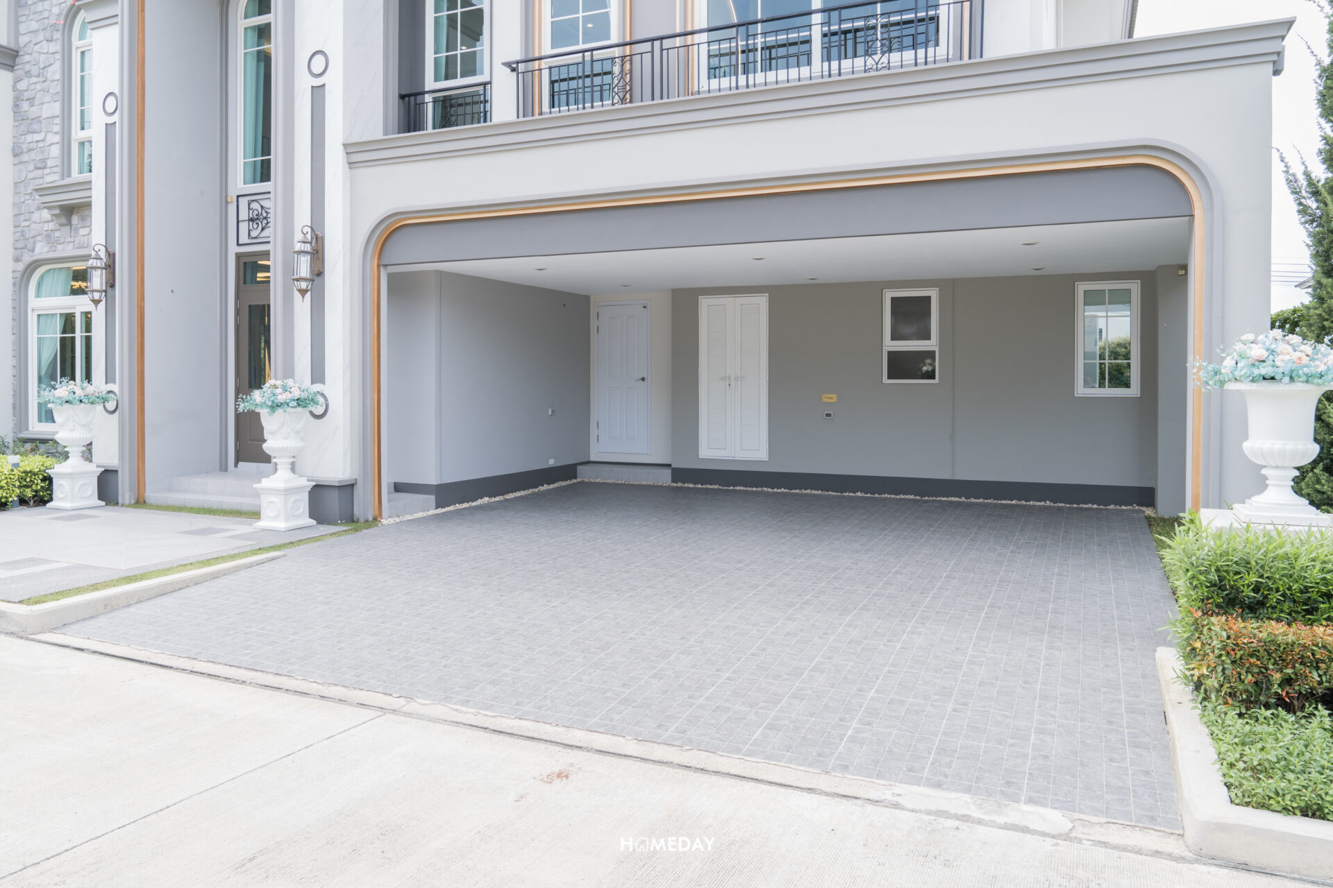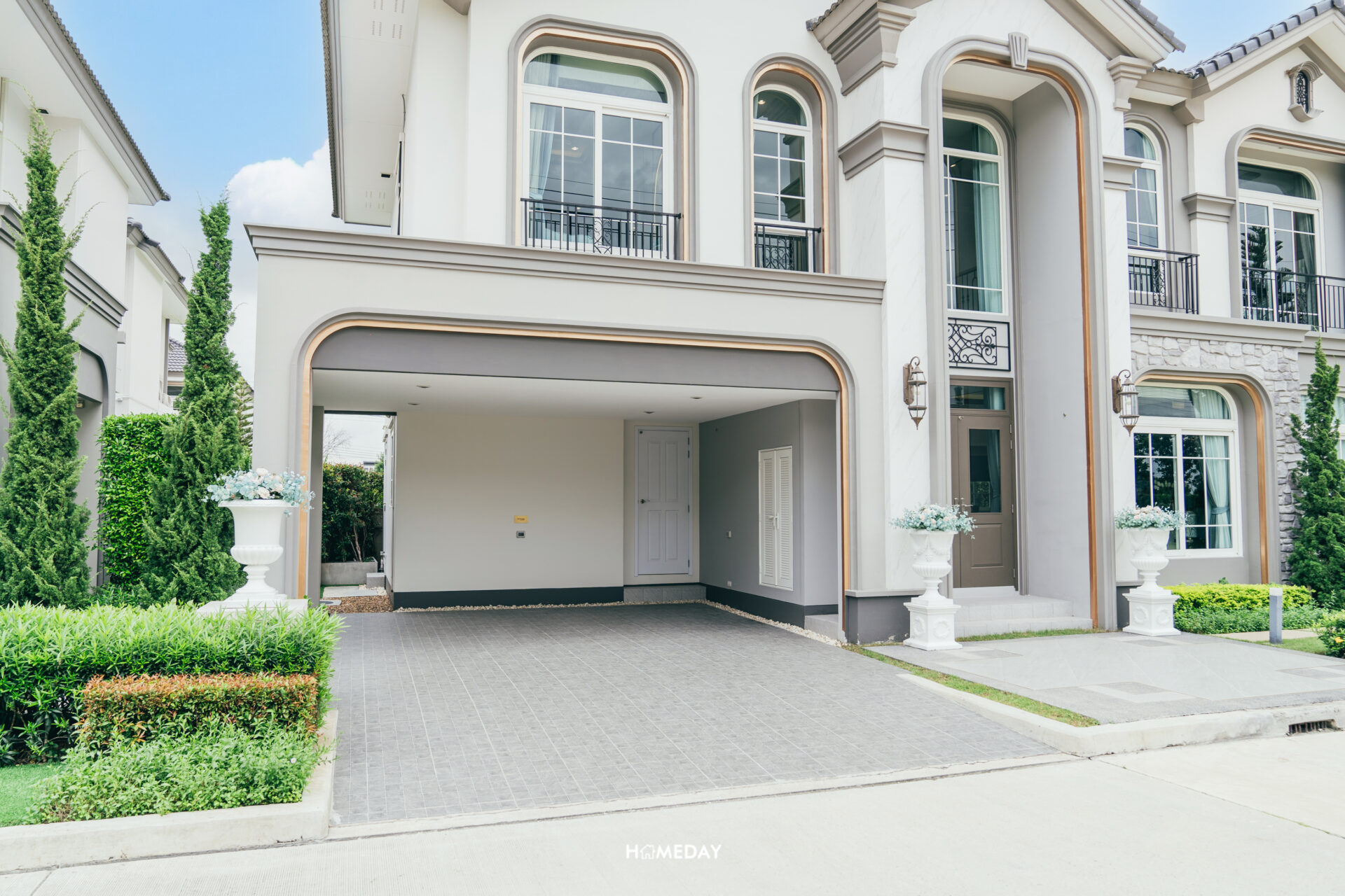 อีกหนึ่งแบบบ้านไทป์ใหญ่ Avila ขนาด 320 ตารางเมตร ตัว Facade ของบ้านยังคงเป็นสถาปัตยกรรมสไตล์ Neo Art Deco อีกเช่นเคย คงคอนเซ็ปต์งานดีไซน์ทั้งการกรุหินที่ผนังด้านหน้า ผสมผสานเข้ากับโทนสีโดยรวมของบ้านอย่างสีขาวและเทาได้อย่างลงตัว รวมไปถึงมีการตัดขอบเส้นสายเพิ่มดีเทลด้วยสีทอง ดูสง่างาม สมฐานะ มาพร้อมระบบกันขโมยและ Frasers Clean & Cool Air อีกเช่นกัน