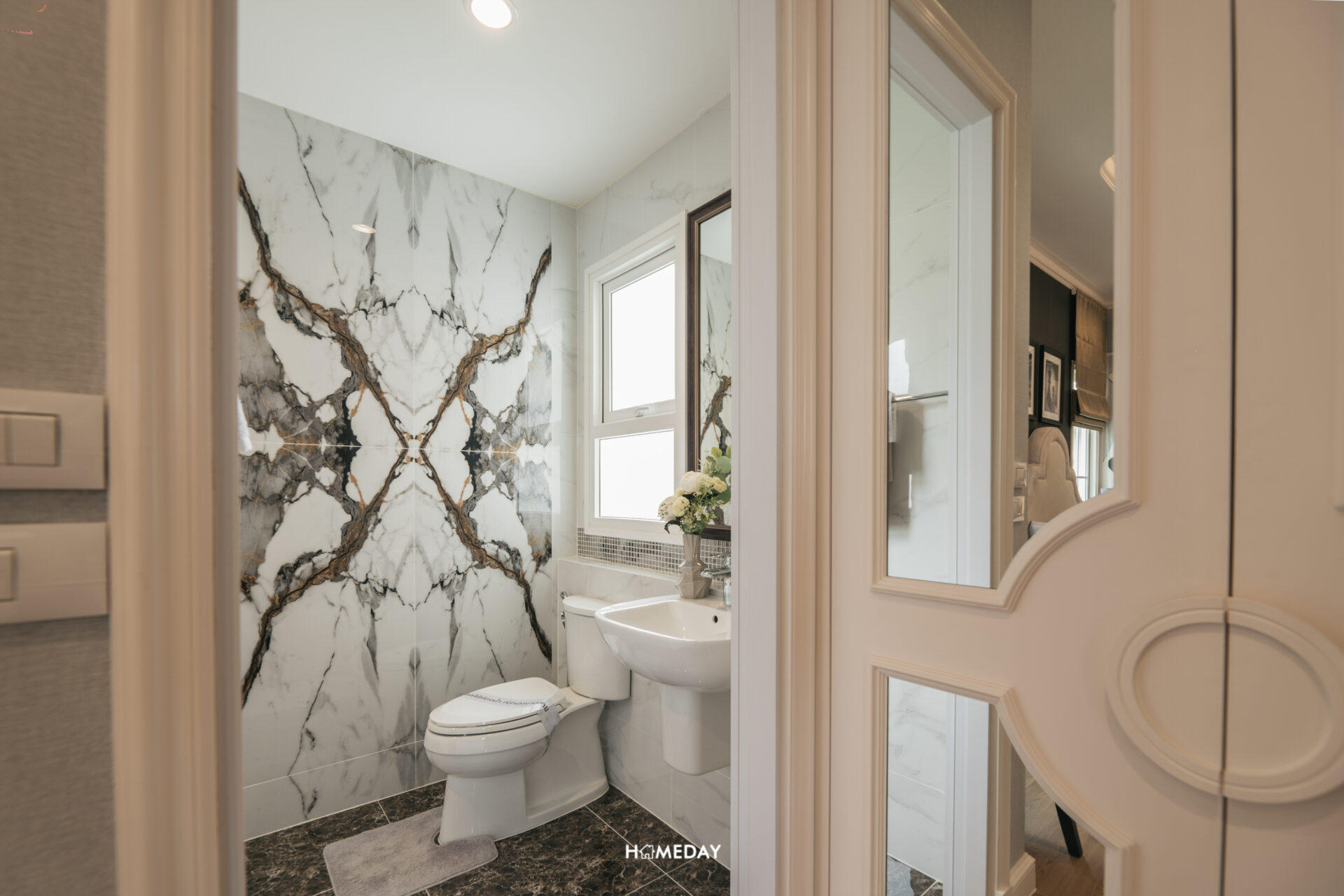 ติดกับห้องครัว จะเป็น Powder Room สำหรับรองรับแขกครับ ด้านในจะมีเฉพาะอ่างล้างหน้าและโถสุขภัณฑ์เท่านั้น ห้องนี้จะเพิ่ม Low Wall ด้านหลังมาให้ สามารถใช้วางขวดสบู่ น้ำหอมปรับอากาศ หรือต้นไม้ประดับตกแต่งได้ครับ