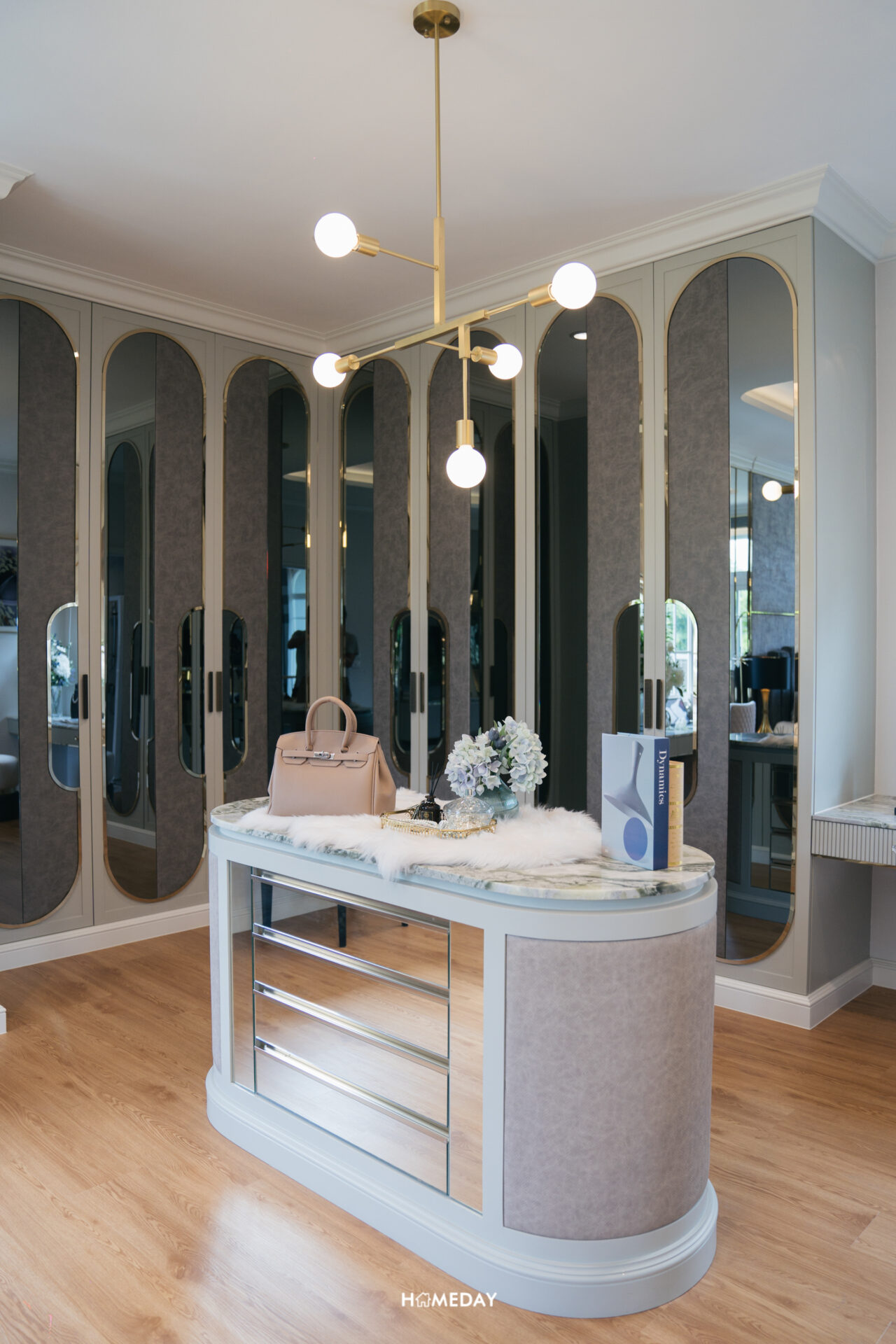 ฝั่งของ Walk-in Closet บิลต์อินโต๊ะเครื่องแป้งมาให้ดูเป็น 2 ชุดแยกกัน สำหรับคุณผู้ชายและคุณผู้หญิง ตู้เสื้อผ้าบิลต์อินมาแบบเข้ามุมเต็มความสูงของห้อง ได้พื้นที่จัดเก็บเพียงพอสำหรับ 2 ท่าน ซึ่งเราก็สามารถนำไอเดียในการตกแต่งของบ้านตัวอย่างไปปรับใช้กับบ้านจริงของเราได้เลยครับ