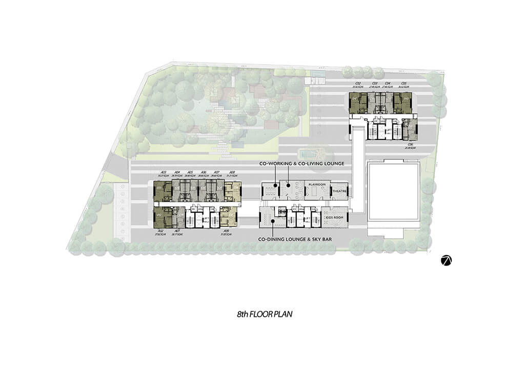Lobby, Mail Room, Smart Locker, Meeting Room, Lap Pool Sky View, Rooftop Blue Jacuzzi, Panoramic Observation Deck, Co-Working & Co Living Lounge, Co-Dining & Sky Bar, Kids Room, Play Room, Theatre,