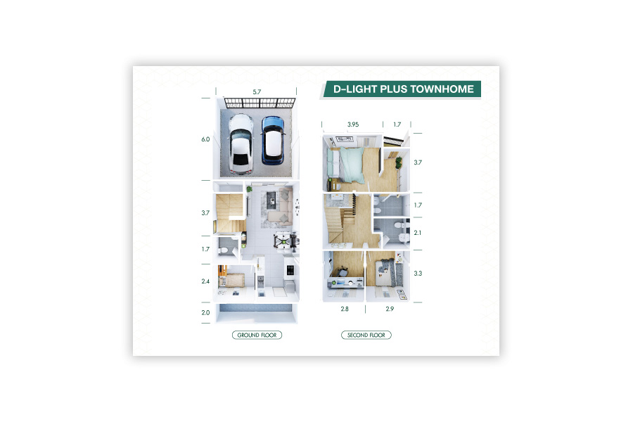 แบบบ้าน : D-LIGHT PLUS แบบบ้าน : ทาวน์โฮม หน้ากว้าง 5.7 เมตร ลึก 10.8 เมตรขนาดที่ดิน : 22.8 ตารางวาพื้นที่ใช้สอย : 135.65 ตารางเมตร