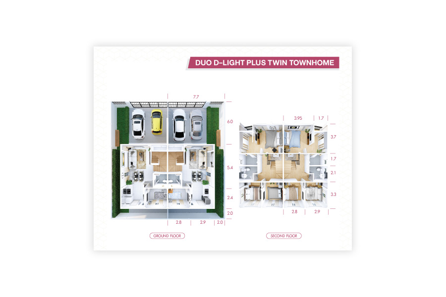 แบบบ้าน : DUO D-LIGHT PLUS แบบบ้าน : ทาวน์โฮมแฝด หน้ากว้าง 5.7 เมตร ลึก 10.8 เมตรขนาดที่ดิน : 30.8 ตารางวาพื้นที่ใช้สอย : 135.65 ตารางเมตร