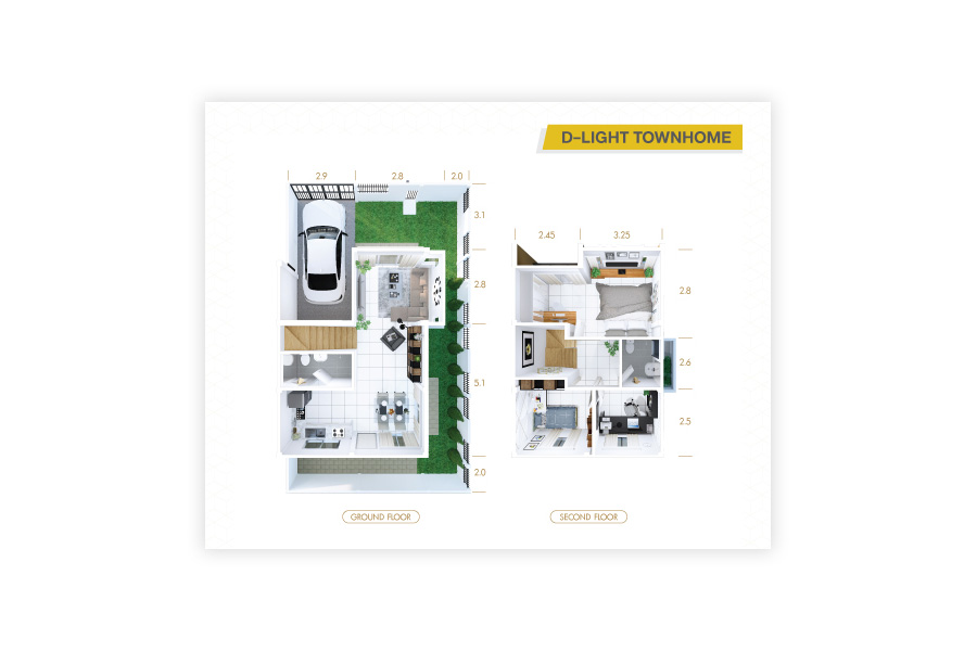 แบบบ้าน : D-LIGHT แบบบ้าน : ทาวน์โฮม หน้ากว้าง 5.7 เมตร ลึก 7.9 เมตรขนาดที่ดิน : 18.5 ตารางวาพื้นที่ใช้สอย : 110 ตารางเมตร
