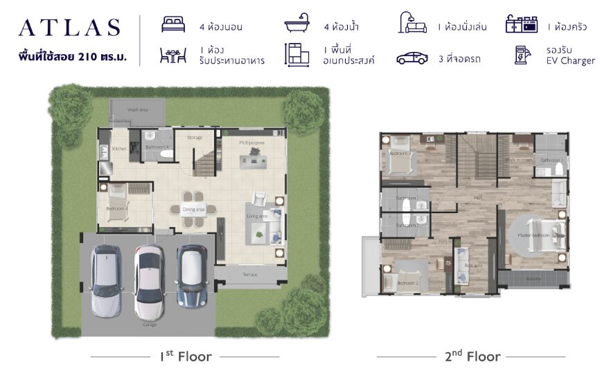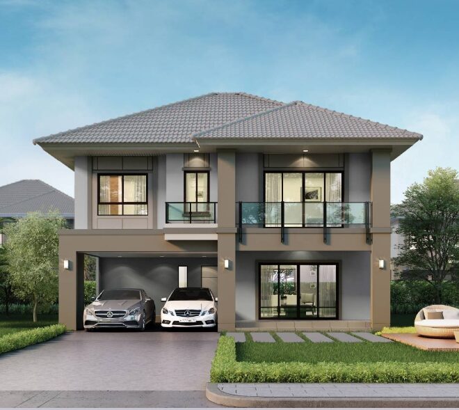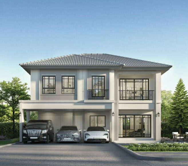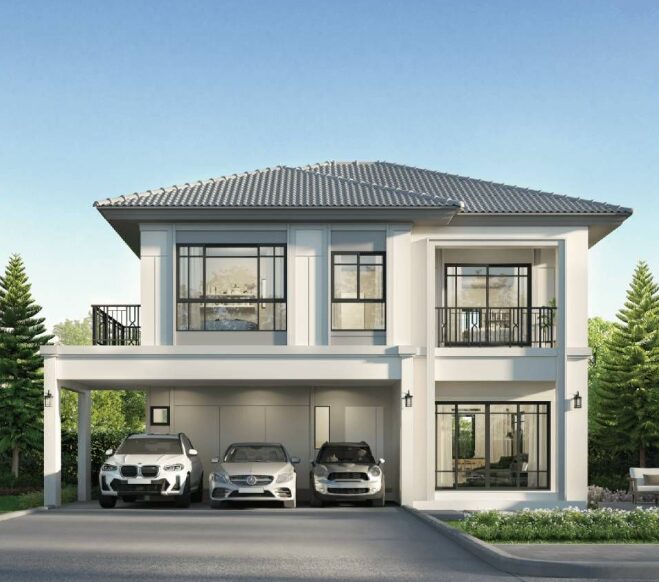 พื้นที่ใช้สอย 210 ตร.ม. ที่ดินเริ่มต้น 50 ตร.วา 4 ห้องนอน 4 ห้องน้ำ 1 ห้องนั่งเล่น 3 ที่จอดรถ