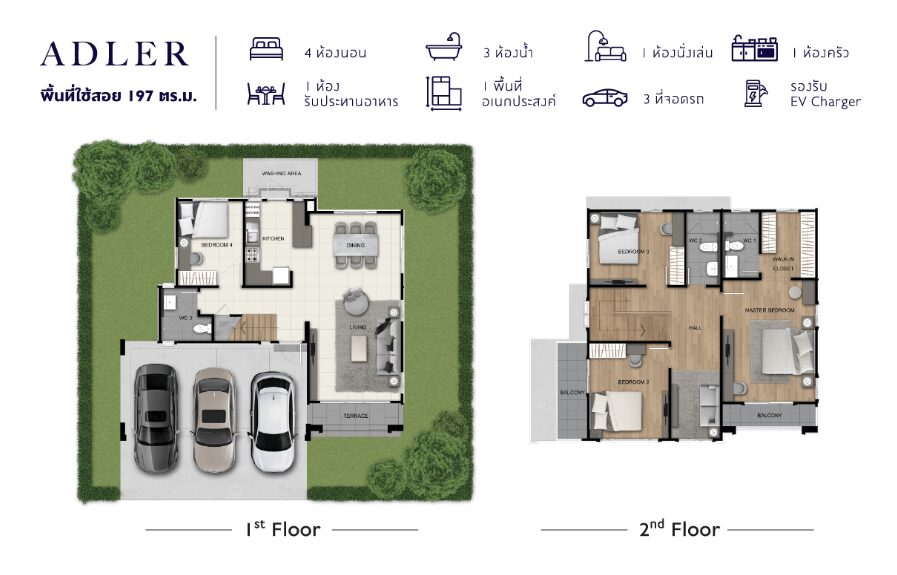 พื้นที่ใช้สอย 197 ตร.ม. ที่ดินเริ่มต้น 50 ตร.วา 4 ห้องนอน 3 ห้องน้ำ 1 ห้องนั่งเล่น 3 ที่จอดรถ