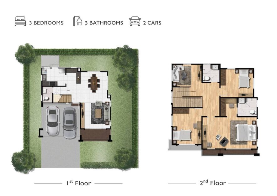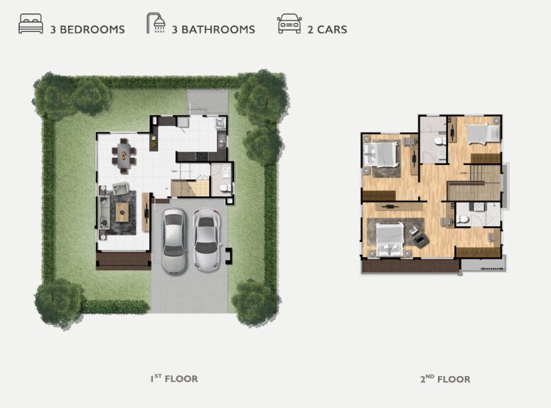 พื้นที่ใช้สอย 179 ตร.ม. ที่ดินเริ่มต้น 55 ตร.ว. 3 ห้องนอน 3 ห้องน้ำ 2 ที่จอดรถ