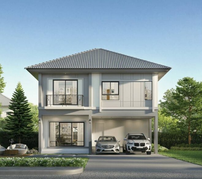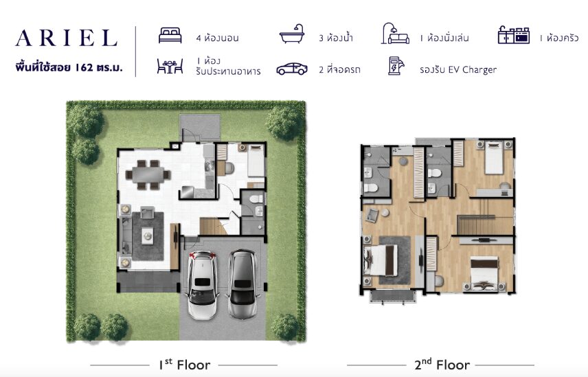 พื้นที่ใช้สอย 162 ตร.ม. ที่ดินเริ่มต้น 50 ตร.ว. 4 ห้องนอน 3 ห้องน้ำ 1 ห้องนั่งเล่น 2 ที่จอดรถ