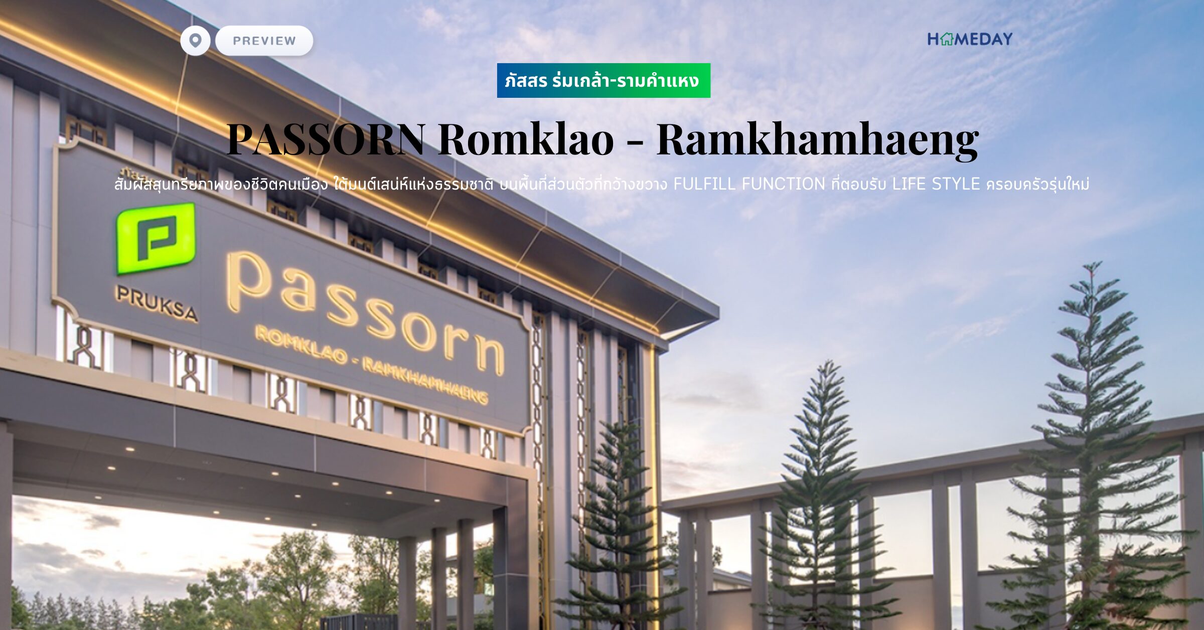 "โครงการ ภัสสร ร่มเกล้า-รามคำแหง (PASSORN Romklao – Ramkhamhaeng) สัมผัสสุนทรียภาพของชีวิตคนเมือง ใต้มนต์เสน่ห์แห่งธรรมชาติ โดดเด่นด้วยเอกลักษณ์ MODERN HERITAGE LUXURY บนพื้นที่ส่วนตัวที่กว้างขวาง FULFILL FUNCTION ที่ตอบรับ LIFE STYLE ครอบครัวรุ่นใหม่"