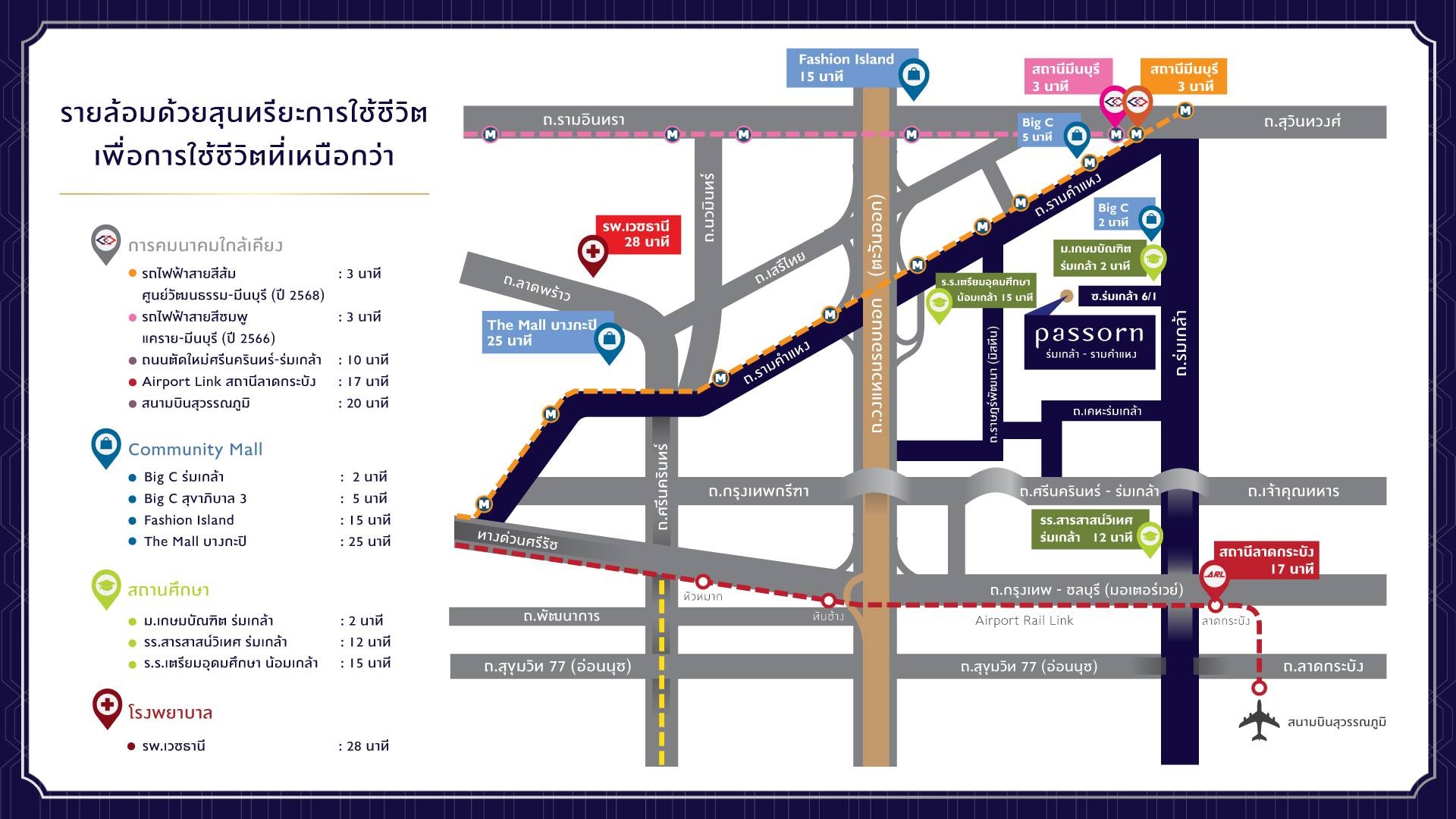 รถไฟฟ้าสายสีส้ม สถานีมีนบุรี 3 กม.รถไฟฟ้าสายสีชมพู สถานีมีนบุรี 3 กม.ถนนตัดใหม่ ศรีนครินทร์-ร่มเกล้า 5 กม.AIRPORT LINK สถานีลาดกระบัง 10 กม
