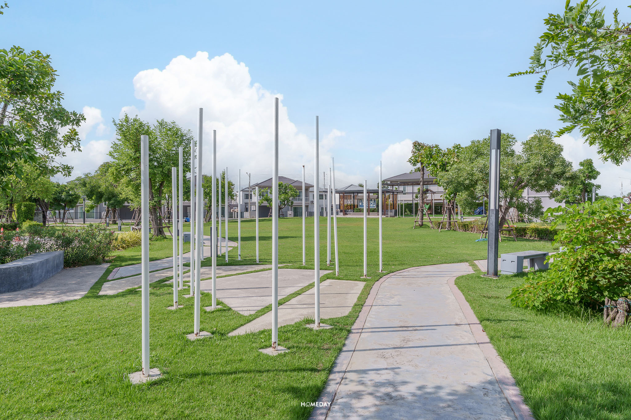 ทางโครงการออกแบบเป็นสวนสไตล์แลนด์สเคปในรูปแบบ Park & Play มีการตกแต่งด้วยเส้นสายจุดนำสายตาและซุ้มทางเดินรูปทรงสี่เหลี่ยม พร้อมที่นั่งพักไว้หลบแดดตามจุดต่าง ๆ มีทางเดิน Jogging Track รอบสวนและลานสนามหญ้าโล่งกว้างเพื่อให้ลูกบ้านได้ใช้งานอย่างสบาย ๆ
