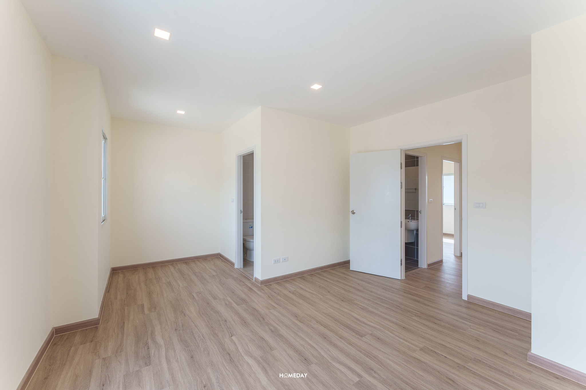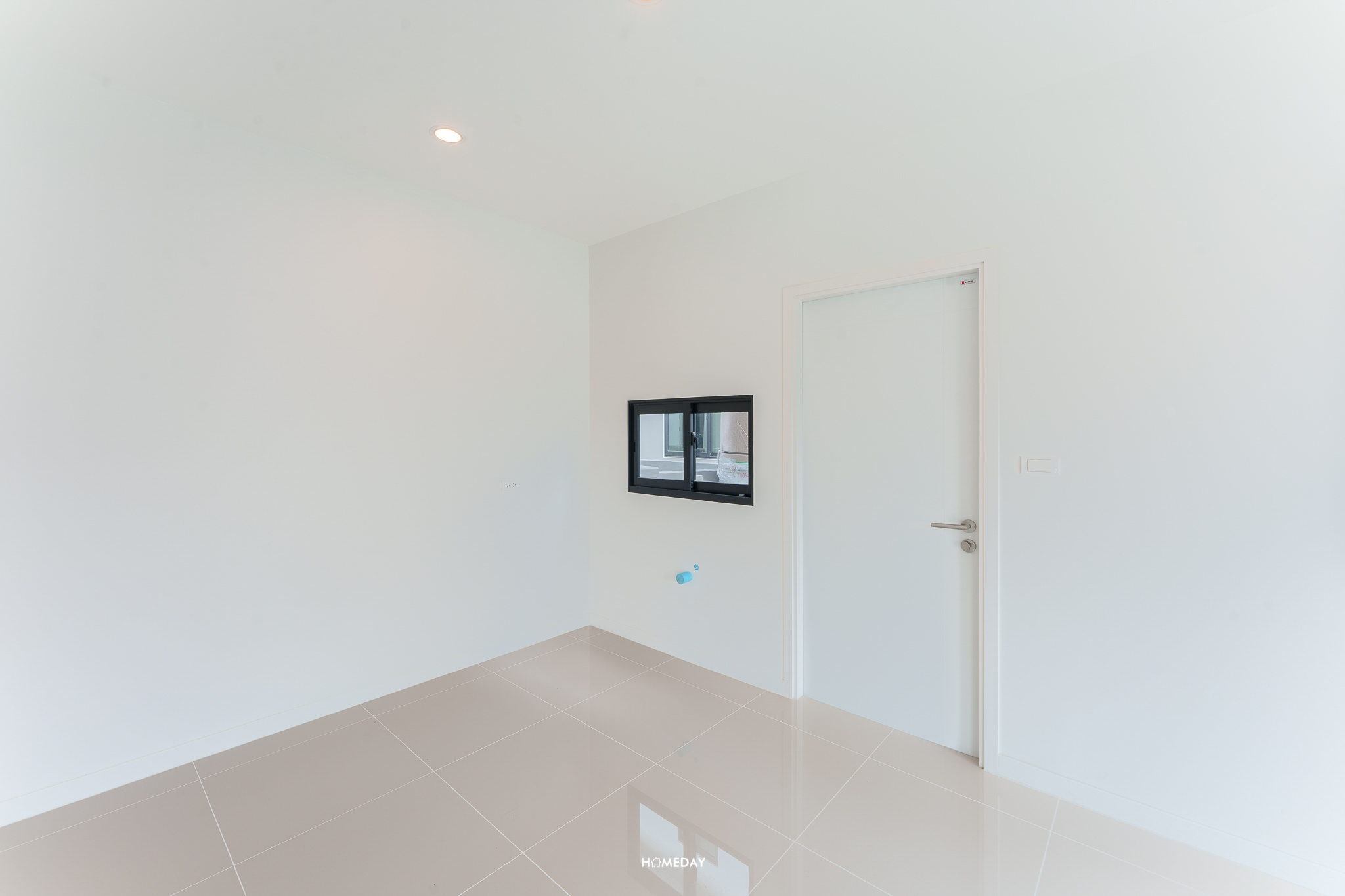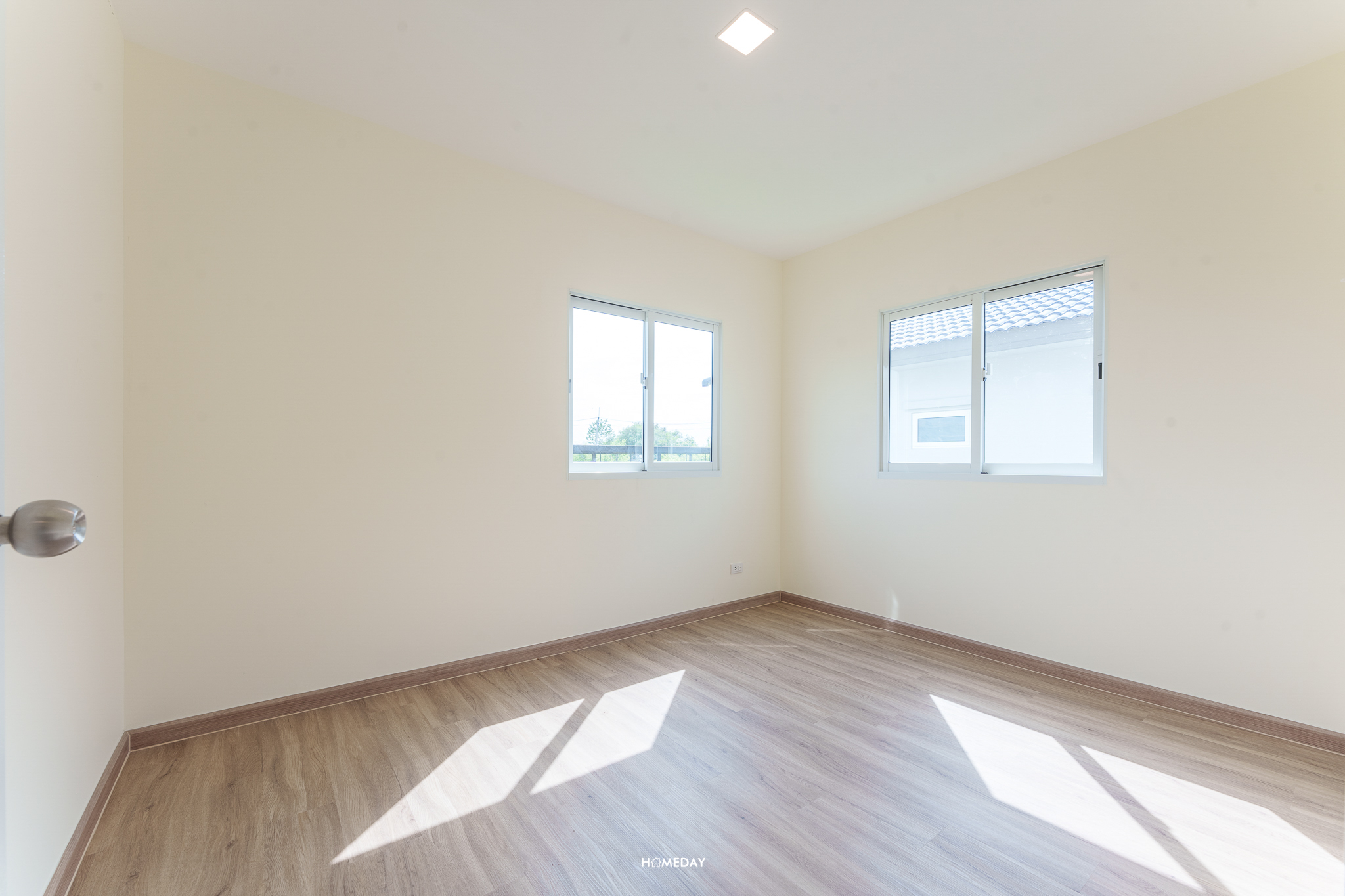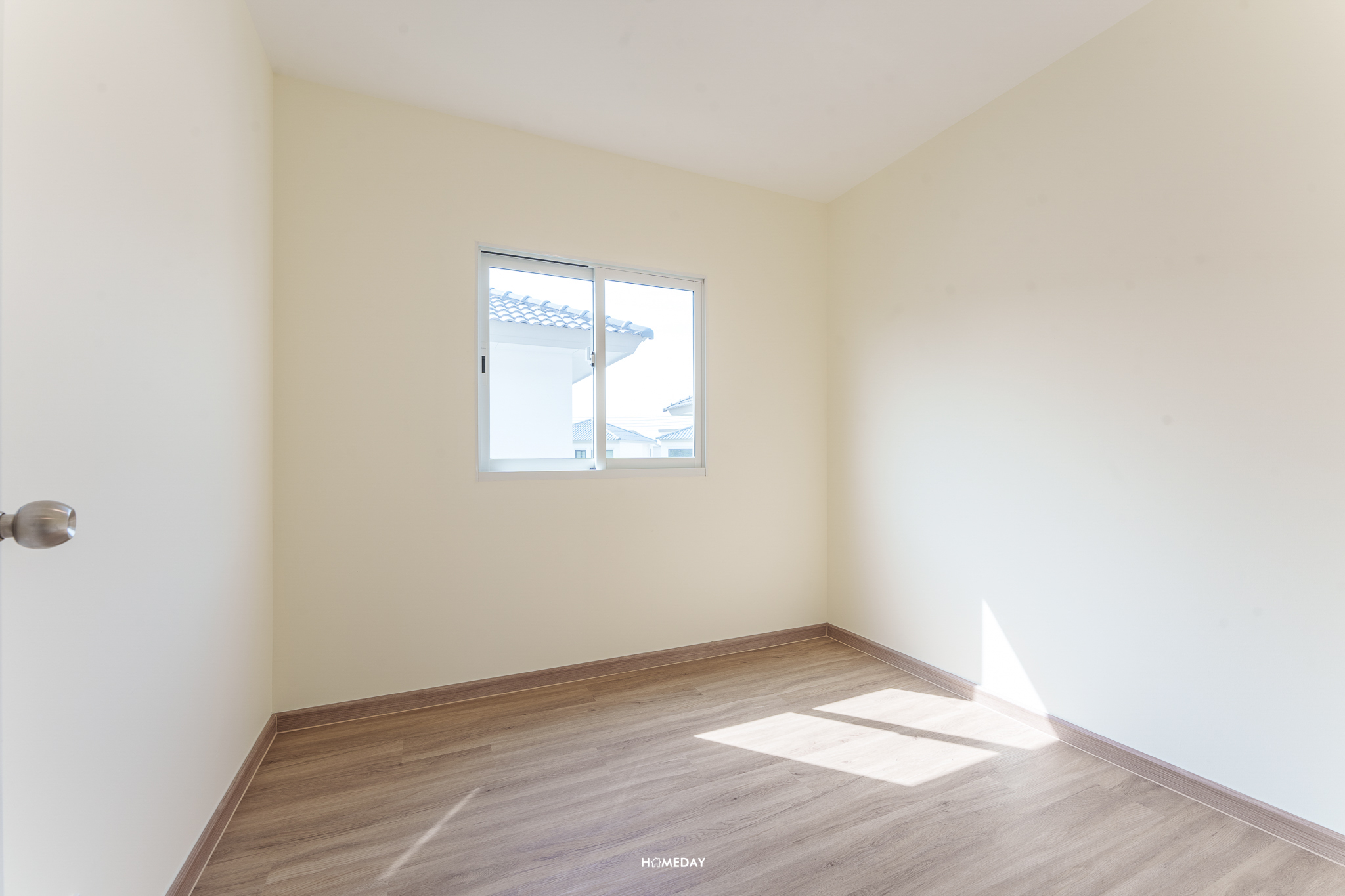 ในส่วนของห้องนอน Bedroom 2 และ Bedroom 3 จะมาในไซซ์ที่เท่ากันทุกประการเลยครับ ตัวห้องจะอยู่ติดกัน อยู่ฝั่งด้านหลังของตัวบ้าน ภายในรองรับเตียงขนาด 3.5 ฟุตได้ลงตัว พื้นที่รอบเตียงสามารถวางได้ทั้งโต๊ะหัวเตียง, ตู้เสื้อผ้า, โต๊ะเครื่องแป้ง และชั้นวางทีวี ใช้งานฟังก์ชันพื้นฐานได้ครบแน่นอนครับ สำหรับครอบครัวที่มีลูก ๆ ก็สามารถให้เด็ก ๆ ได้มีพื้นที่ส่วนตัวเป็นของตัวเองได้เลยครับ