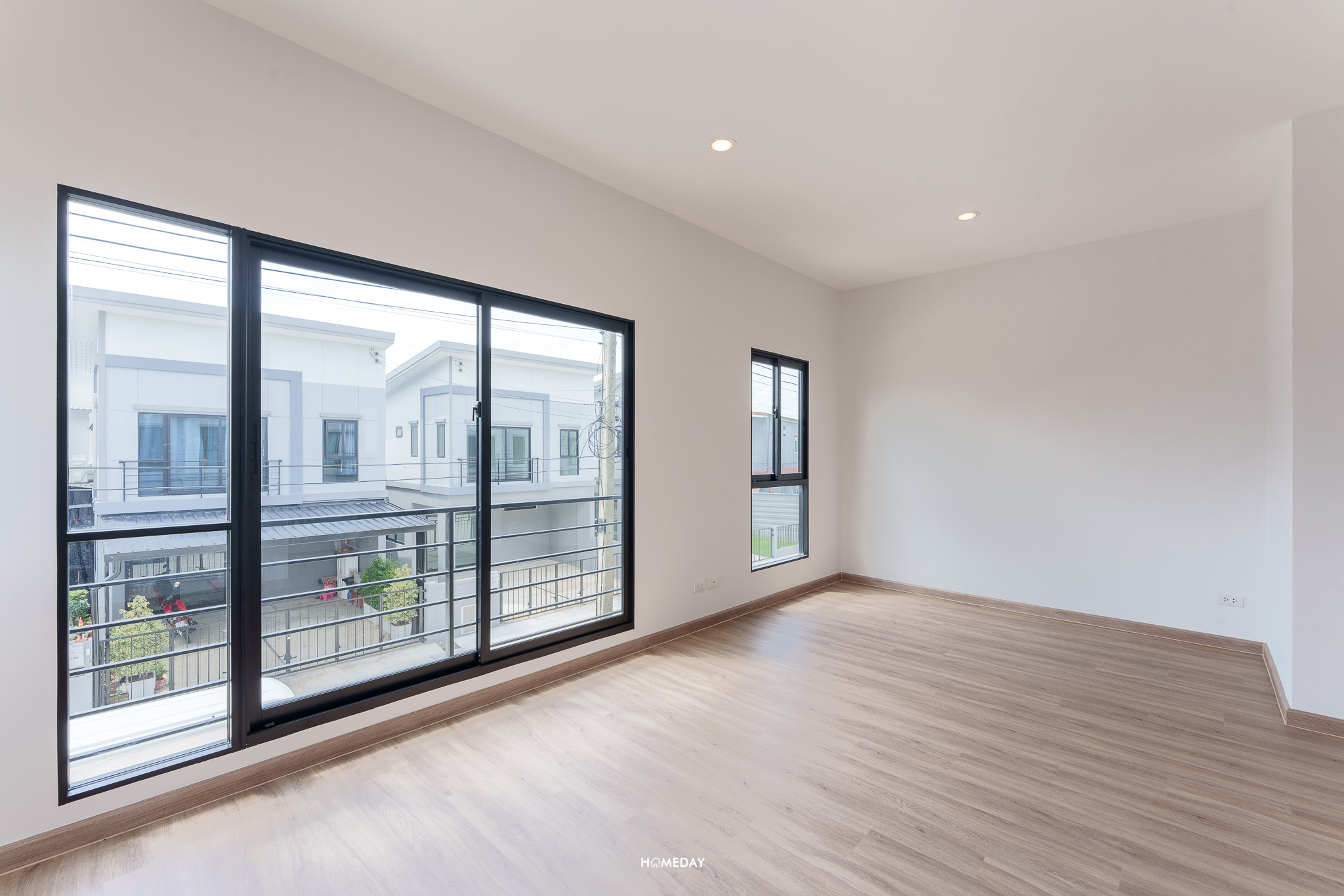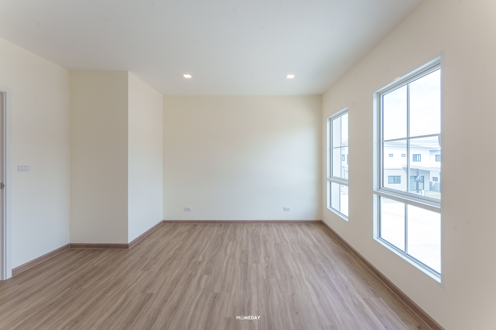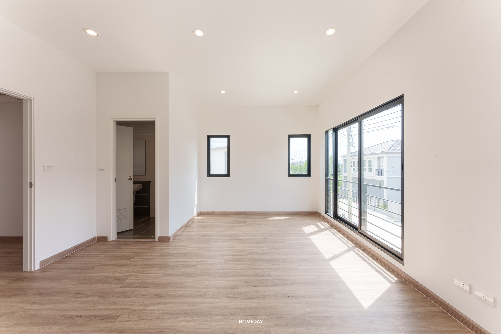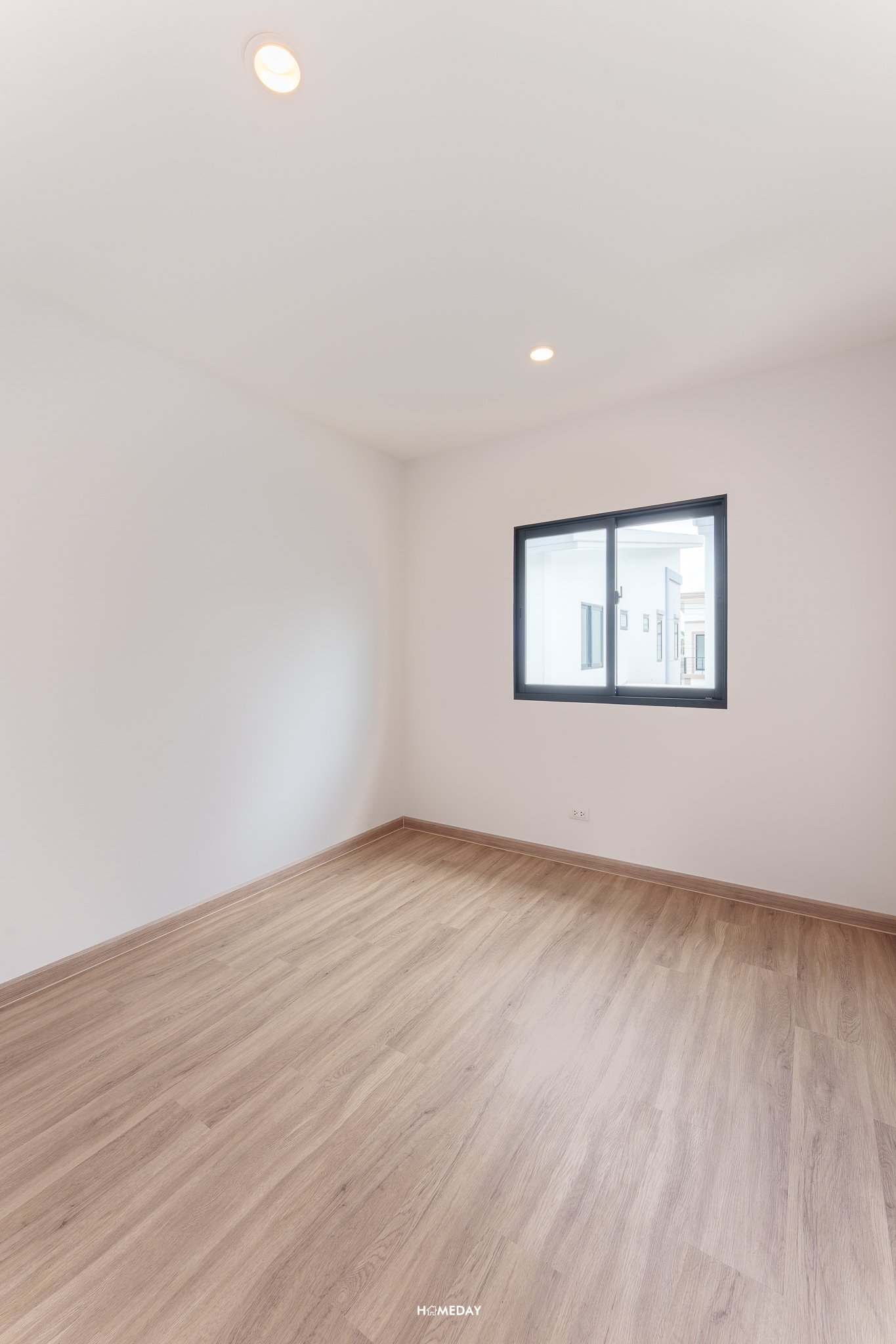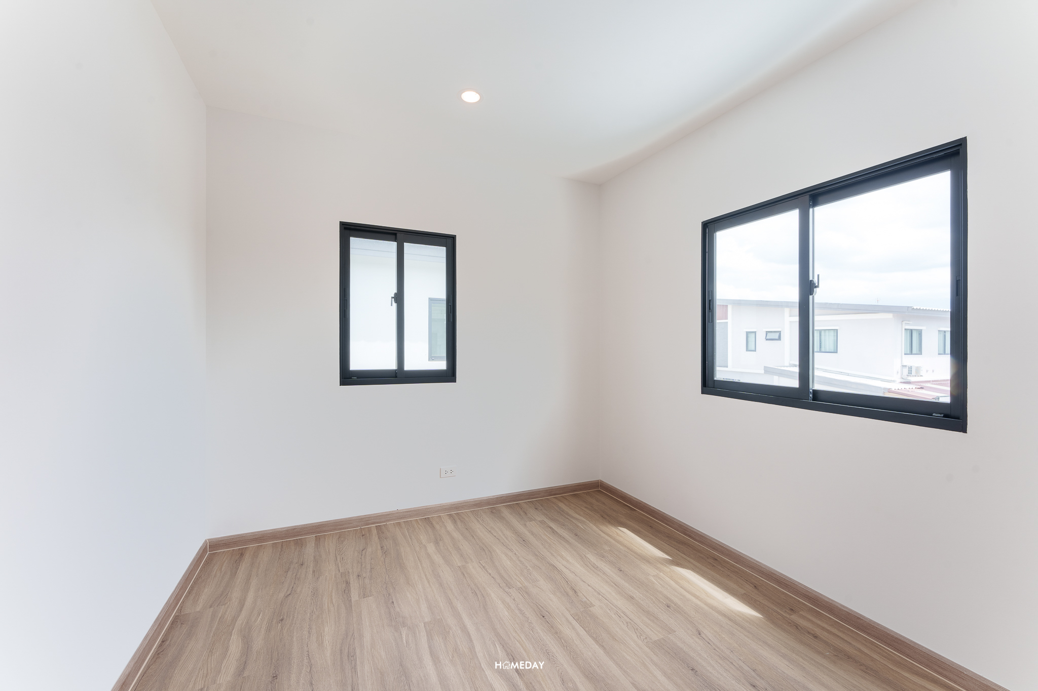 ไปต่อกันที่ Bedroom 2 ที่อยู่ตรงข้ามกับบันไดทางขึ้นชั้น 2 ครับ เป็นห้องนอนขนาดรอง ที่ได้พื้นที่ใช้สอยภายในที่ใส่ฟังก์ชันได้ครบครัน ขนาดพื้นที่ภายในรองรับเตียงขนาด 3.5-5 ฟุตได้ครับ พร้อมหน้าต่างบานสไลด์มาให้ 2 บาน ทำให้ห้องดูโปร่งโล่งยิ่งขึ้น พื้นที่รอบเตียงเหลือให้สามารถใส่ตู้เสื้อผ้าขนาดใหญ่, โต๊ะเครื่องแป้ง และชั้นวางทีวีได้ครับ