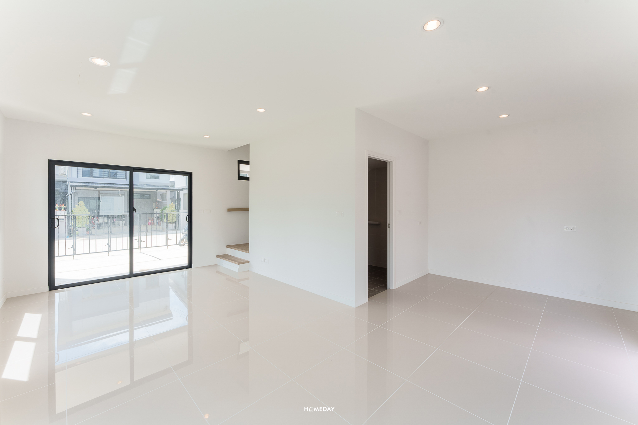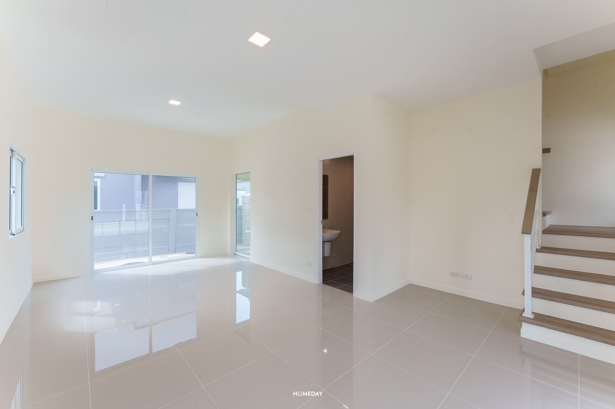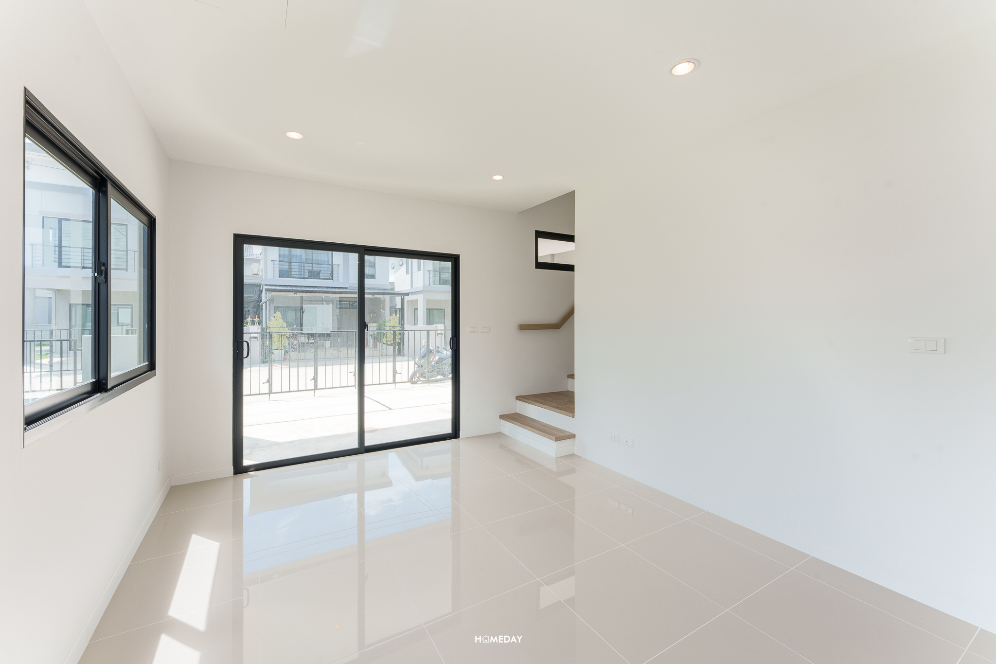 เริ่มต้นจากพื้นที่ชั้น 1 กันก่อนเลย ประตูทางเข้าหลักได้เป็นแบบประตูกระจกบานสไลด์เช่นเดียวกันครับ แปลนภายในถือว่ามีความใกล้เคียงกันกับแบบบ้านแฝด Viller Trends เลยครับ เปิดเข้ามาเราก็จะเจอกับพื้นที่ Open Plan ก่อนเลย บันไดทางขึ้นชั้น 2 อยู่ติดประตูทางเข้าเช่นเดียวกันครับ