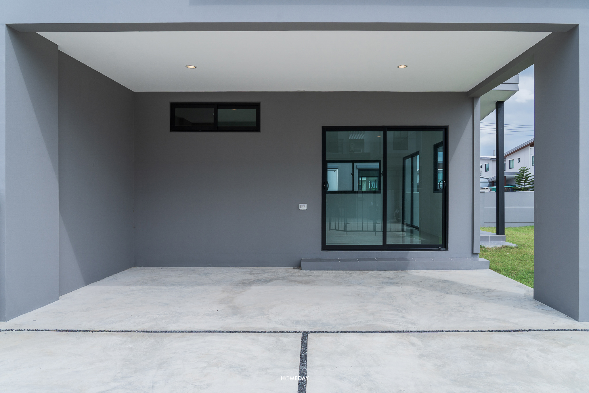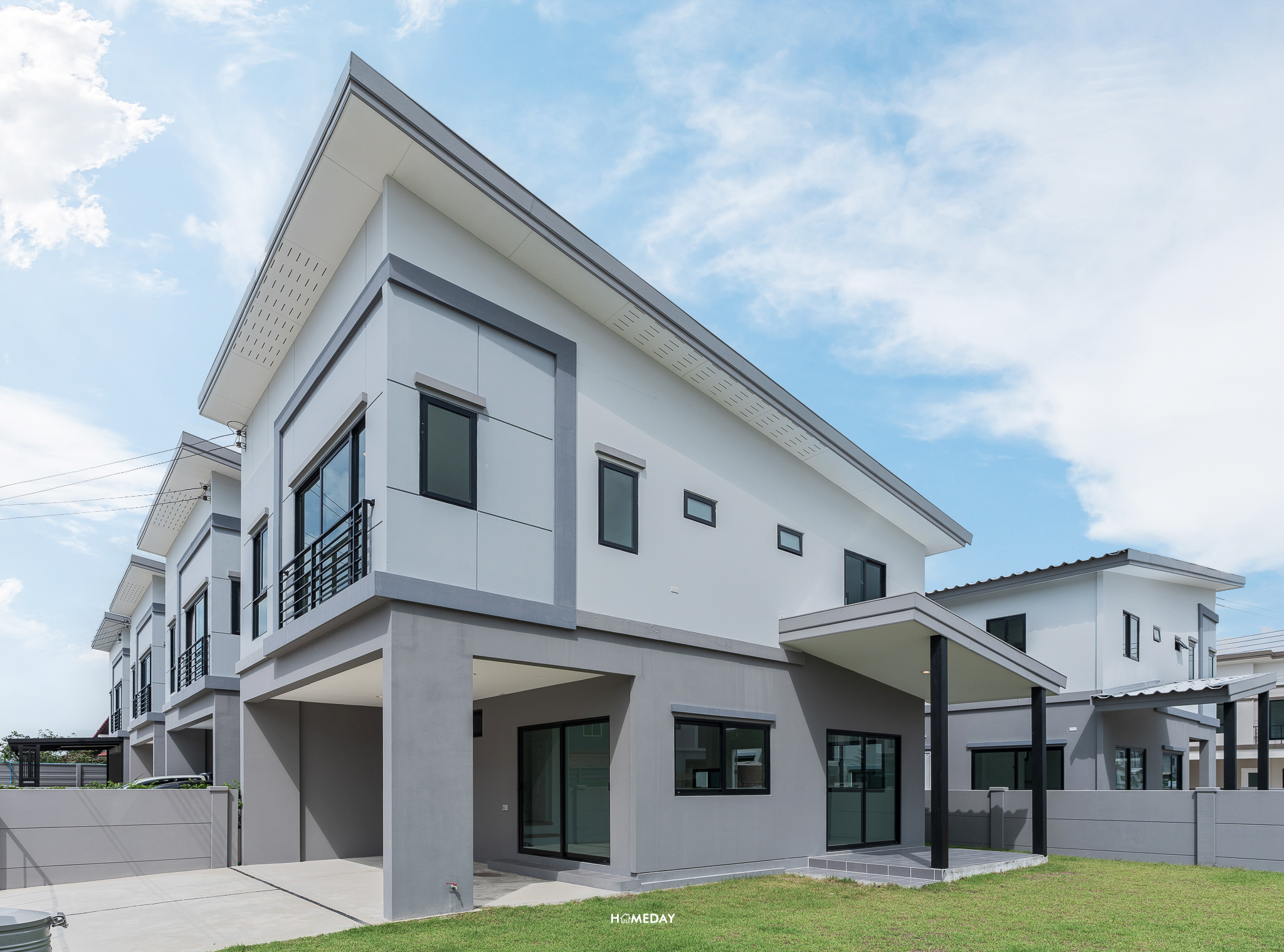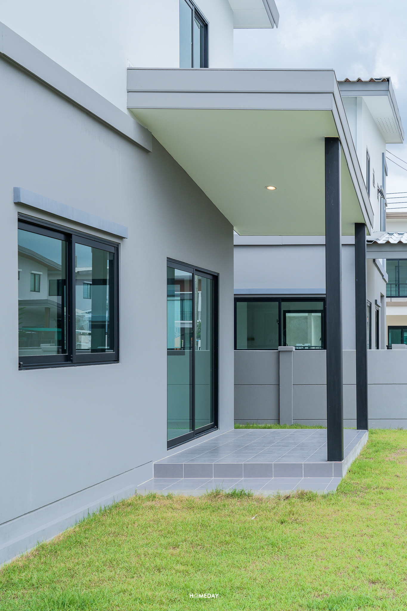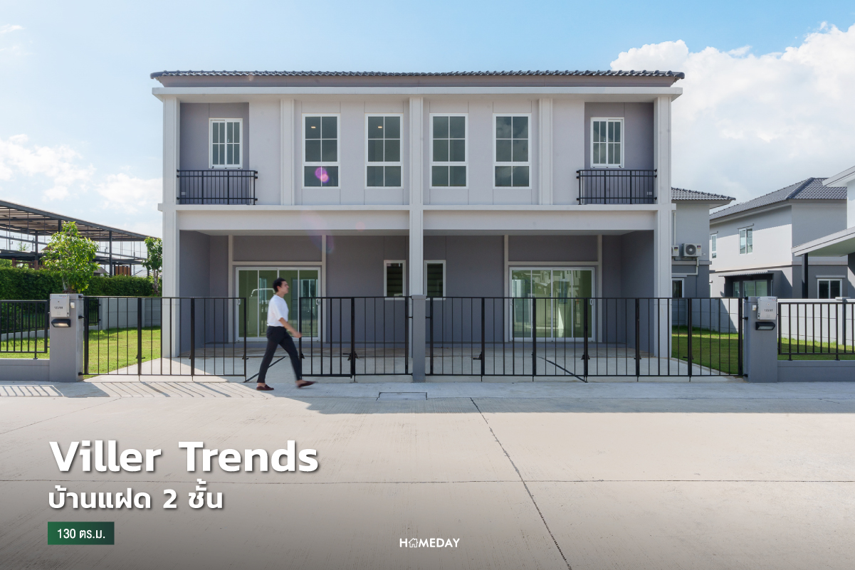 บ้านหลังแรกที่เราพามาชมกันในวันนี้ จะเป็นแบบบ้านมาตรฐานหรือบ้านเปล่าที่พร้อมส่งมอบให้กับลูกบ้านเลยครับ เป็นแบบบ้านแฝดที่มีขนาดใหญ่ที่สุดของทางโครงการ มีชื่อแบบบ้านว่า Viller Trends ฟังก์ชันครบแบบ 3 ห้องนอน, 3 ห้องน้ำ และจอดรถได้ 2 คัน บริเวณที่จอดรถจะเป็นพื้นคอนกรีตปาดเรียบมาให้ และพื้นที่ด้านข้างบ้านที่ได้มาแบบกว้างมากได้อารมณ์บ้านเดี่ยว สามารถจัดสวนขนาดใหญ่ได้สบาย ๆ หรือจะต่อเติมทำเป็น Glass House ไว้ปลูกพืชผักสวนครัวแบบไฮโดรโปนิกส์ก็ทำได้เช่นกัน ซึ่งทางโครงการได้ปูหญ้ามาตรฐานไว้ให้ครับ