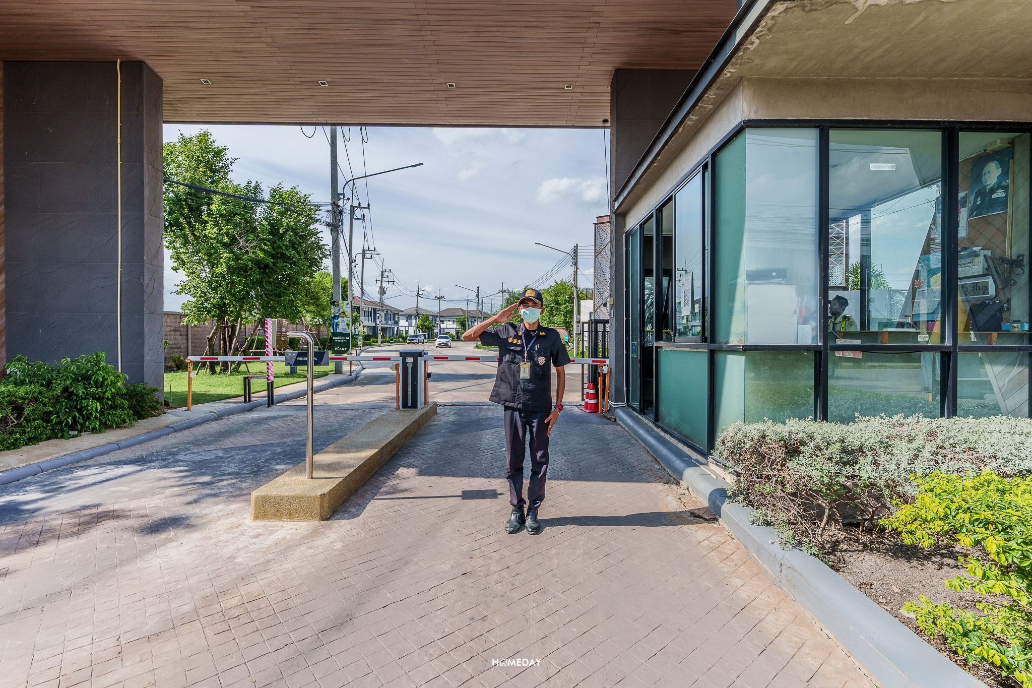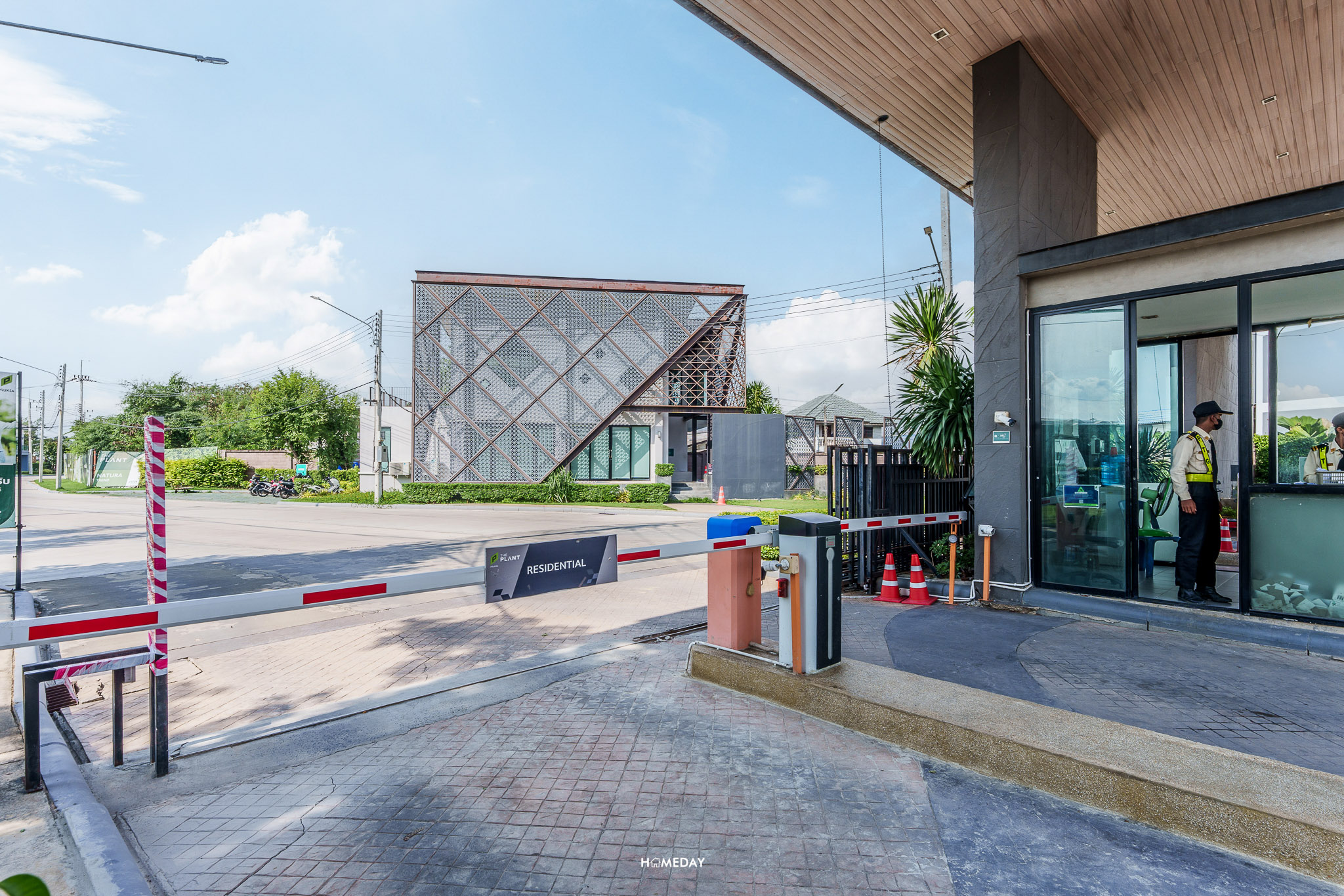 ตรงกลางจะเป็นป้อมรปภ. แบ่งฝั่งทางเข้า-ออก โดยแยกส่วนของ Resident และ Visitor ไว้อย่างชัดเจน ประตูเป็นแบบ Double Gate มีทั้งไม้กระดกกั้นและประตูเหล็กรางเลื่อน โดยที่ Resident จะสามารถผ่านเข้า-ออกโครงการได้ด้วยระบบ Access Card Control และในส่วนของ Visitor จะต้องแลกบัตรกับรปภ. โดยจะมีกล้อง CCTV บริเวณป้อมรปภ. เพื่อบันทึกภาพหน้าคนขับและป้ายทะเบียน